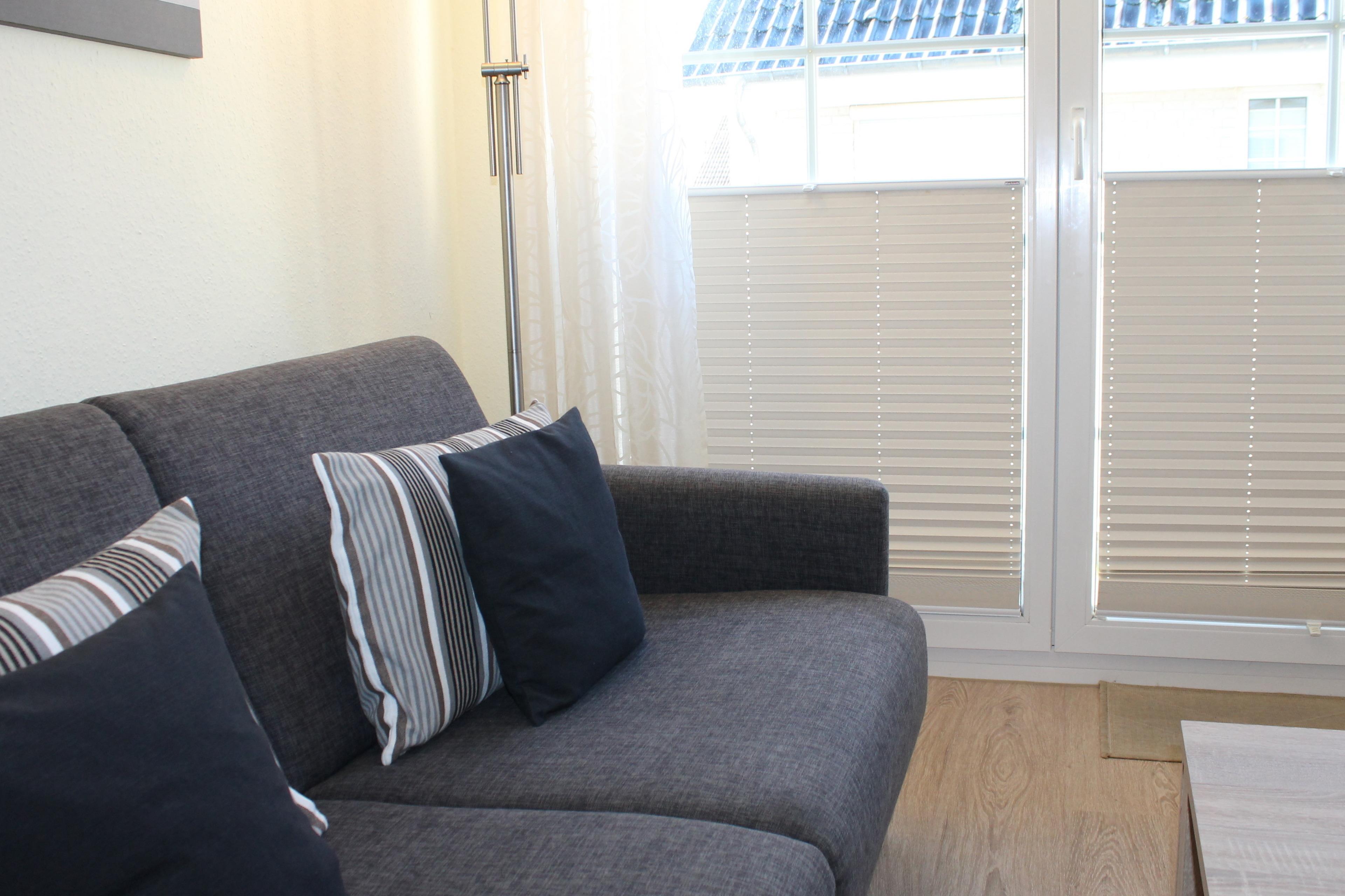 Diese ansprechende Ferienwohnung liegt in der ersten Etage und ist ca. 40 m² groß. Sie besteht aus einem Wohnzimmer mit gemütlicher Couchgarnitur, TV, einem Essplatz sowie einem separaten Doppelschlafzimmer (Betten 90 x 2 m), Flur, einem modernen Duschbad/WC und einem möblierten Balkon, auf dem Sie die Sonne genießen können.