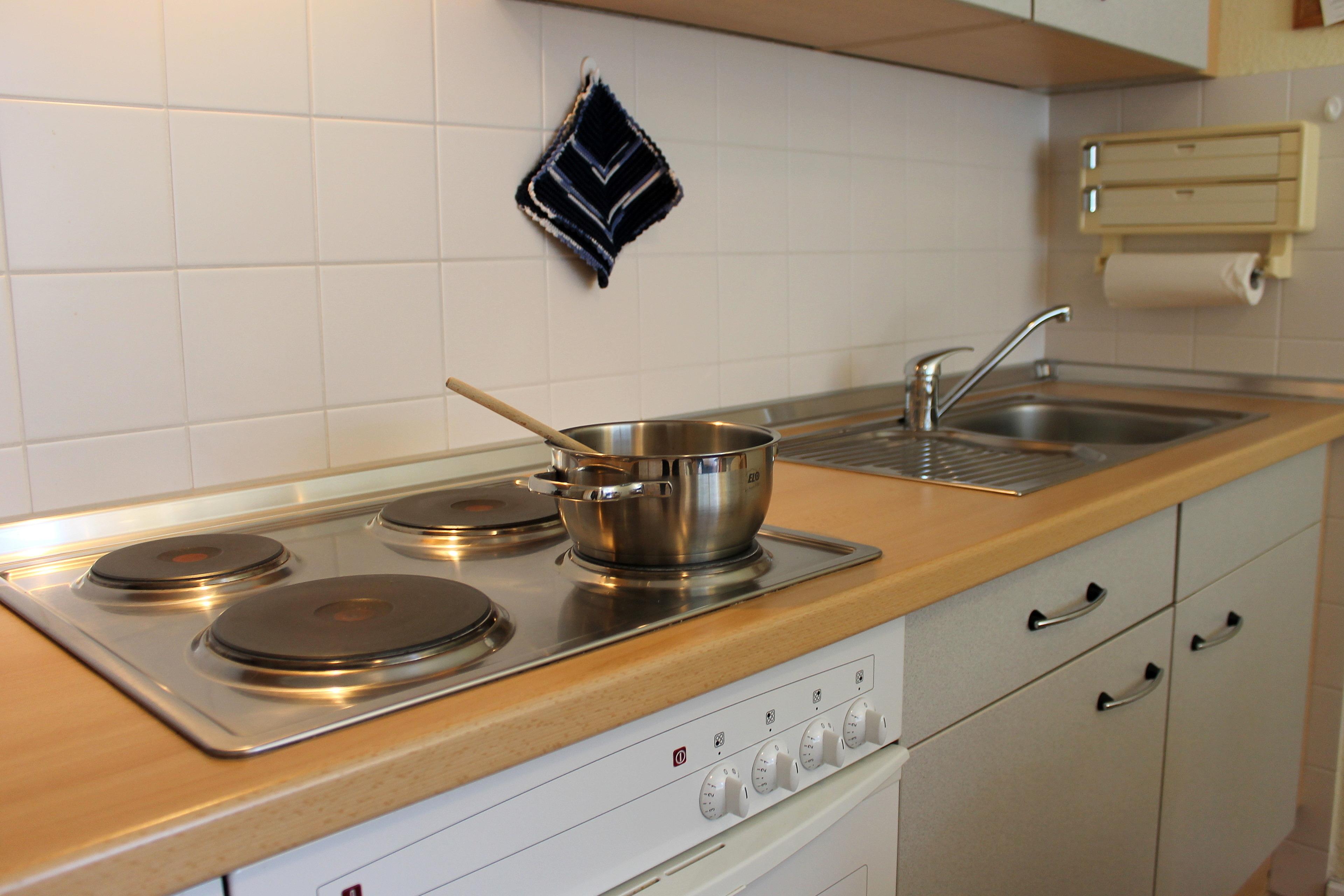 Die Küche ist im Wohnzimmer integriert und mit Backofen, Mikrowelle und den üblichen Kleingeräten ausgestattet.