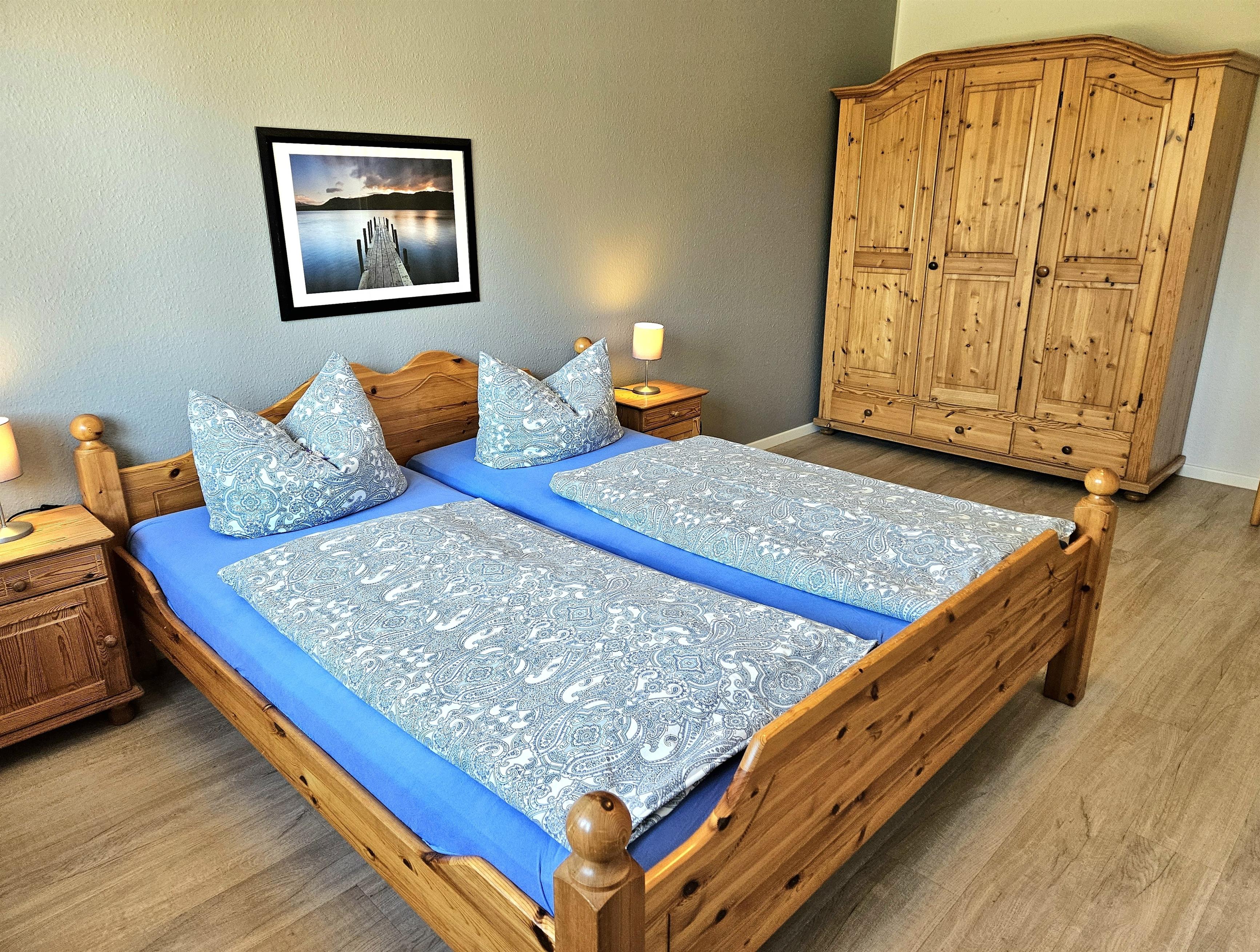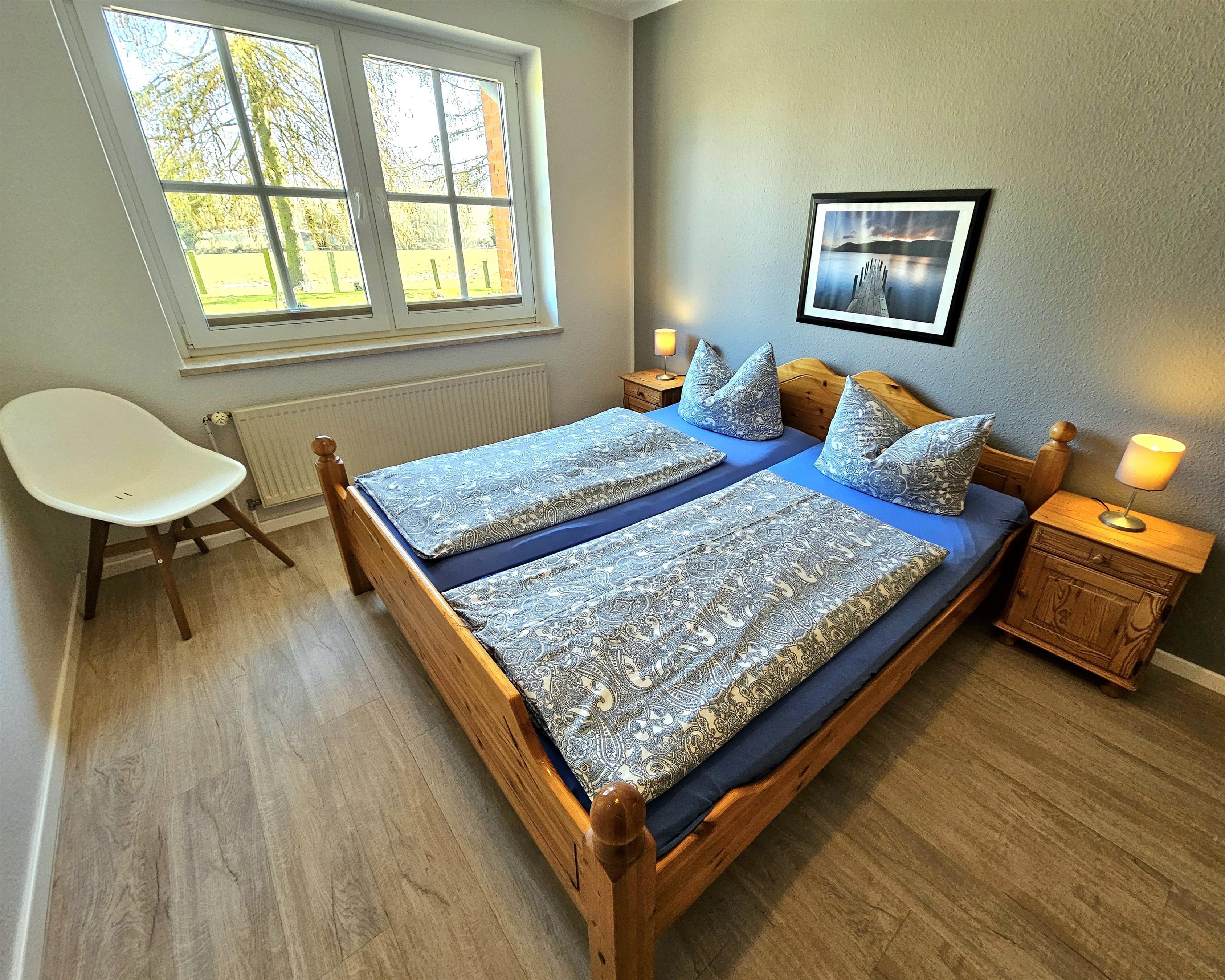Die Wohnung "Nr. 2" auf dem "Grömitzer Pappelhof" liegt im Erdgeschoss und bietet Platz für bis zu 5 Personen. Die Wohnfläche der ca. 80 m² großen Ferienunterkunft verteilt sich auf ein Wohn- / Esszimmer, zwei separate Schlafzimmer, einen Flur, einen kleinen Abstellraum sowie auf eine separate Küche und ein Badezimmer. Das Wohn- / Esszimmer ist mit einer gemütlichen Sitzecke, Flachbild-TV sowie einem Esstisch versehen. Die separate Küche ist u.a. mit Backofen, 4-Plattenherd, Kaffeeemaschine und weiteren Küchengeräten versehen, auch hier befindet sich ein kleiner Essplatz für 2 Personen. Eins der beiden Schlafzimmer ist mit einem Doppelbett (getrennte Matratzen - Maße 0,90 x 2,00 m) und einem großen Kleiderschrank versehen. Das zweite Schlafzimmer verfügt über drei Einzelbetten (0,90 x 2,00 m), einen Schreibtisch sowie einen Kleiderschrank. Das Badezimmer ist mit WC und Dusche versehen. Über den langgezogenen Flur gelangen Sie in alle Räume. Ein Abstellraum ist ebenfalls vorhanden. Vor dem Eingangsbereich der Wohnung befindet sich eine Terrasse sowie der große Garten.