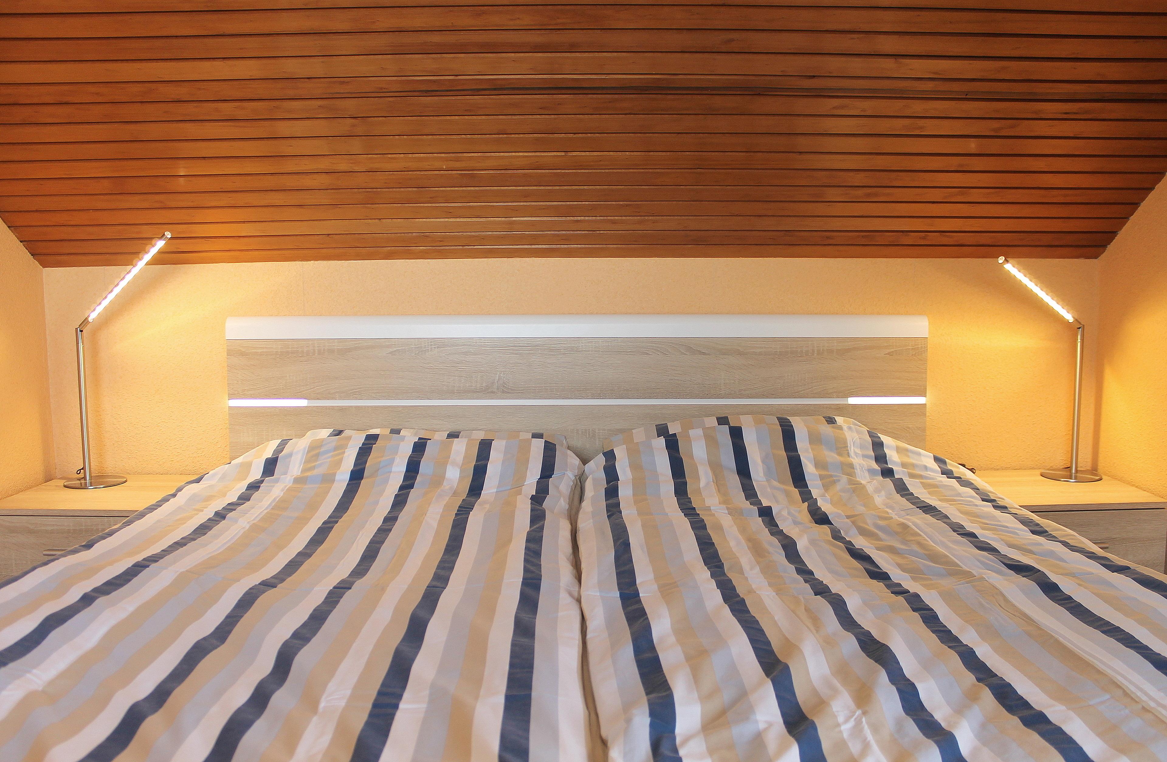 Ein großes Doppelbett 2 m x 1,80 m (2 Matratzen mit 90 cm Breite)und ein weiteres "normales" Bett mit den Maßen 2,00 m x 1,40 m. Die Bettdecken haben die Größe 2 m x 1,35 m. Die Kissen sind 40 x 80 cm groß.