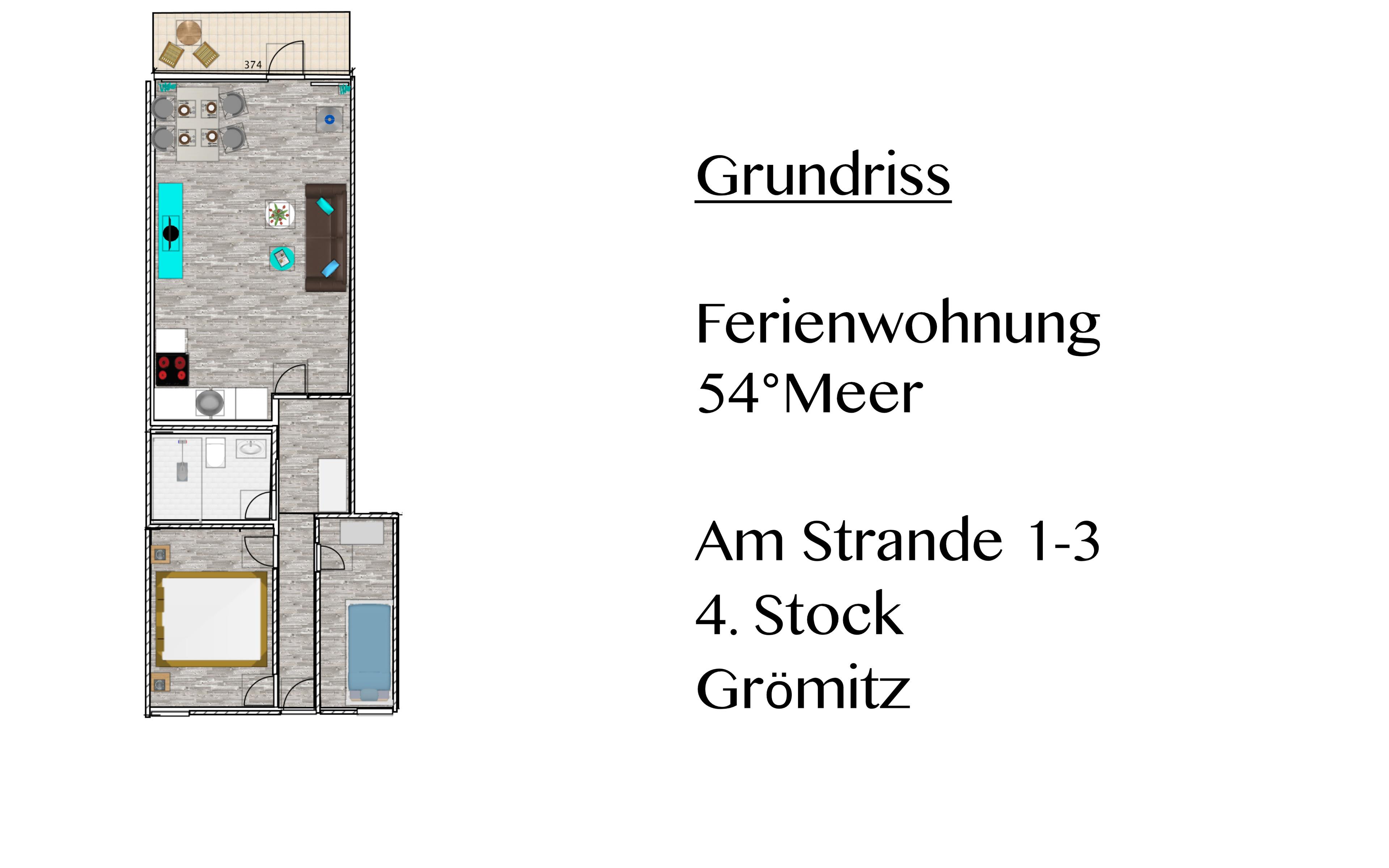 Die Wohnung "54 ° Meer" befindet sich in der 4. Etage im "Grömitz-Center II", sehr zentral gelegen und nur 100 m vom Strand und der Seebrücke entfernt.
