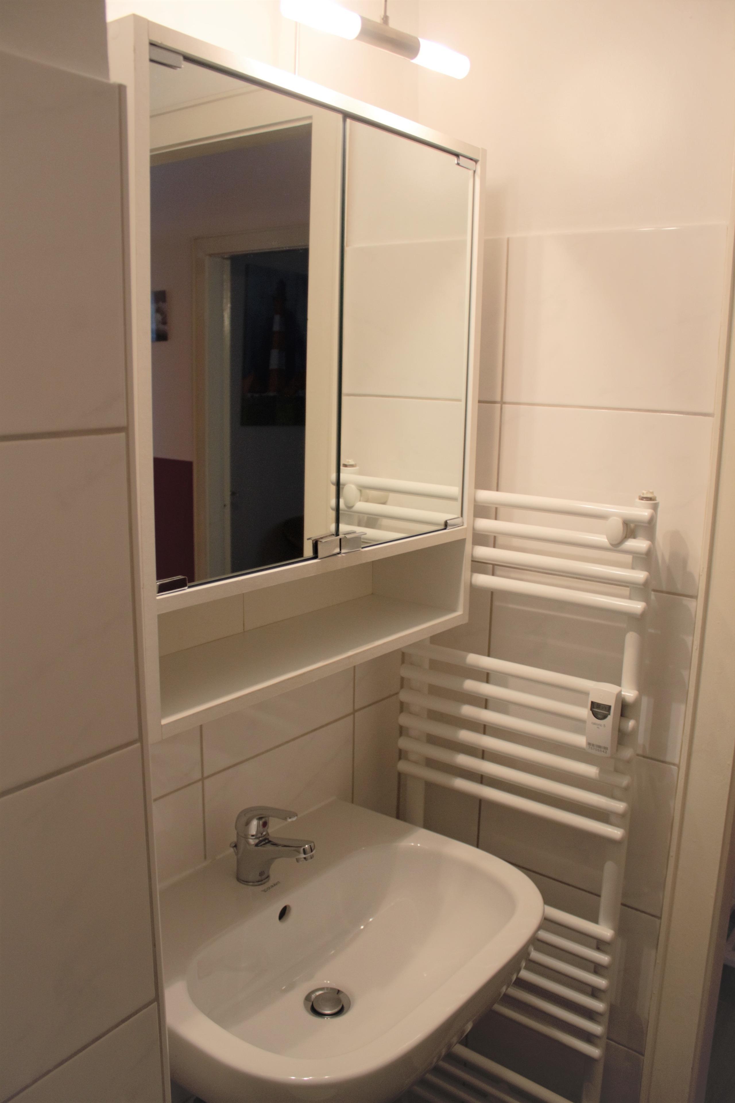 Das Badezimmer verfügt über eine Dusche, WC sowie eine Handtuchheizung.