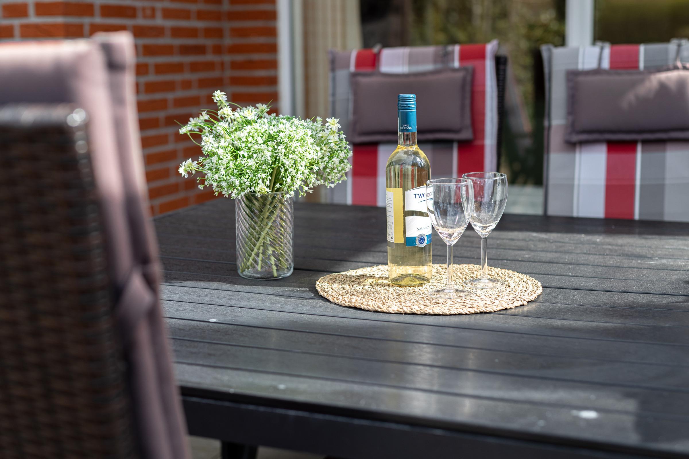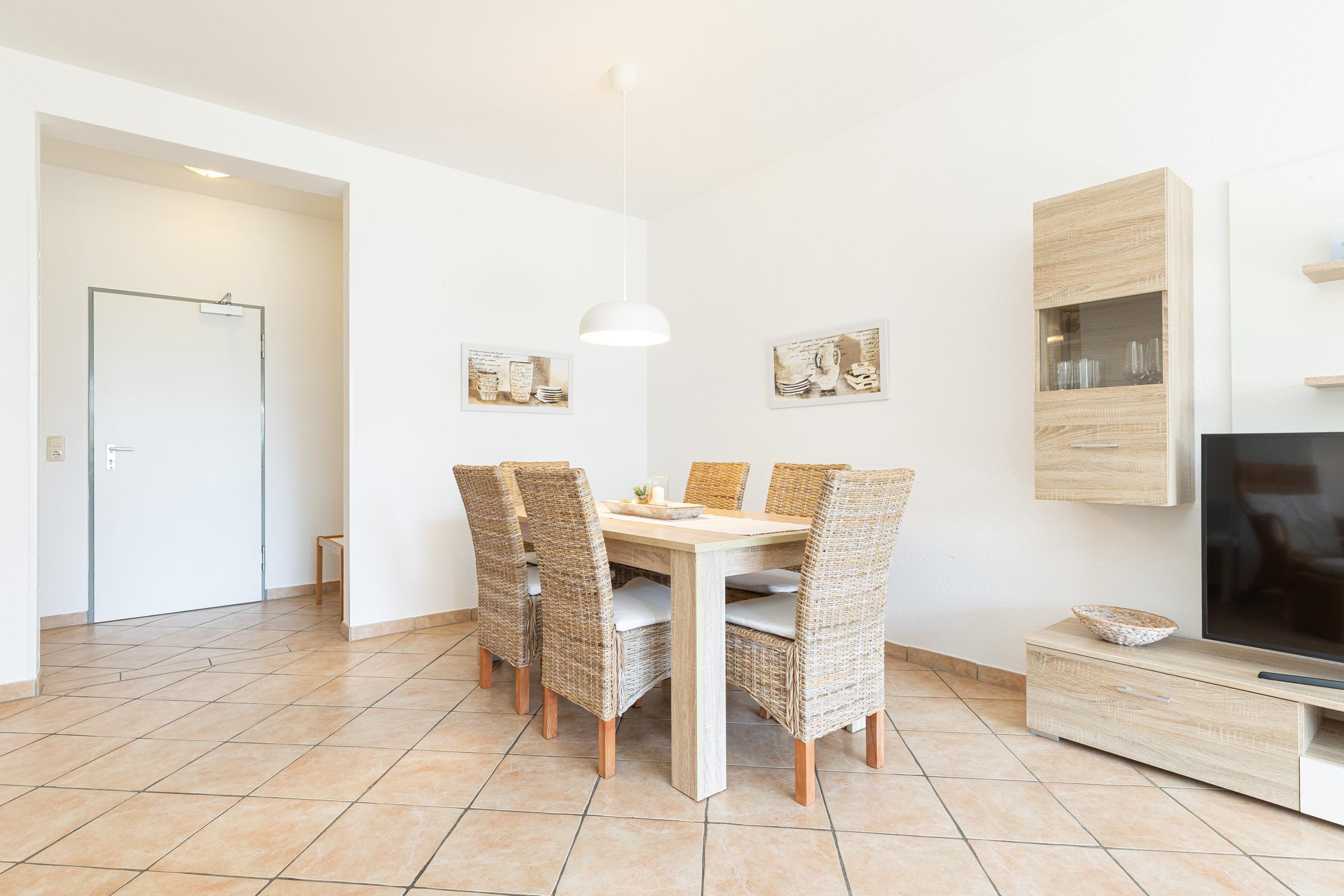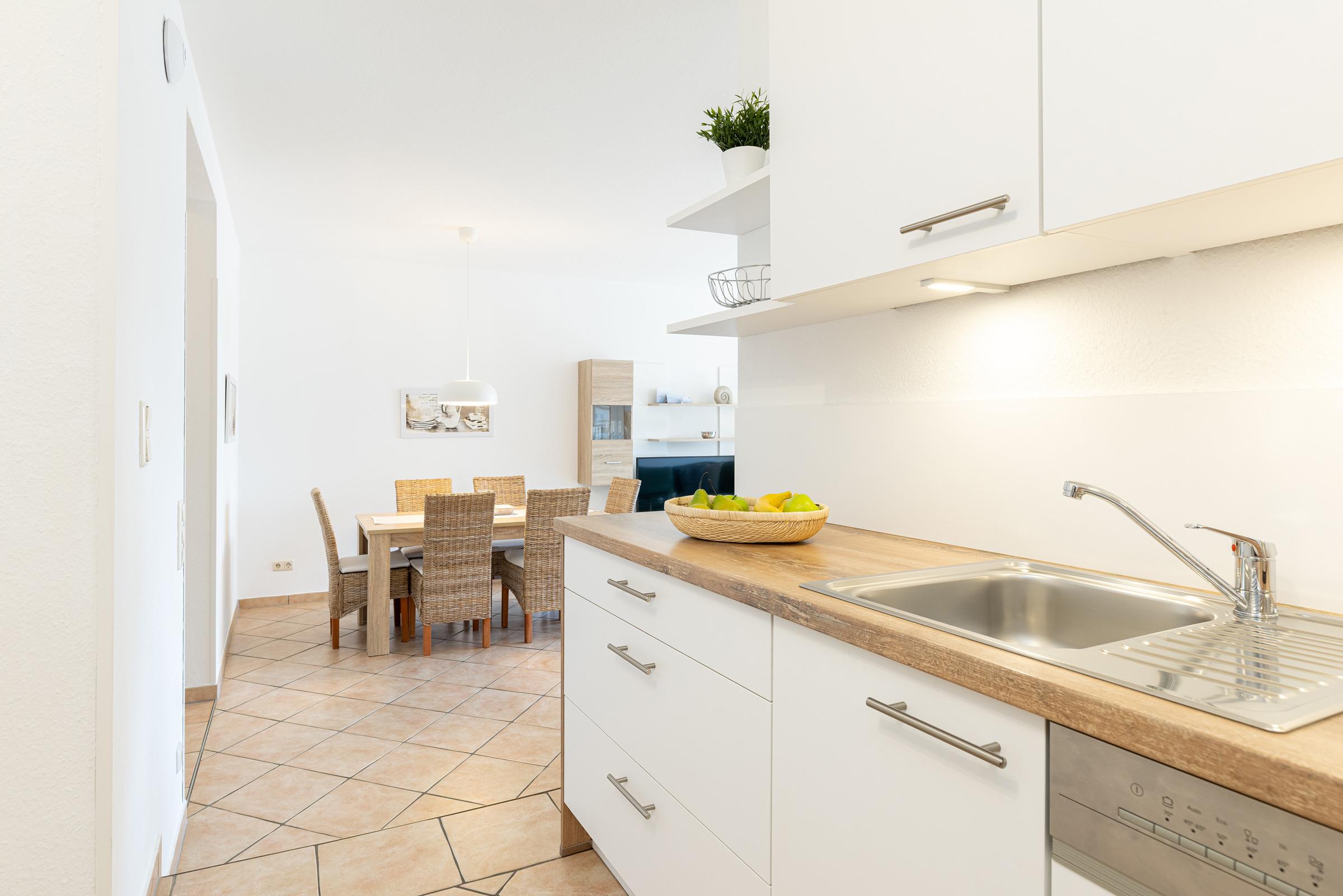 Genießen Sie die komfortable Größe dieser modern eingerichteten Ferienwohnung mit geräumiger Terrasse zur Süd-Westseite, offenem Wohnraum mit großem Esstisch, Wohnlandschaft mit moderner Smart-TV-Wand und neu verbauter Komfort-Küche. Fußböden sind gefliest.