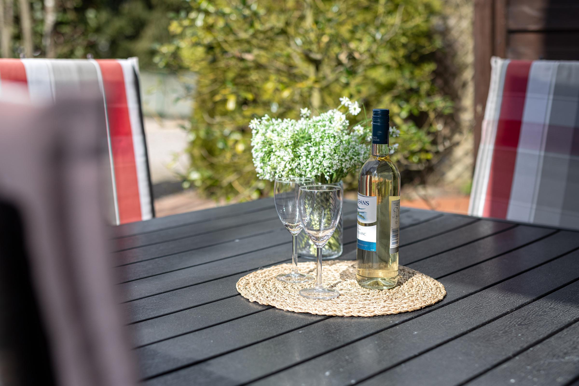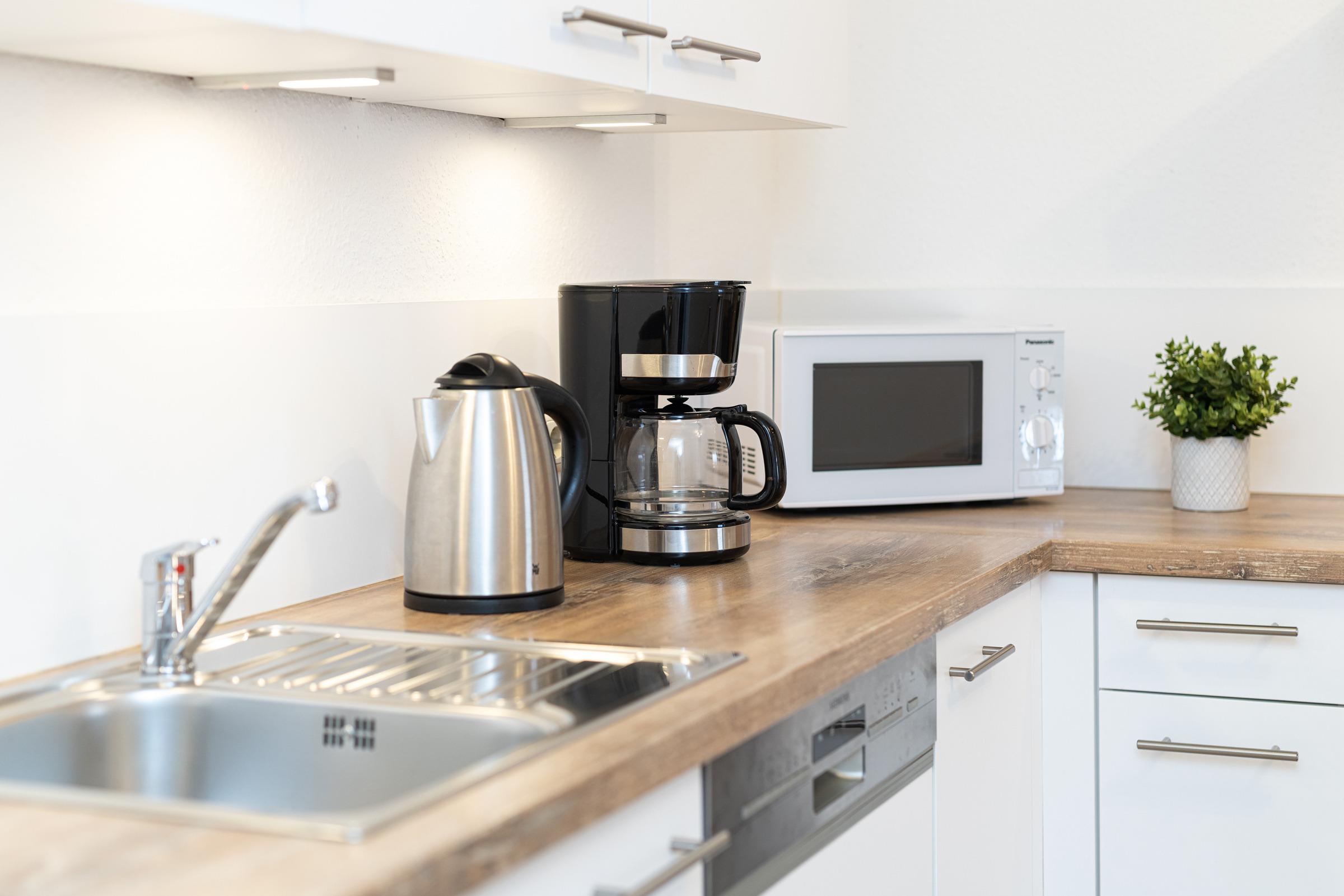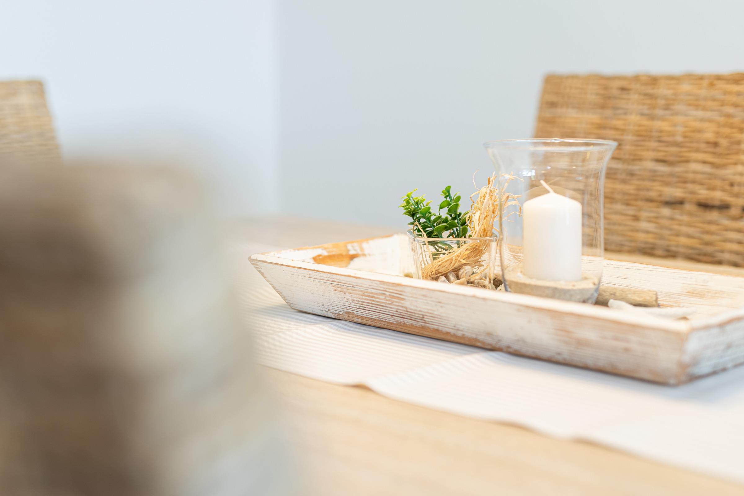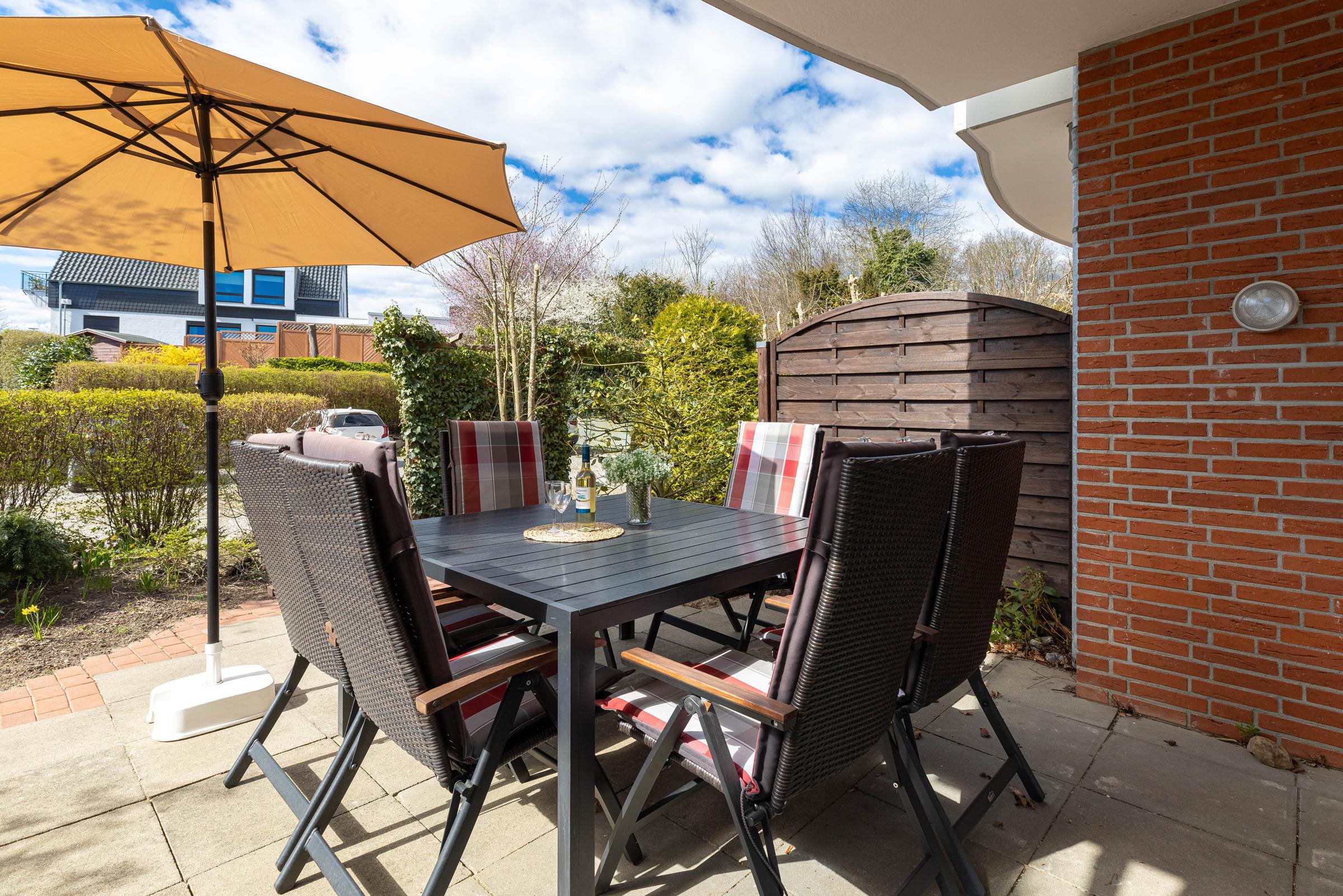Genießen Sie die komfortable Größe dieser modern eingerichteten Ferienwohnung mit geräumiger Terrasse zur Süd-Westseite, offenem Wohnraum mit großem Esstisch, Wohnlandschaft mit moderner Smart-TV-Wand und neu verbauter Komfort-Küche. Fußböden sind gefliest.