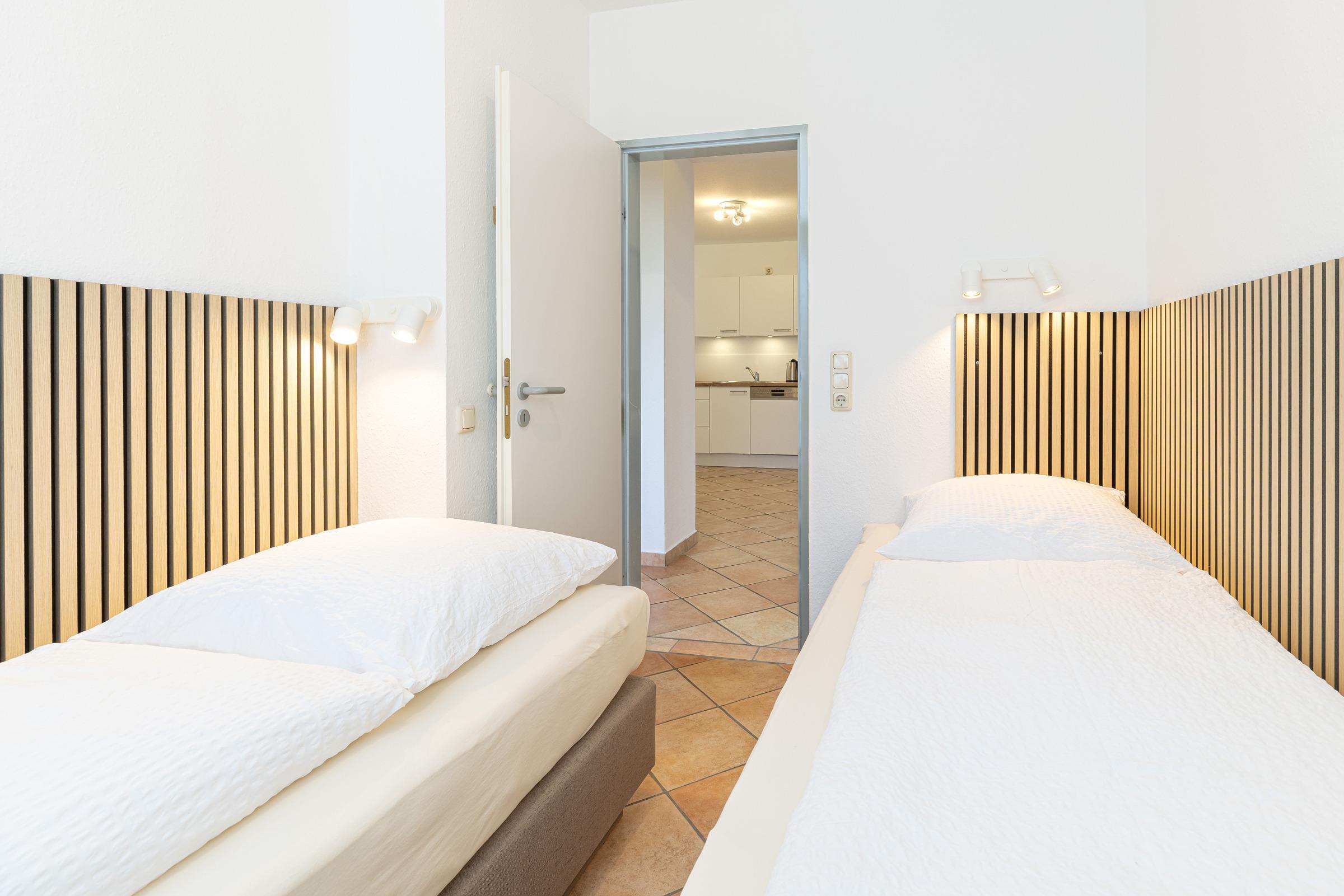 Das 3. Schlafzimmer hat zwei Boxspring-Einzelbetten (je 90 x 200 cm) mit einem Kleiderschrank von 100 cm.