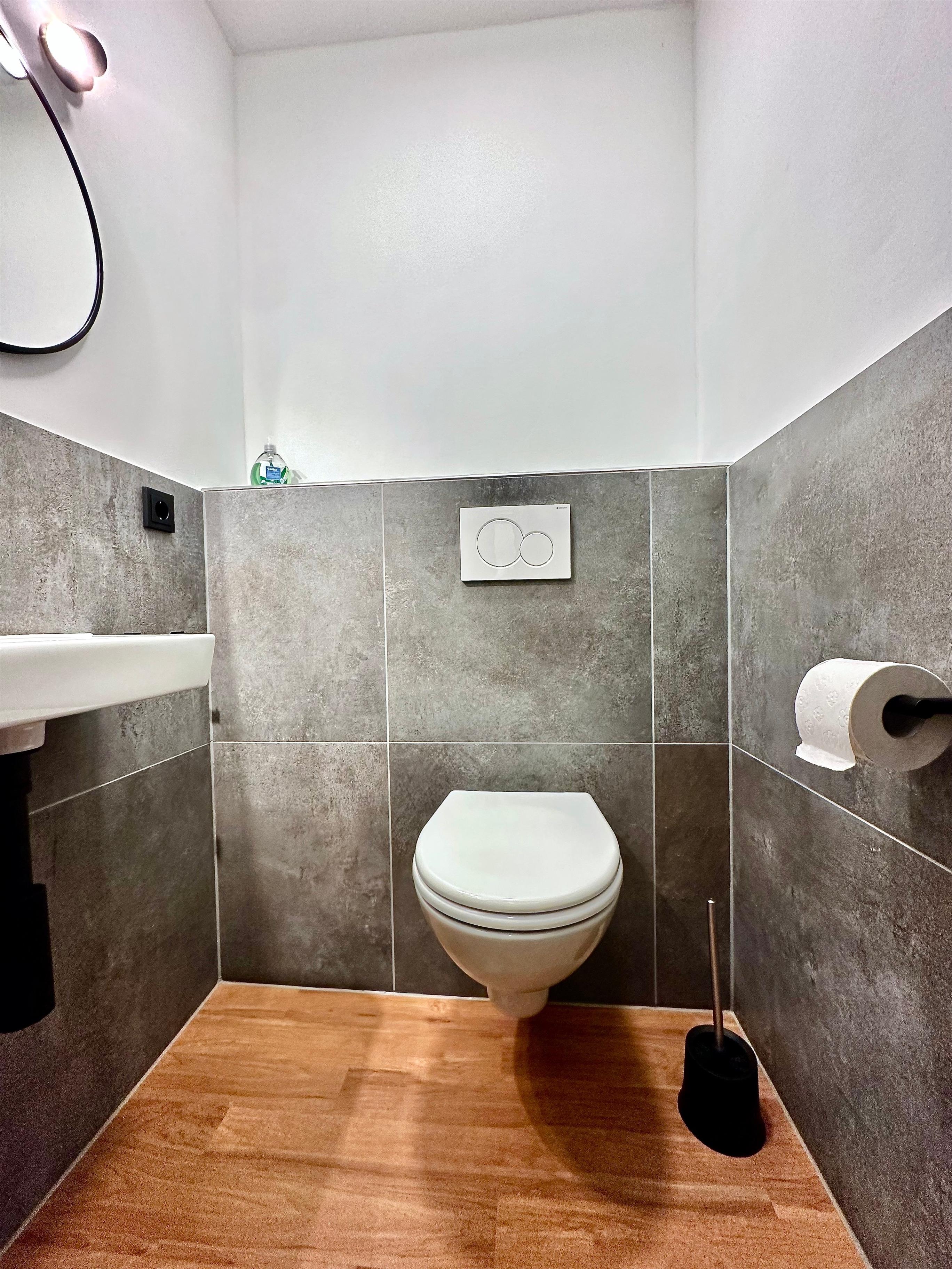 Unser in 2020 neu gestaltetes Wohnstudio ist eine Maisonette-Wohnung über zwei Ebenen. Der großzügige Wohnraum mit Blick auf den Balkon bietet beim Eintritt ein einladendes Wohlgefühl. Der neue Bodenbelag mit holzfarbenen Designer-Planken gibt dem Apartment Moderne. Die neue Wohnlandschaft bietet Schlafmöglichkeit für 1-2 Personen und lädt zum Faulenzen ein. Der Essplatz mit stilvollem Design ist gegenüber der Küchenzeile angeordnet. Das 2023 neu gestaltete Gäste-WC liegt unmittelbar im Eingangsbereich.