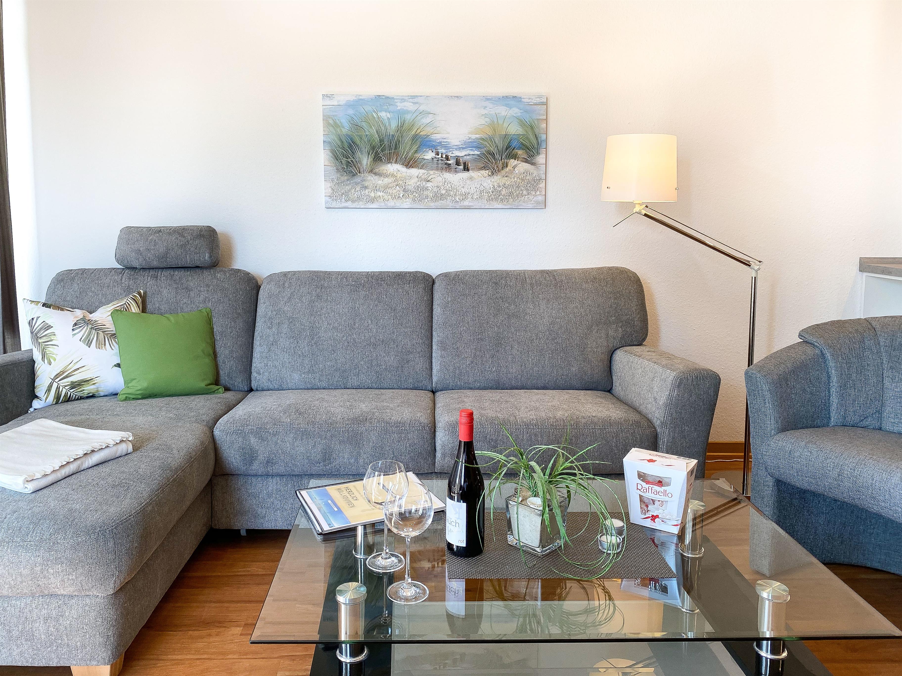 2020 NEU GESTALTET: Maisonette-Wohnung in zentraler und strandnaher Lage (200 m zum Kurzentrum und Hauptstrand) im 1. und 2. Obergeschoss für bis zu 4 Personen auf 64 m² Wohnfläche mit 1 Schlafzimmer (Boxspringbett), 1 Wohn-Schlafraum (Schlaf-Couch) und einem zusätzlichen kleinen Schlafraum (Bett 90 x 200 cm) .
