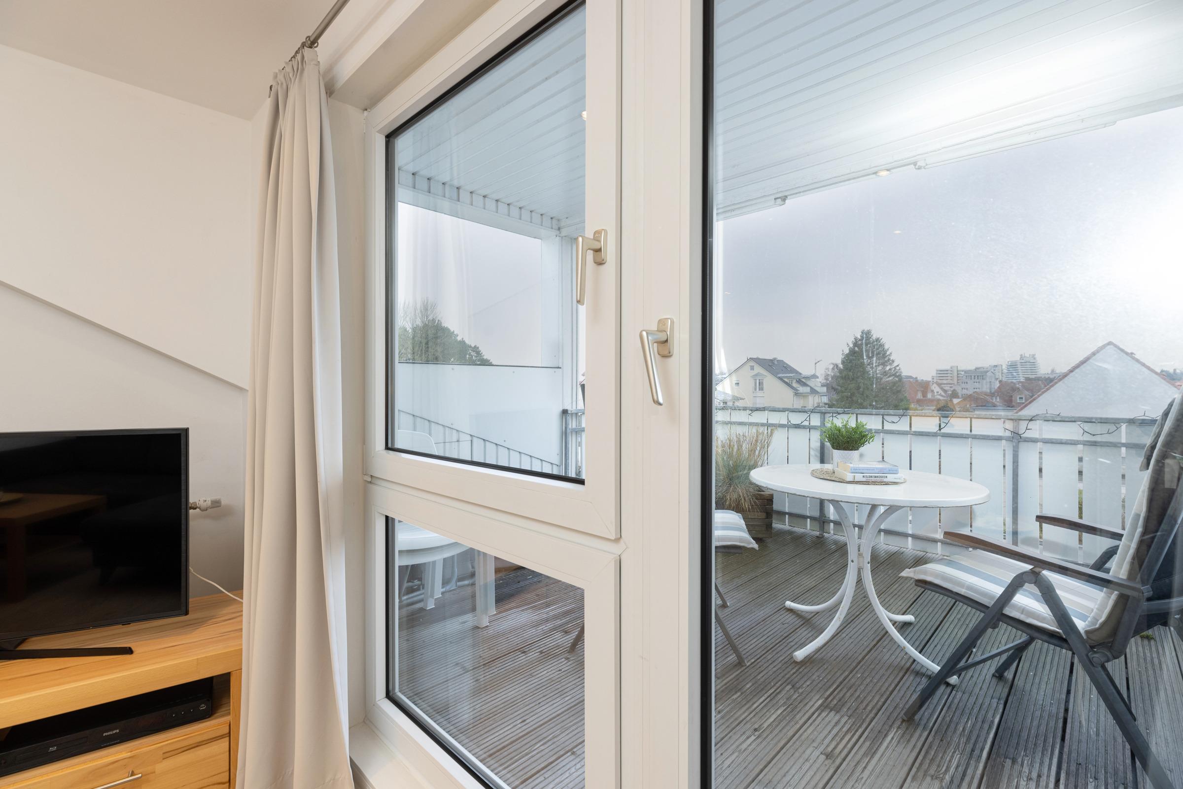 Dieses sonnendurchflutete, moderne Apartment mit großer Dachterrasse (Holzboden + Markise) lädt zur ungestörten Entspannung ein. Von hier aus können Sie einen kleinen Blick zum Wasser und Seebrücke erhaschen und den schönen Strand erahnen.