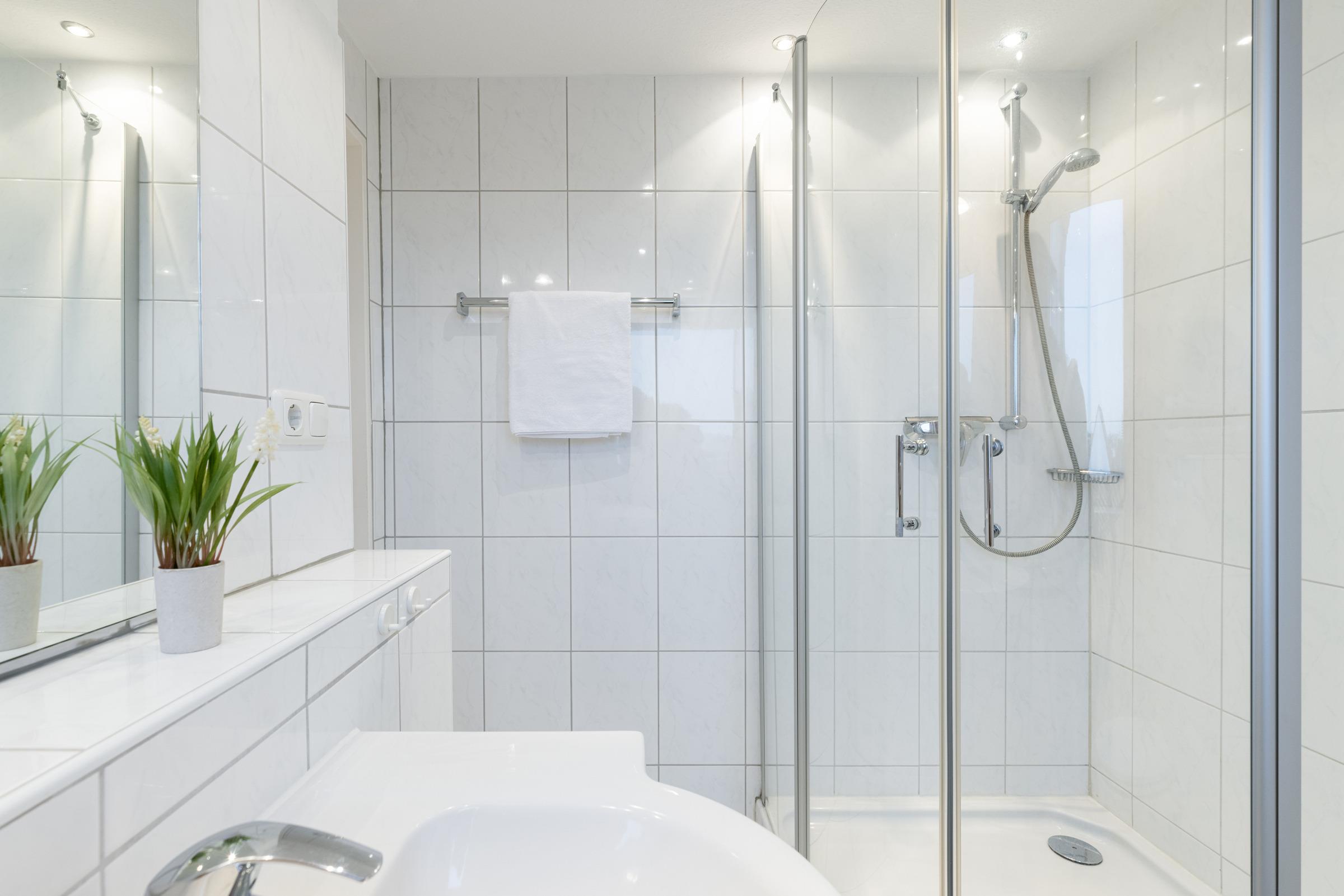Das Badezimmer mit Glasduschwand und Qualitätsarmaturen wirkt großzügig, auch durch viel Fensterfläche.