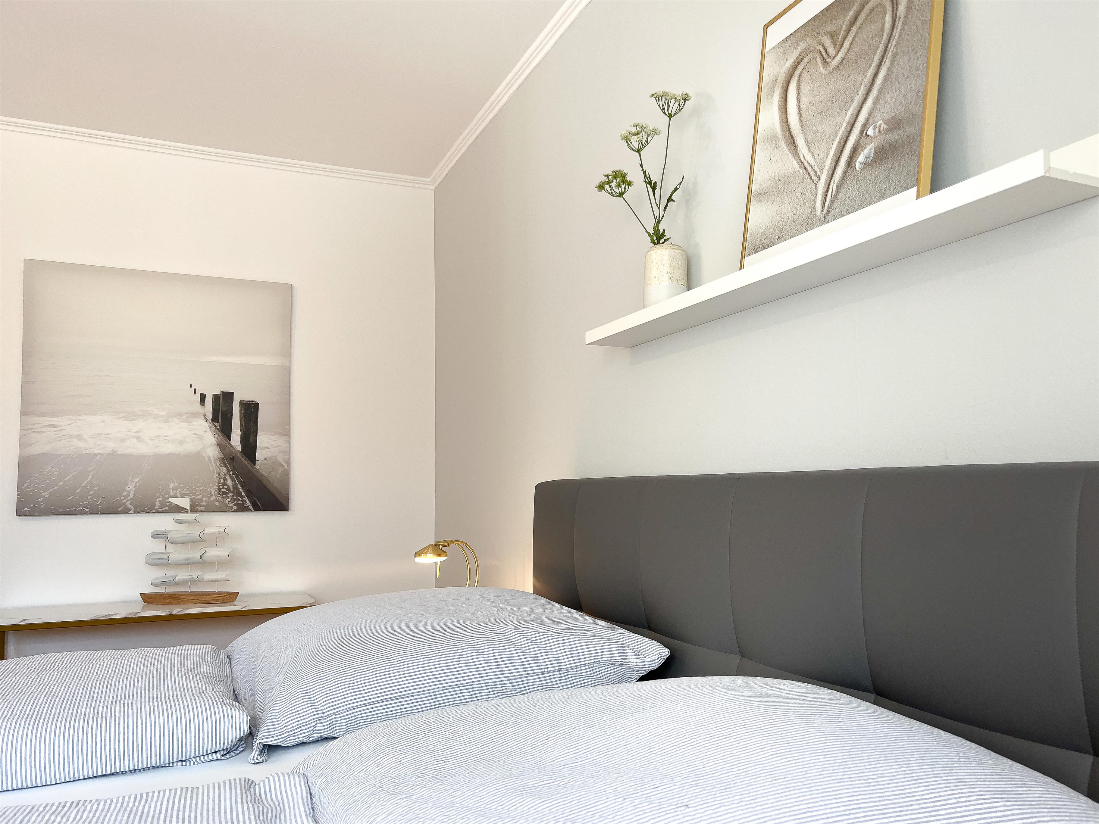 Das 2. Schlafzimmer ist eingerichtet mit einem Boxspringbett und einem Wandklappbett (je 90 x 200 cm).