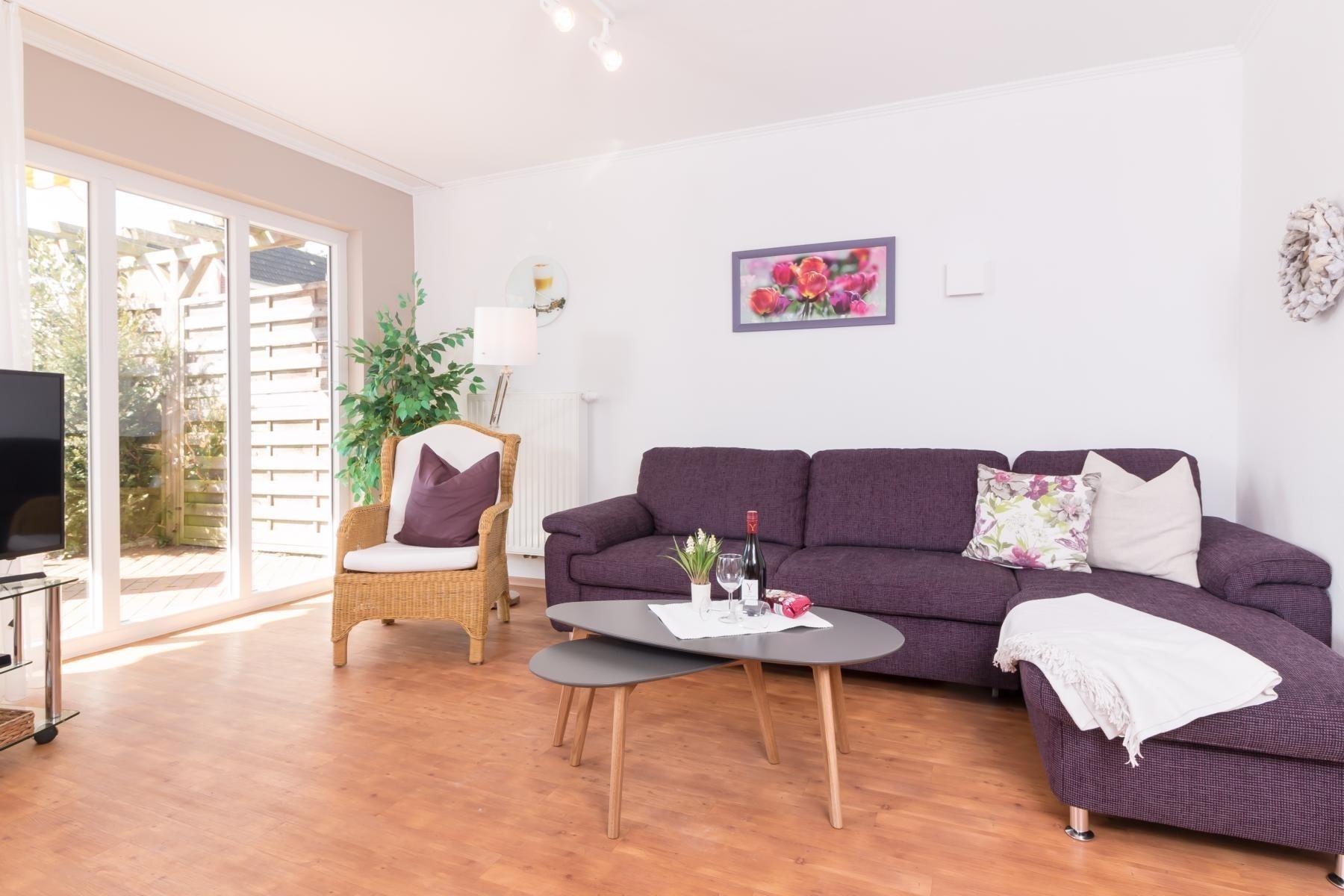 Durch das Carport kommen Sie über die Terrasse in den großen Wohnraum mit bodentiefen Fensterelementen. Viel Helligkeit und der hygienische, holzfarbene Designboden verleihen dem Apartment ein modernes Ambiente. Es erwarten Sie eine Sitzecke, (Schlafsofa + Hockerbank), Essplatz und Einbauküche.