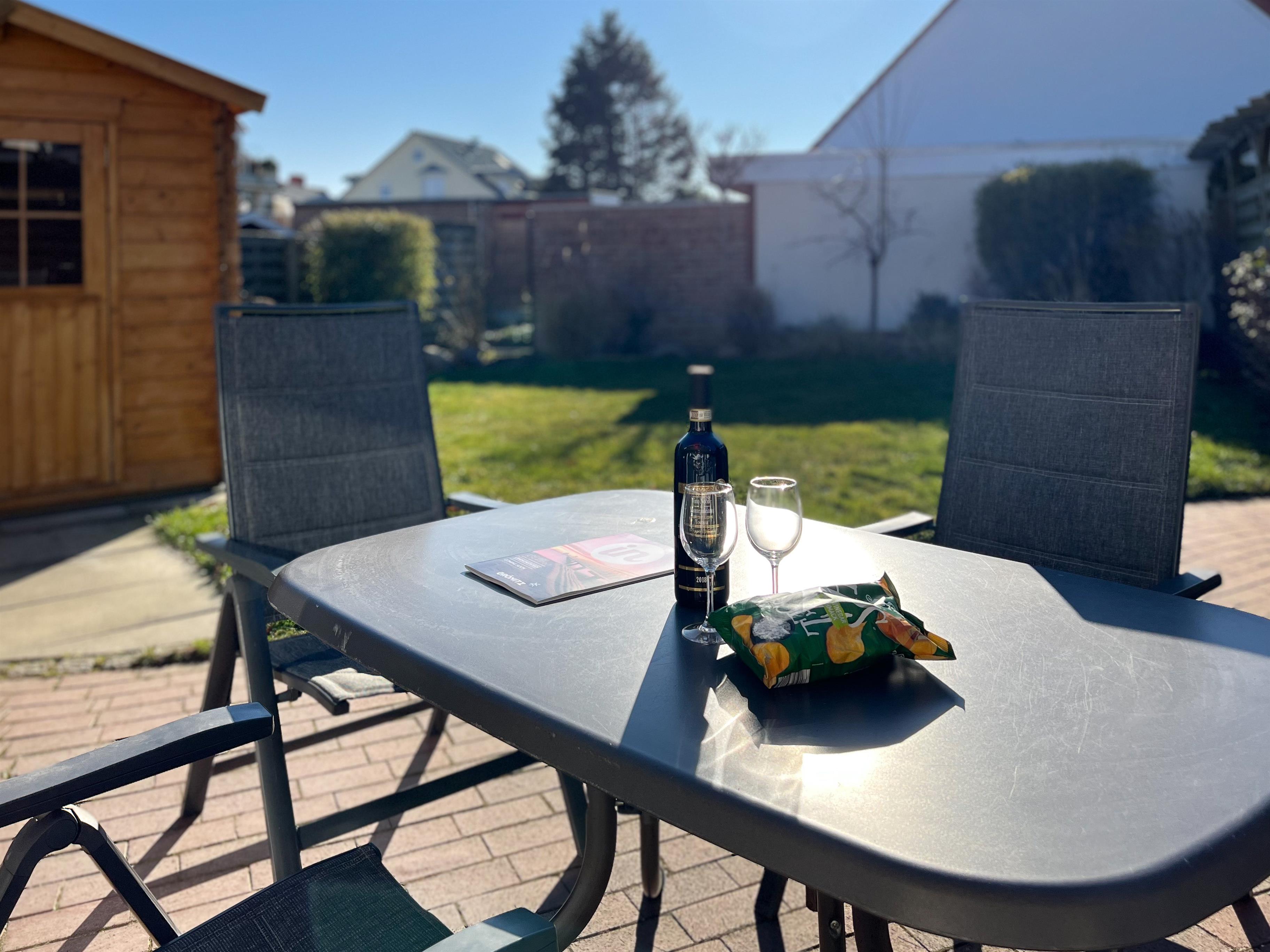 Von hier aus genießen Sie den Blick in ihren Garten mit Rasenfläche als Spiel- und Liegewiese und auf die Terrasse mit Edelstahlgrill und neuen Sitzmöbeln.