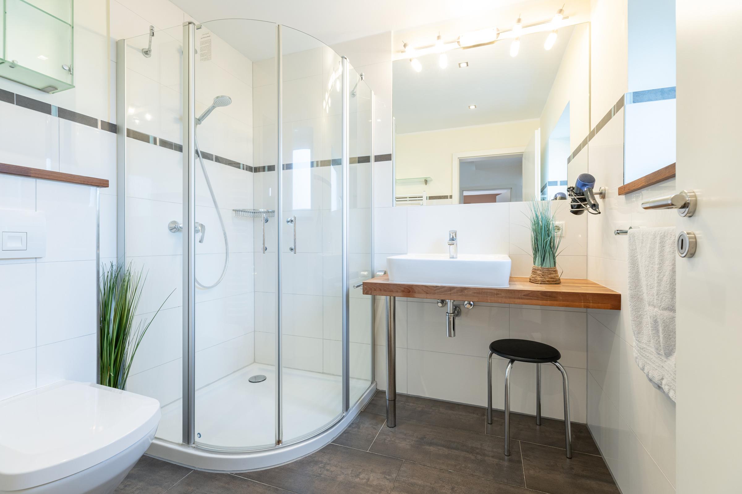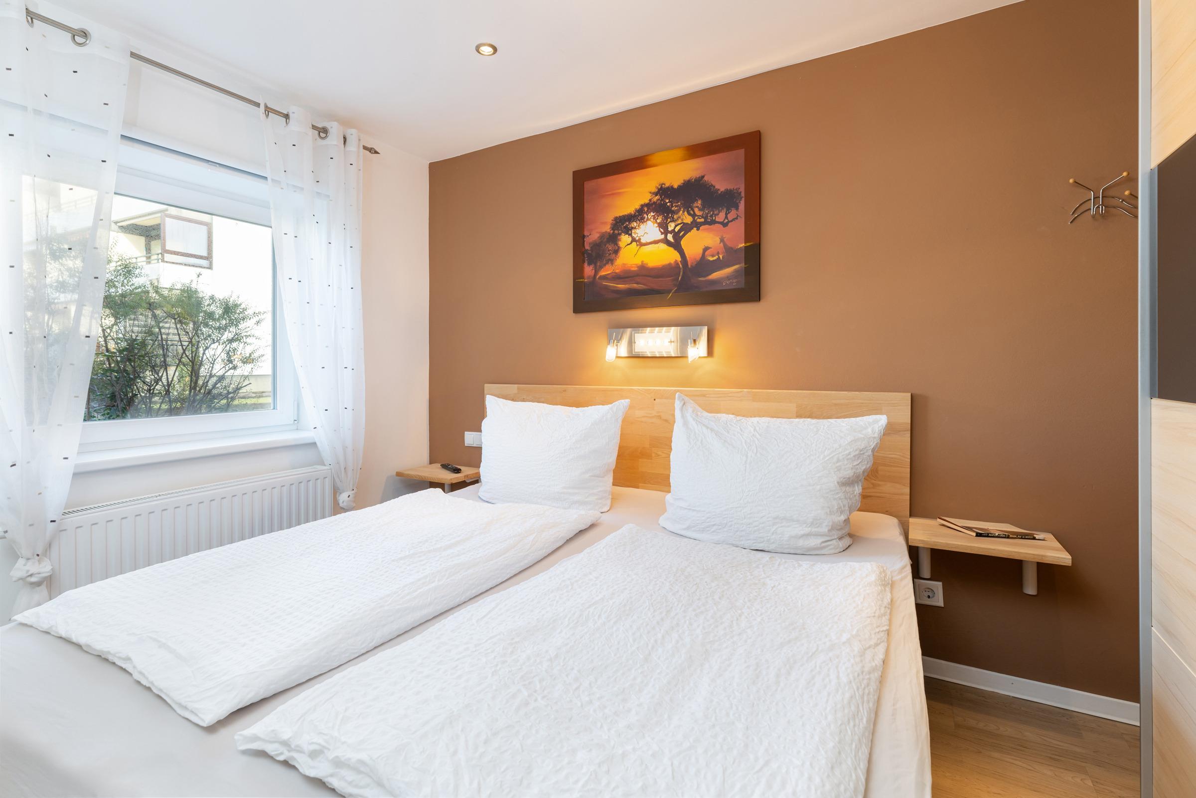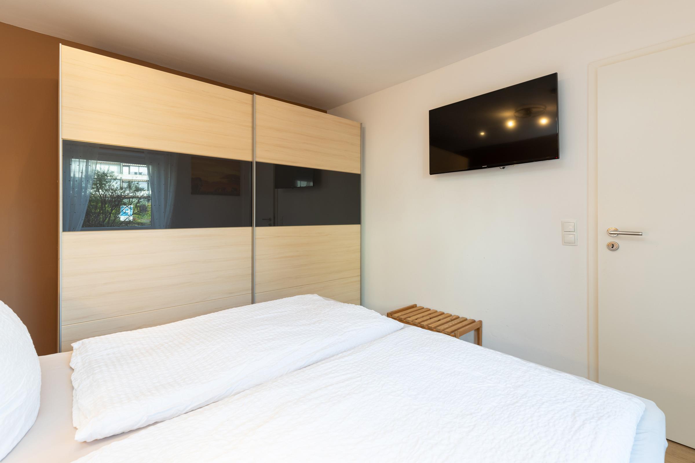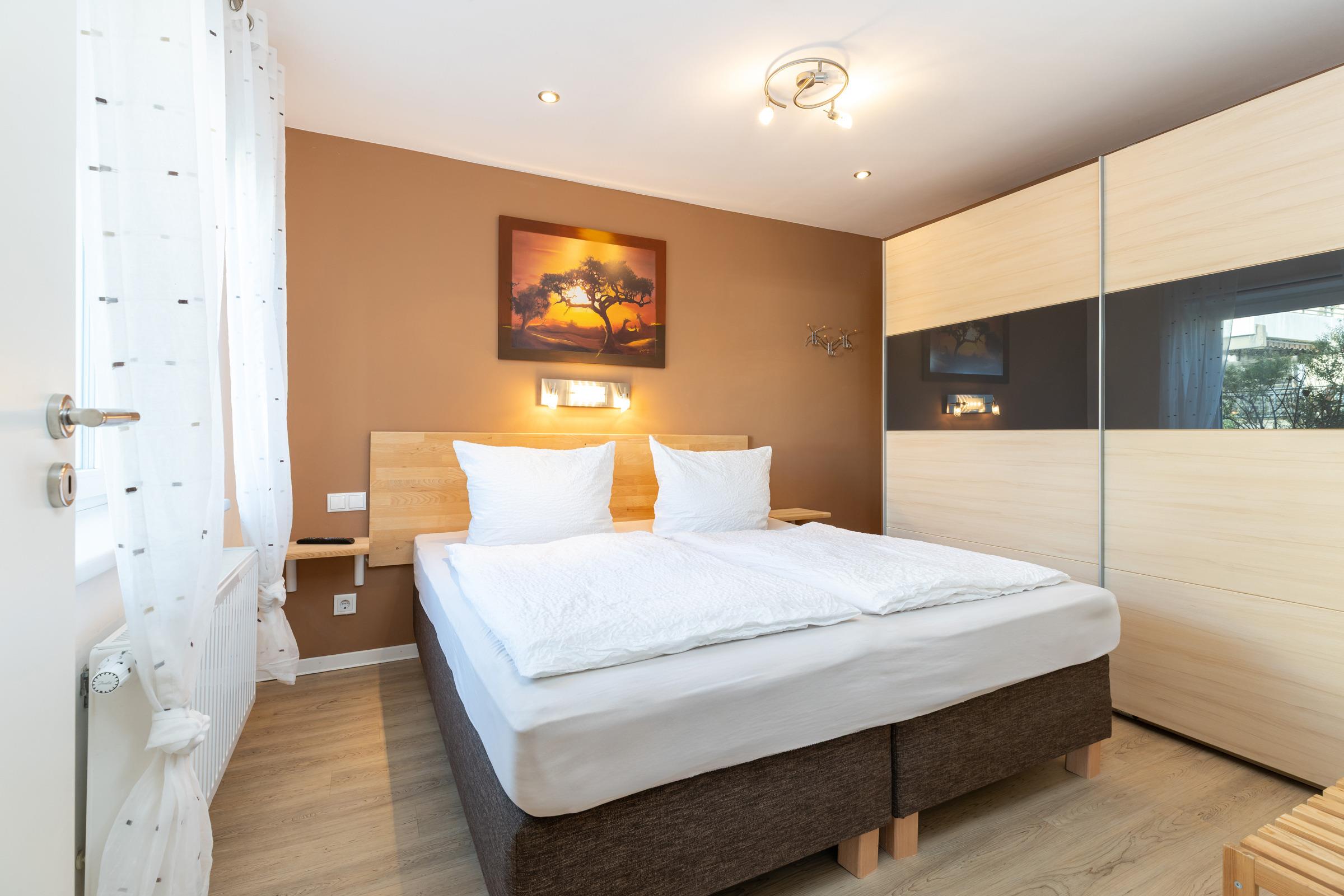 Parterre – 2 Schlafzimmer mit Boxspring-Doppelbett (180 x 200 cm), Wand-TV + Kleiderschrank, elegantes Bad mit Regendusche + Classic-Accessoires.