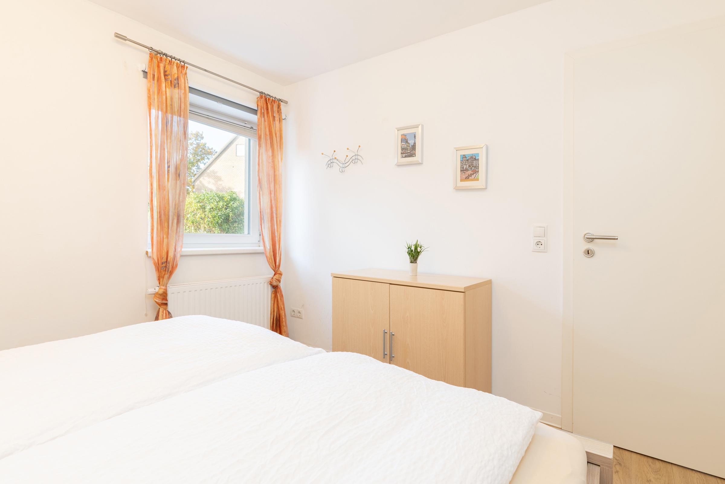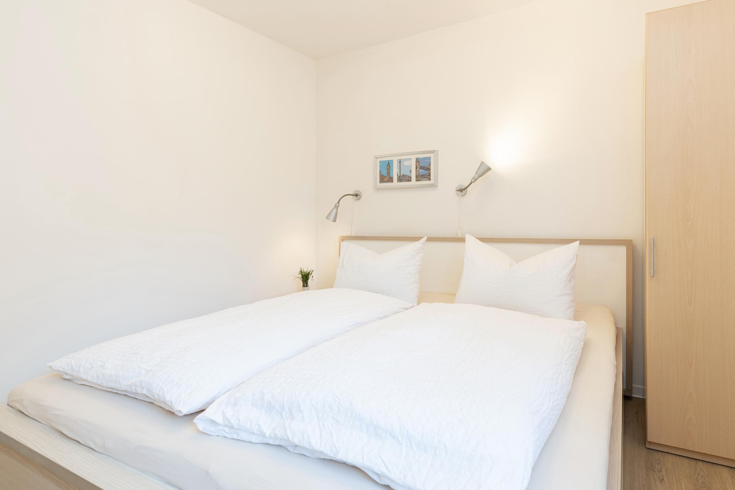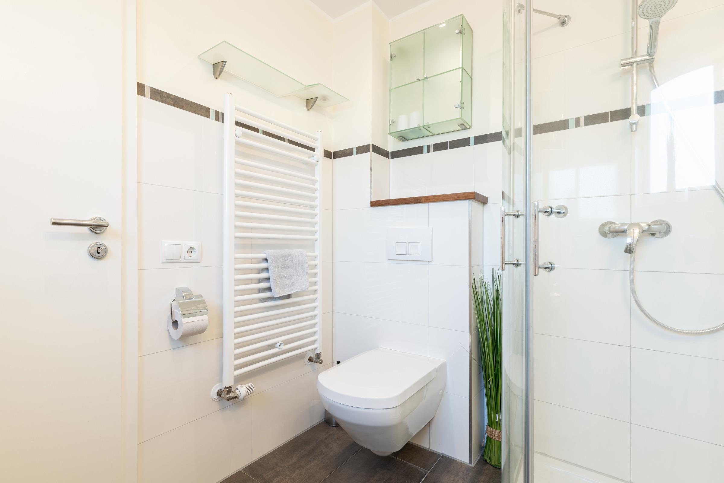 Parterre – 2 Schlafzimmer mit Boxspring-Doppelbett (180 x 200 cm), Wand-TV + Kleiderschrank, elegantes Bad mit Regendusche + Classic-Accessoires.
