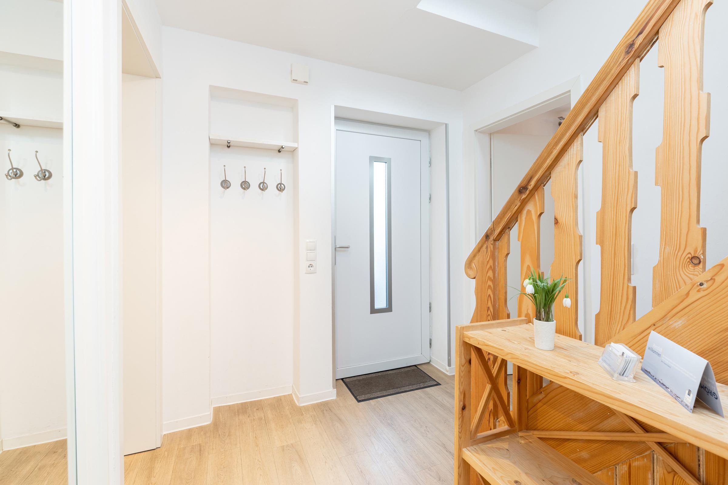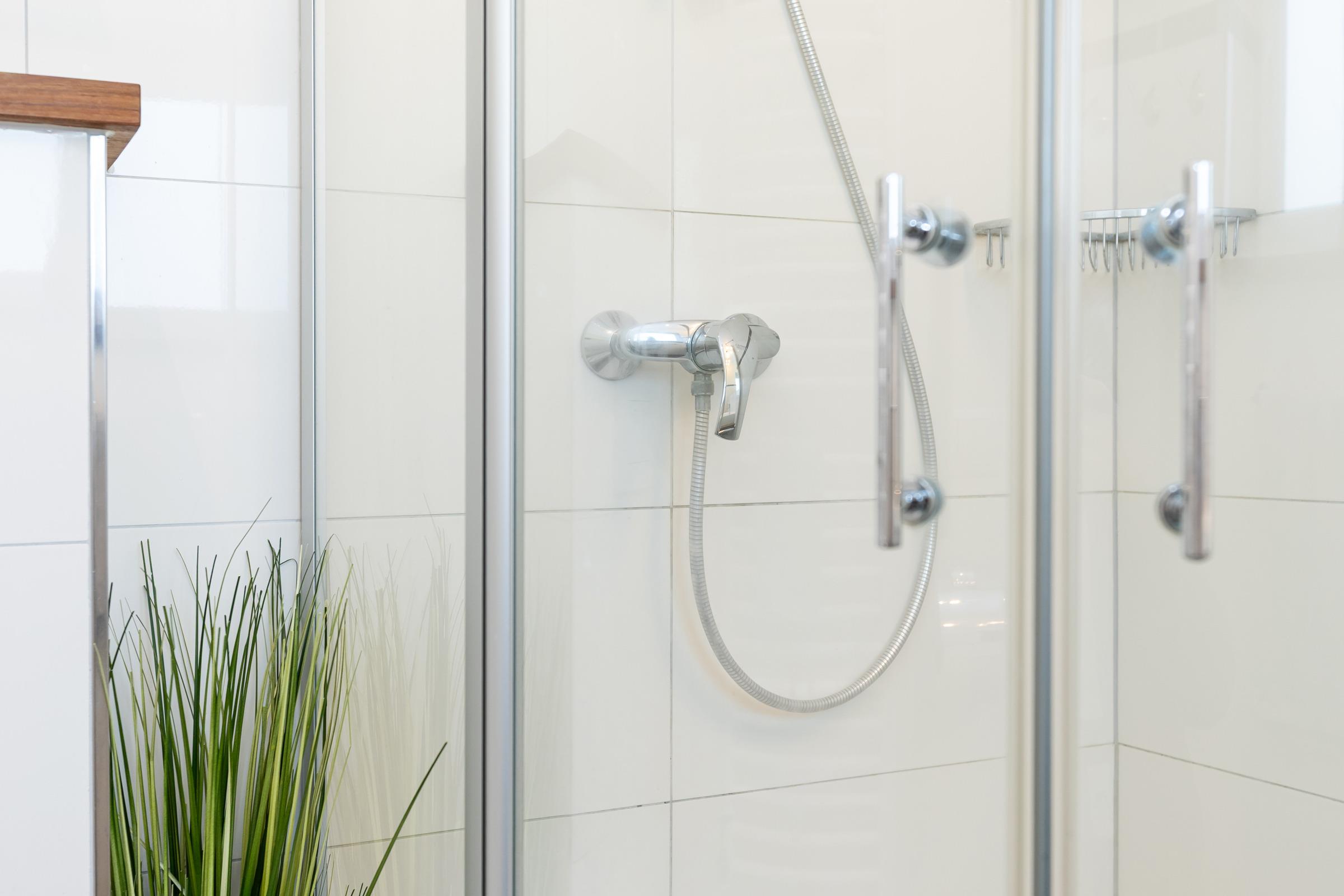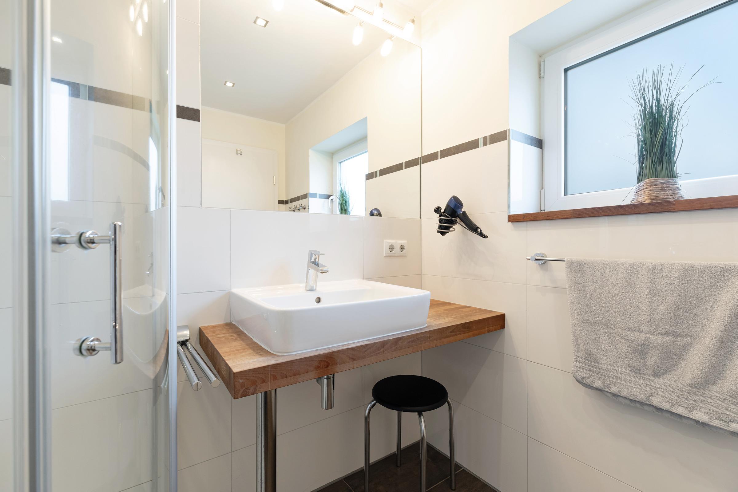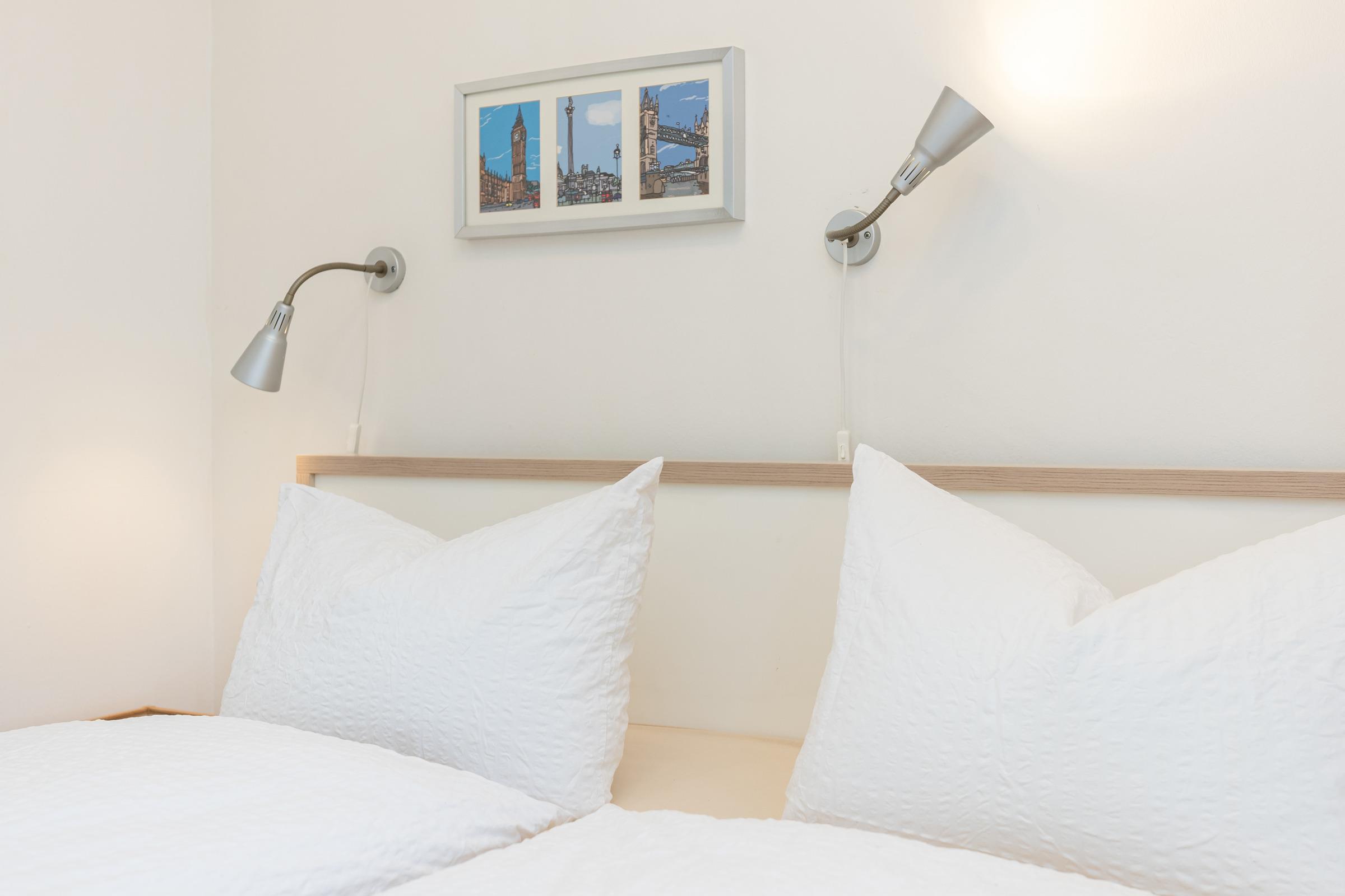 Parterre – 2 Schlafzimmer mit Boxspring-Doppelbett (180 x 200 cm), Wand-TV + Kleiderschrank, elegantes Bad mit Regendusche + Classic-Accessoires.