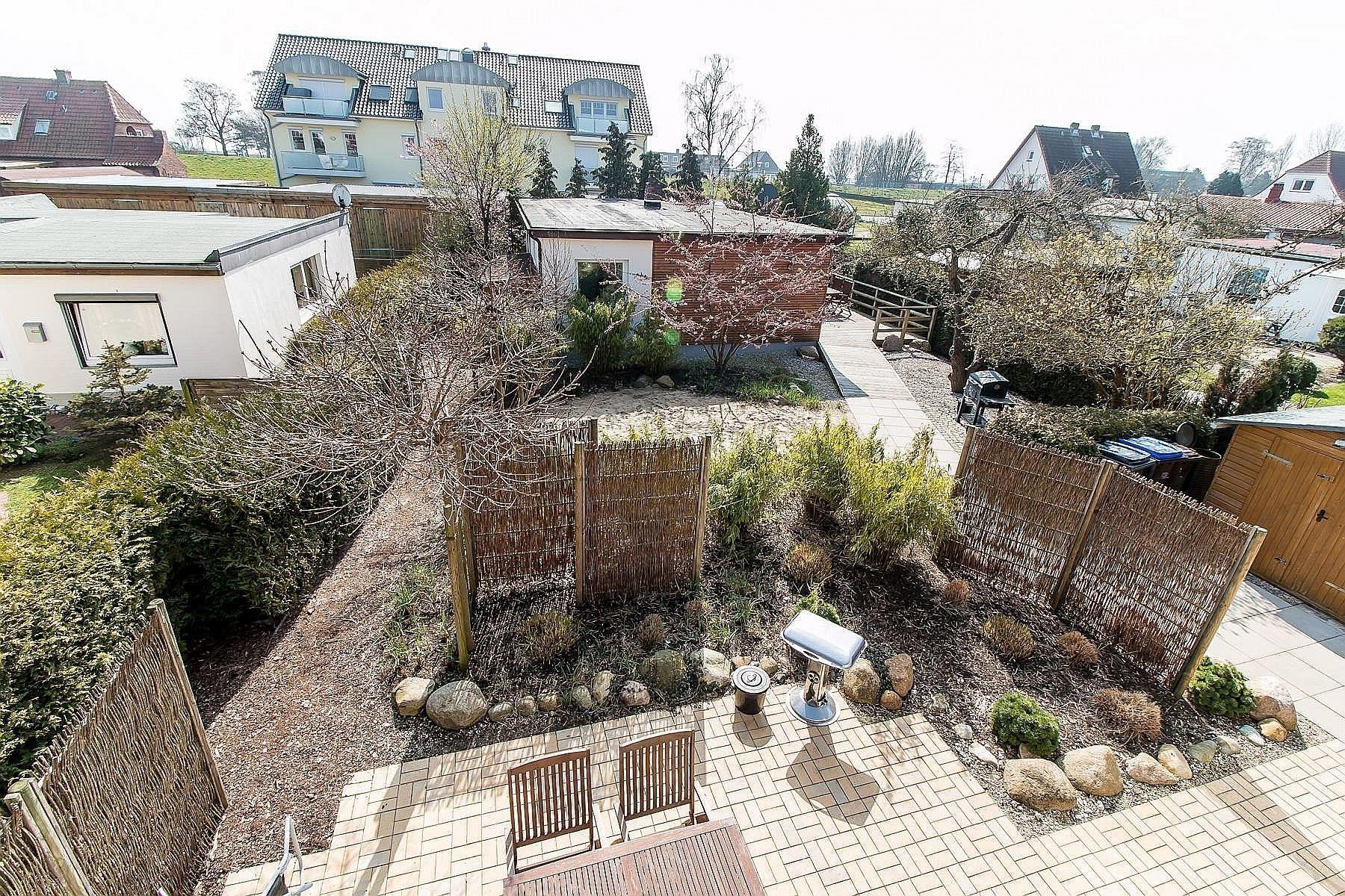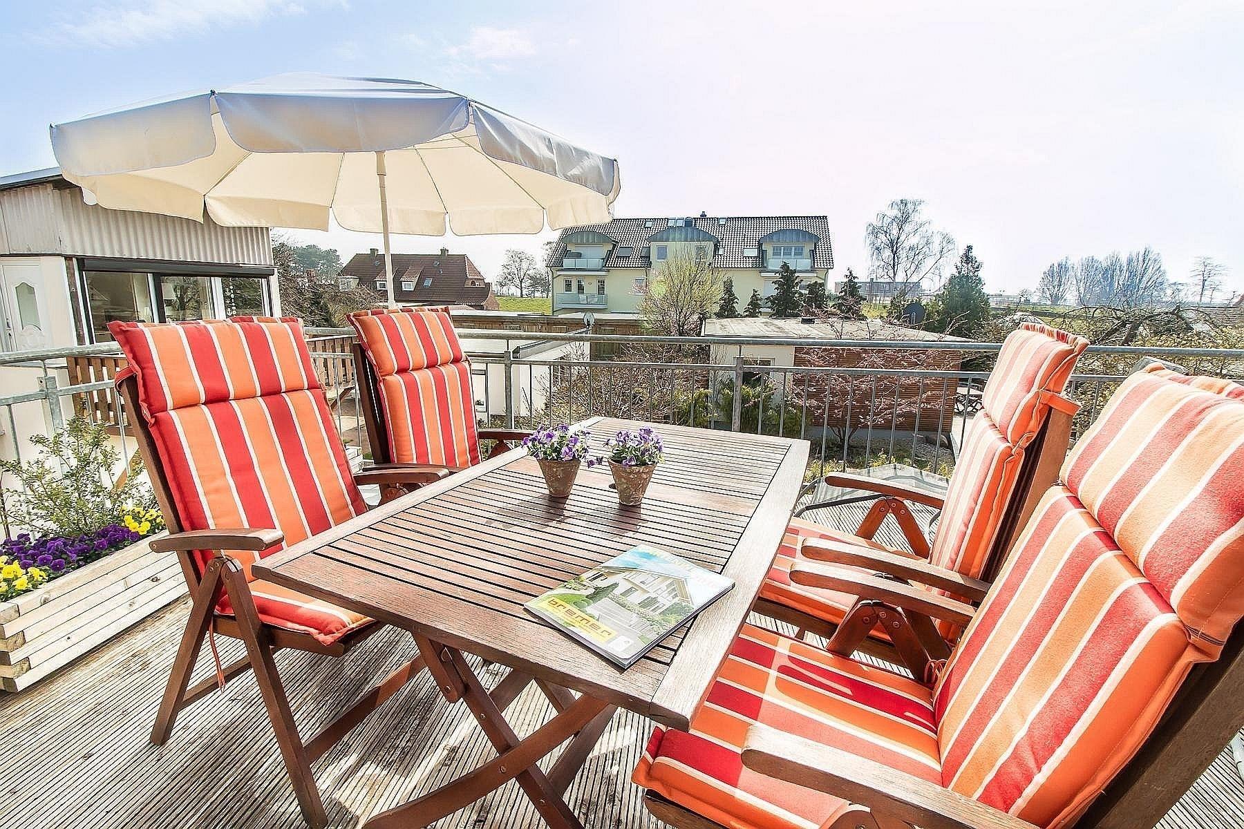 Der Balkon mit Holzdielen ist ca. 15 qm groß und ein Highlight dieser Ferienwohnung. Groß genug zum Sonnenbaden, Frühstücken und Grillen. Mit Blick zum nur 80 m entfernten Deich lassen sich Strand und Meer erahnen.