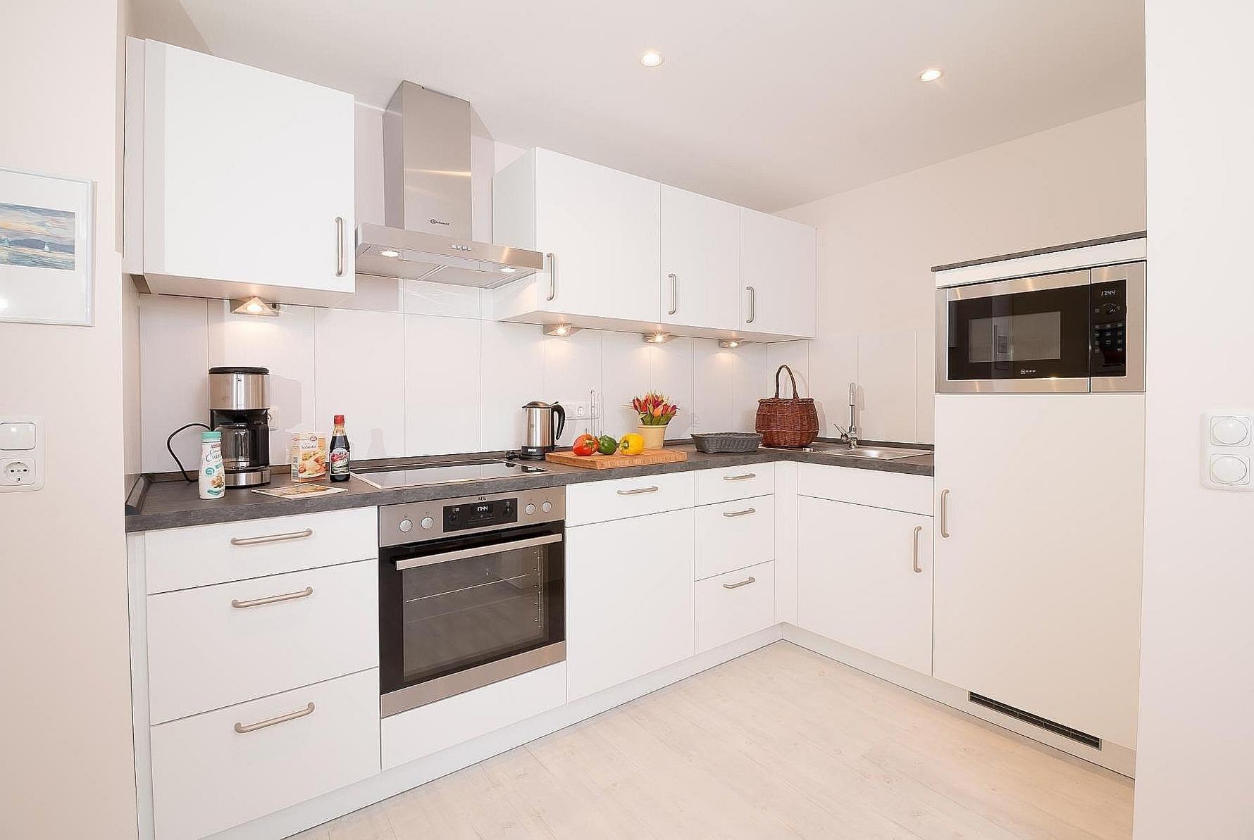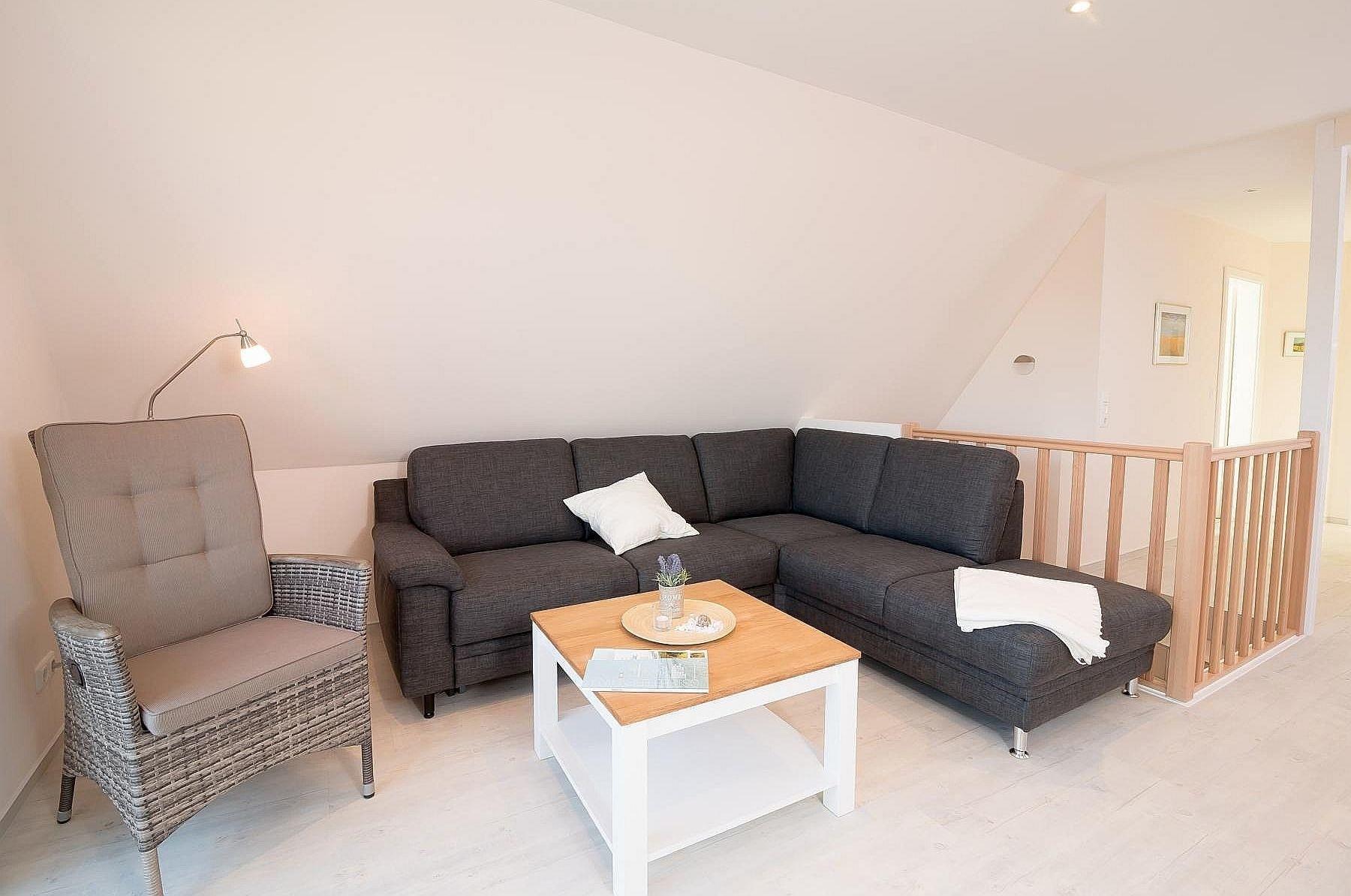 Durch einen separaten Eingang an der Hausseite der in 2017 neu eröffneten Ferienanlage gelangen Sie über eine geschwungene Treppe in den offenen, besonders freundlichen Wohnbereich. Helligkeit und Großzügigkeit heißen Sie herzlich willkommen. Die komfortabel ausgestattete Küche, die moderne Essgruppe mit Tisch und bequemen Stühlen sowie die Wohnlandschaft mit Ottomane (und Bettfunktion) bieten mit eine gemütliche Wohnatmosphäre. Der moderne LED-TV verspricht gelungene Fernsehabende – zu jeder Jahreszeit.