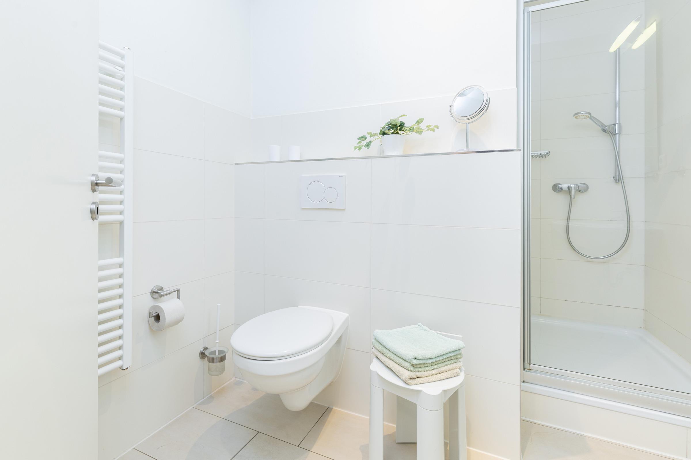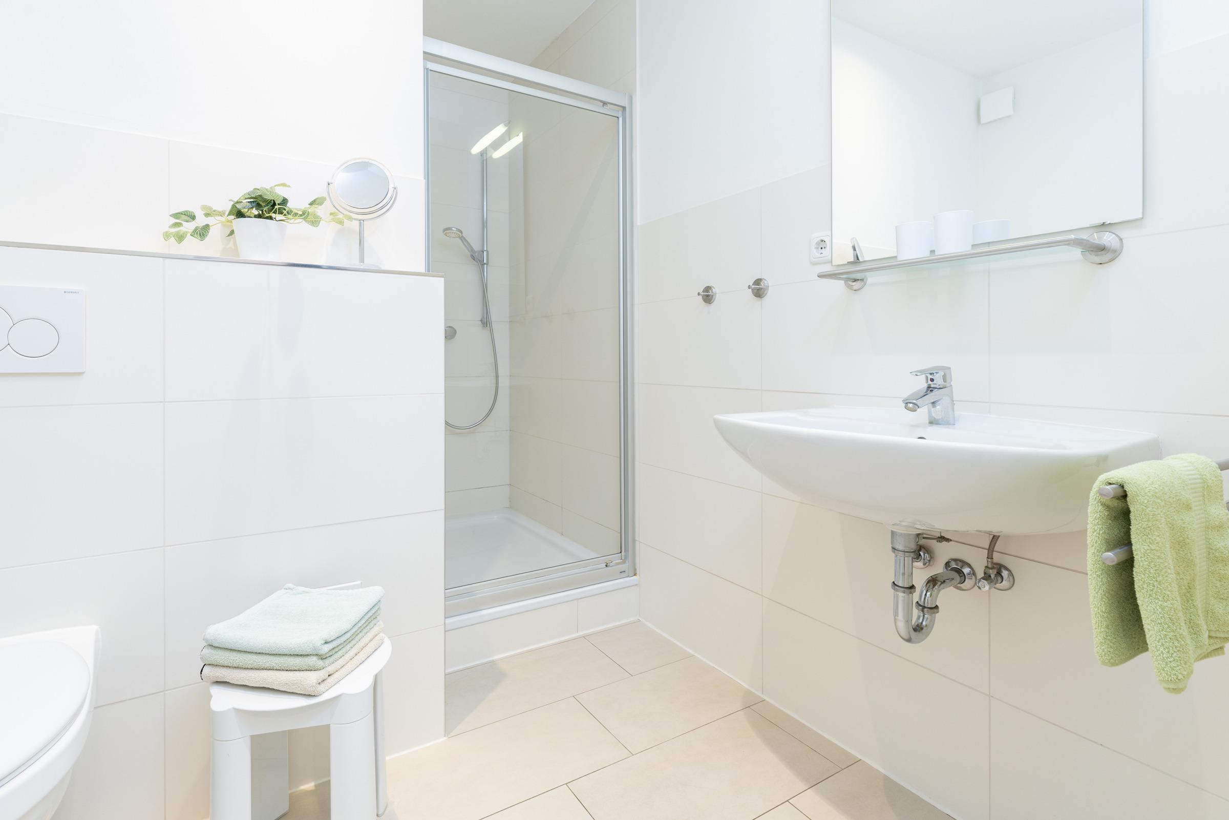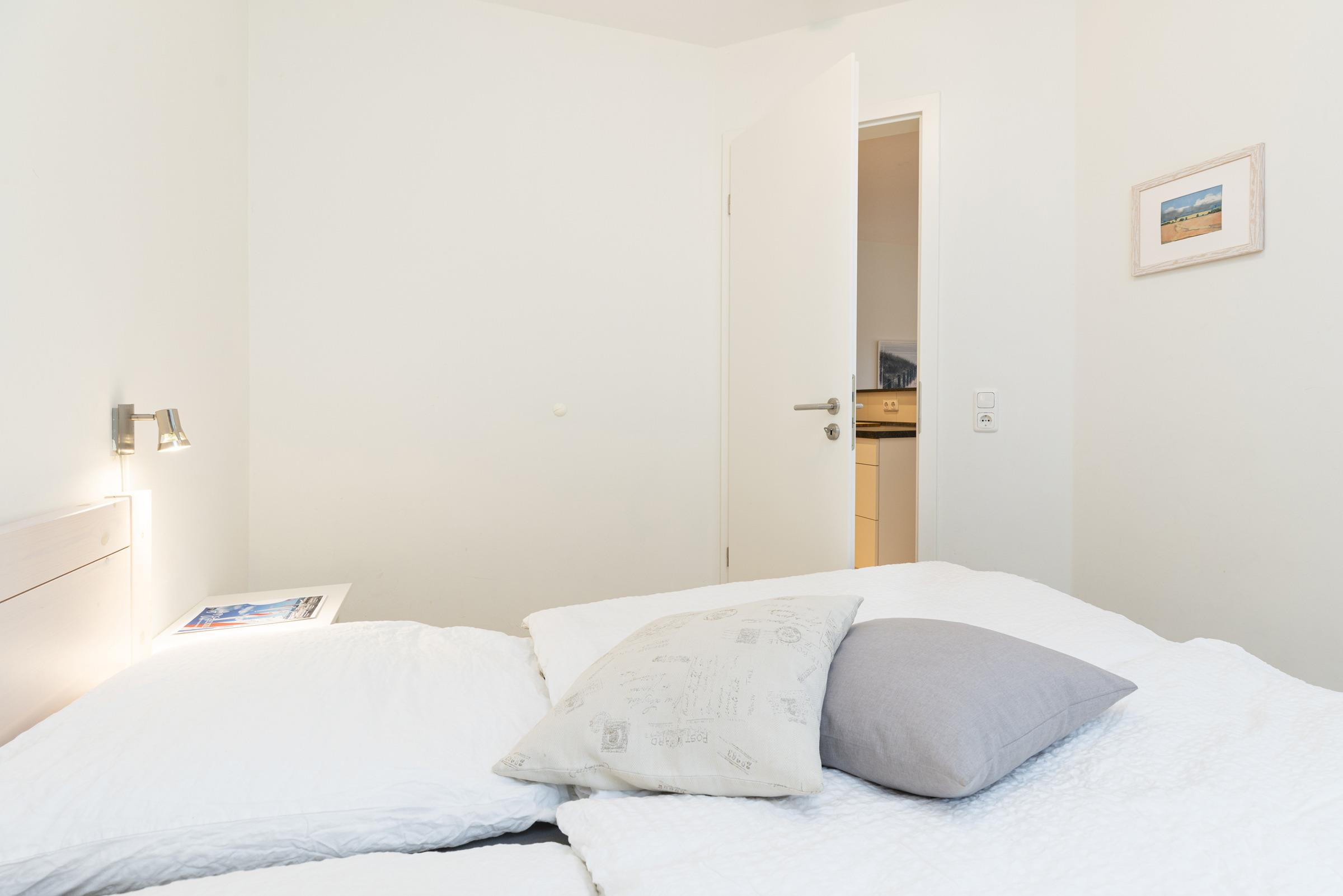 Das Schrankelement im großen Flurraum bietet genügend Stauraum. Von hier aus gehen Sie in zwei Schlafräume mit je 2 Betten - einmal 90 x 200 cm (Boxspring) und einmal 80 x 200 cm. Das Bad ist sandfarben gefliest und weiße Objekte mit Accessoires, Handtuch-Heizkörper sowie Echtglasdusche verleihen dem Raum Moderne.