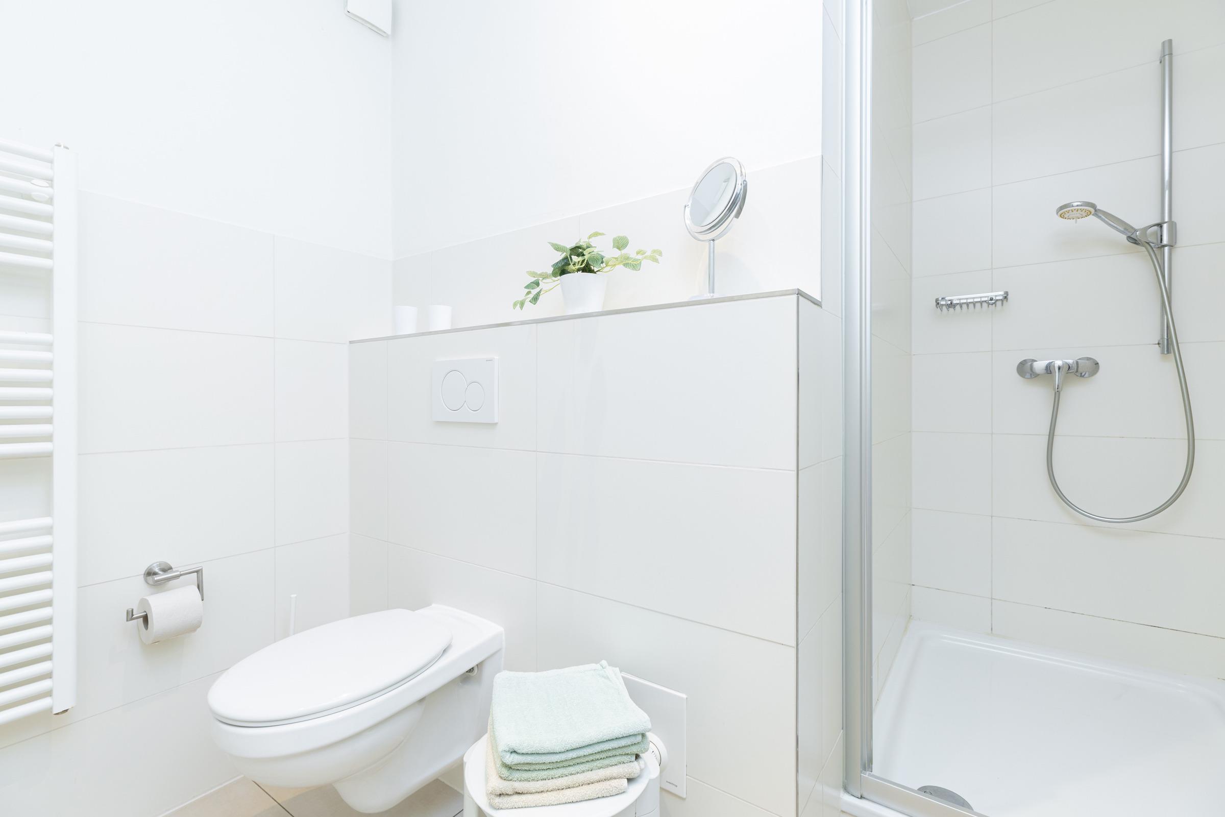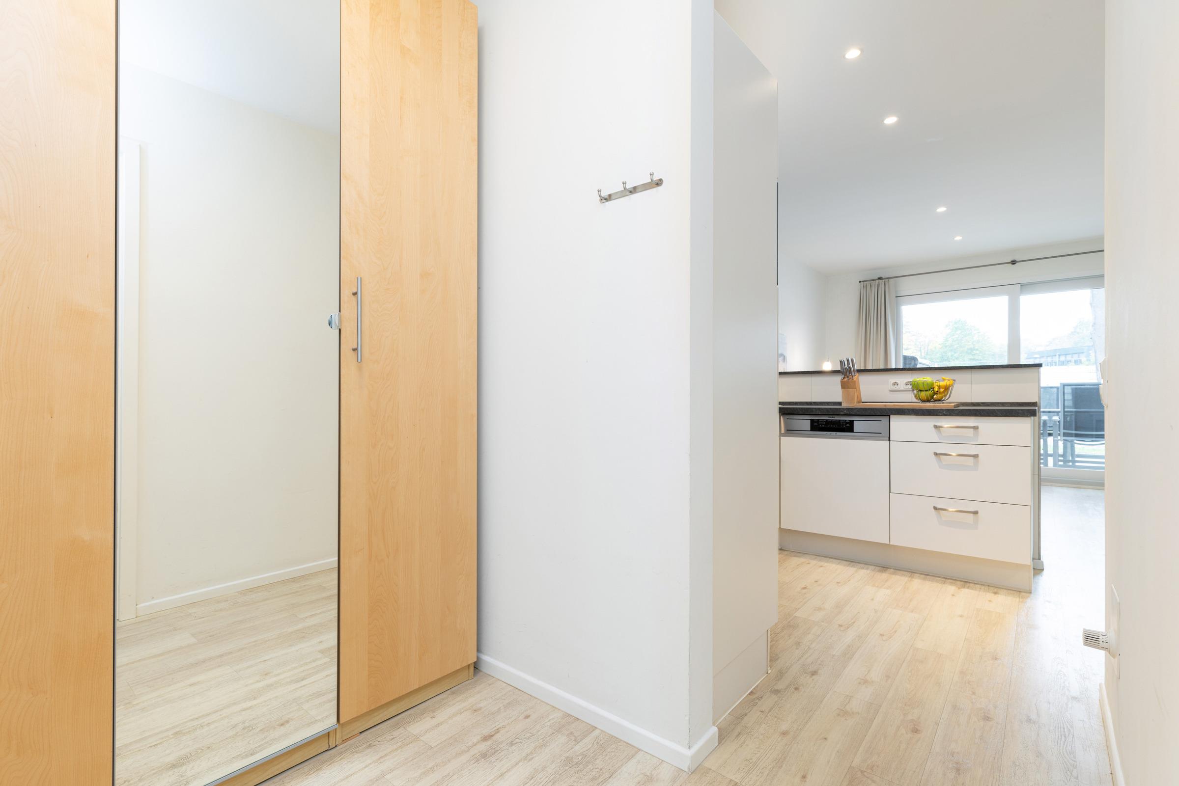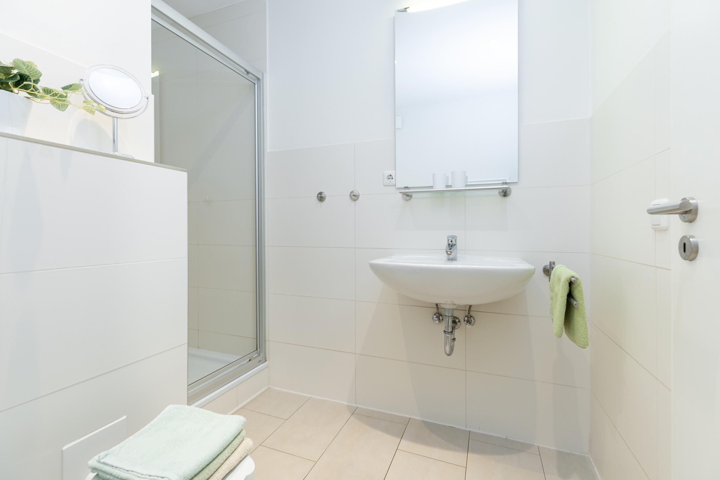 Das Schrankelement im großen Flurraum bietet genügend Stauraum. Von hier aus gehen Sie in zwei Schlafräume mit je 2 Betten - einmal 90 x 200 cm (Boxspring) und einmal 80 x 200 cm. Das Bad ist sandfarben gefliest und weiße Objekte mit Accessoires, Handtuch-Heizkörper sowie Echtglasdusche verleihen dem Raum Moderne.