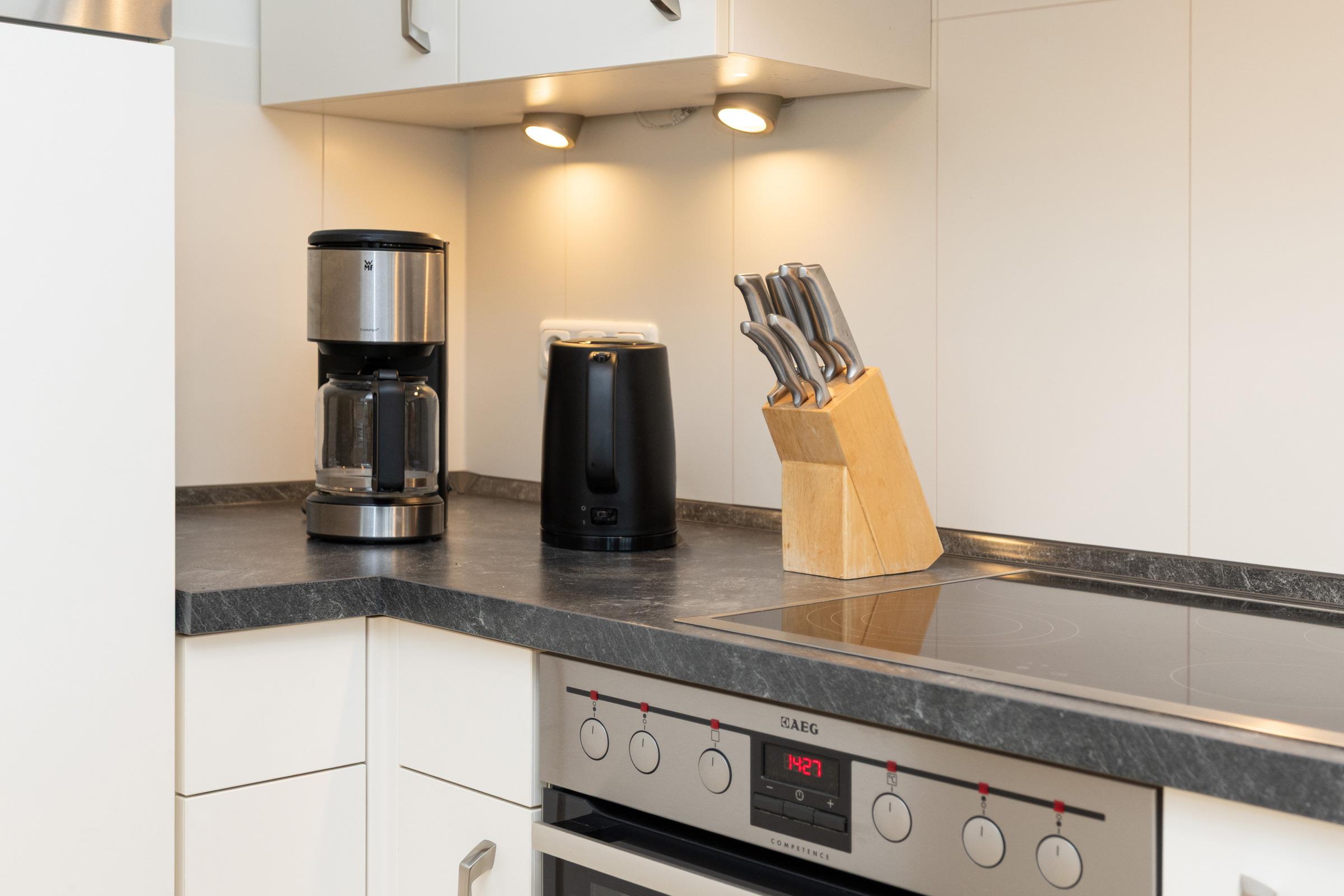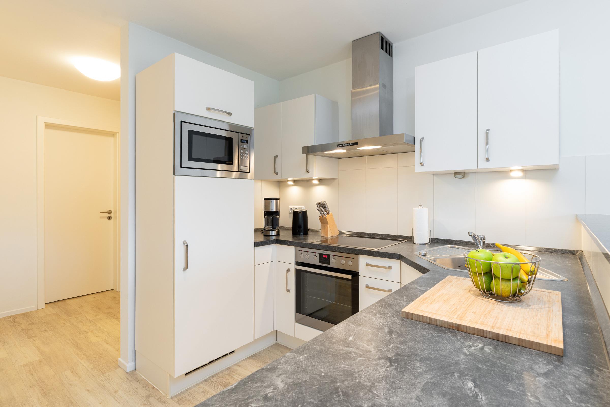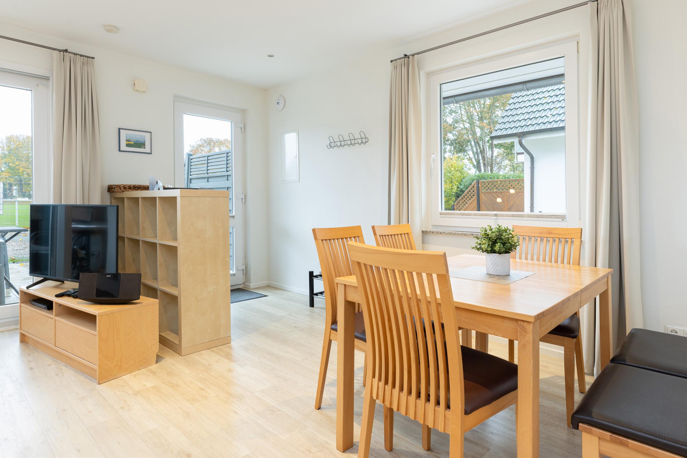 Treten Sie ein in Ihr Apartment und spüren Sie sofort Urlaubsfreude. Ihr Blick fällt direkt auf die offene Winkelküche mit modernsten Elektrogeräten auch für gehobene Qualitätsansprüche. Die Naturholz-Esstisch-Gruppe mit Bank und Stühlen wirkt warm und einladend. Von der Sofaecke mit Schlaffunktion genießen Sie den Blick ins Grüne. Flachbild-TV und Regal bieten eine harmonische Raumtrennung.