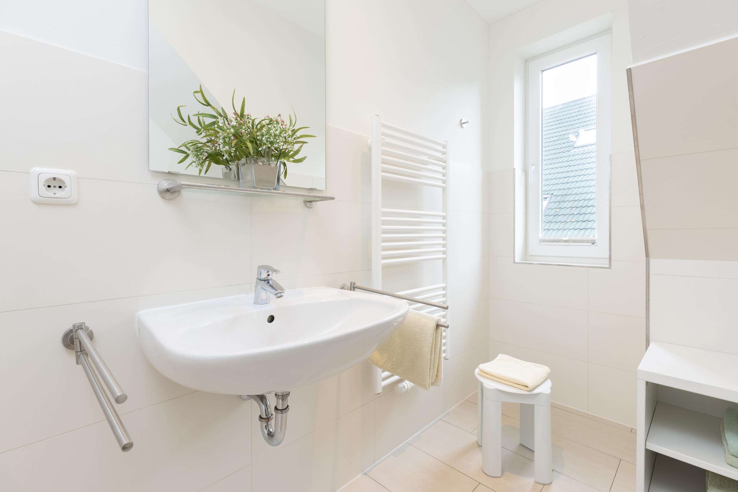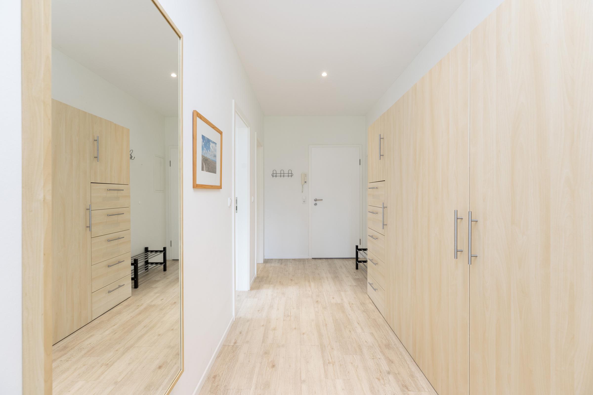 Vom Flurbereich mit großem Schrank gelangen Sie in beide Schlafzimmer oder ins Bad. Ein Schlafraum ist eingerichtet mit Doppelbett je 90 x 200 cm + Schrank und der zweite mit je einem Bett von 90 x 200 cm. Das Bad mit Tageslicht wirkt groß und Echtglasdusche, weiße Objekte mit Accessoires und Handtuch-Heizkörper unterstreichen den modernen Komfort-Charakter.