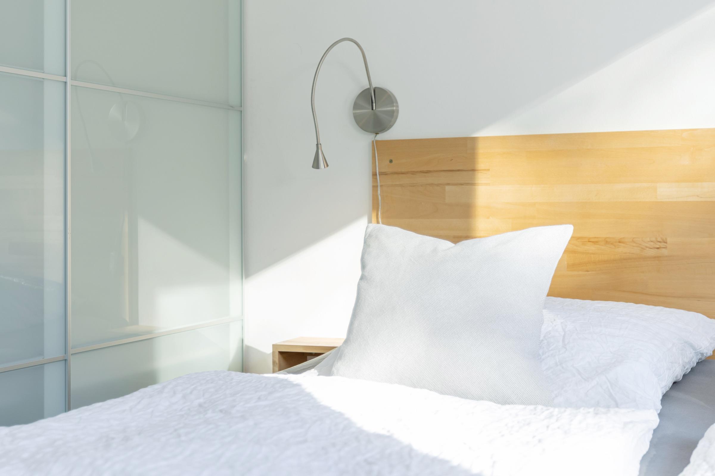 Das Schlafzimmer hat ein Doppelbett mit je 90 x 200 cm + Kleider-Schiebeschrank. Das Bad ist hell gefliest und lässt viel Morgensonne durch das Dachfenster. Echtglasdusche und weiße Objekte mit Handtuch-Heizkörper sowie schöne Accessoires wirken einladend.