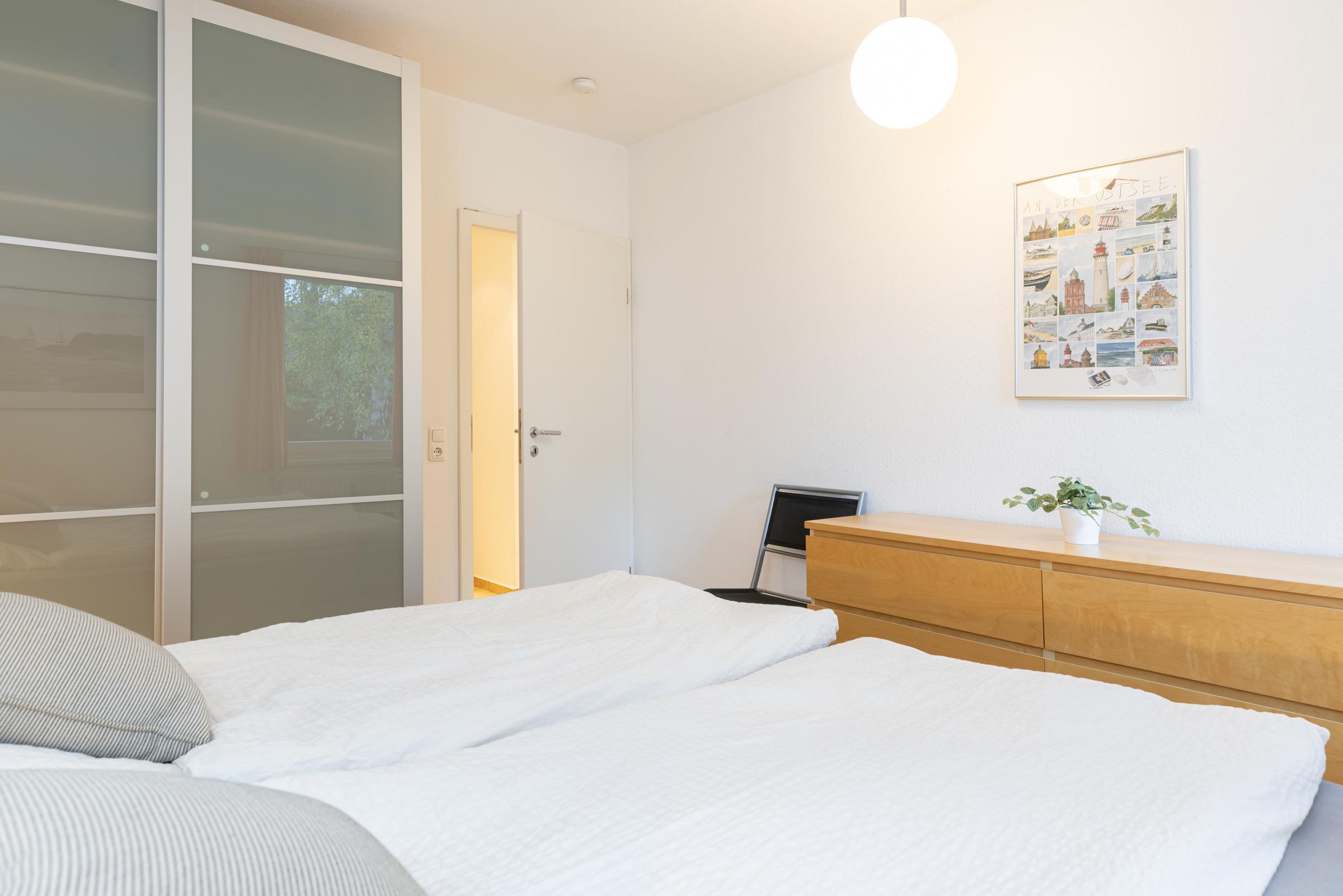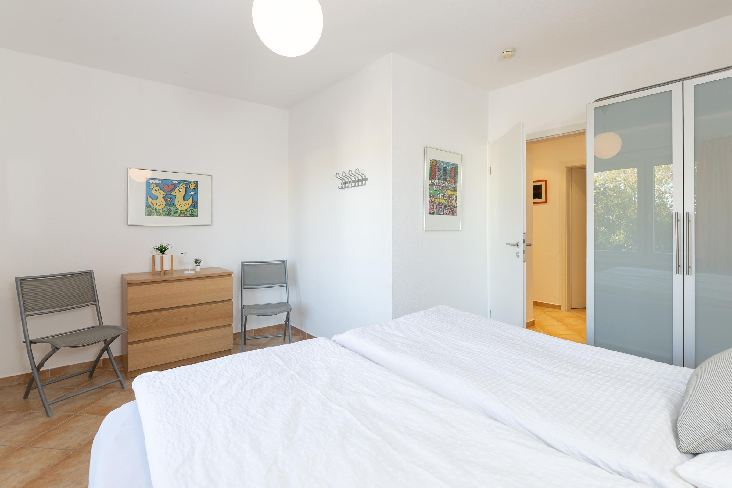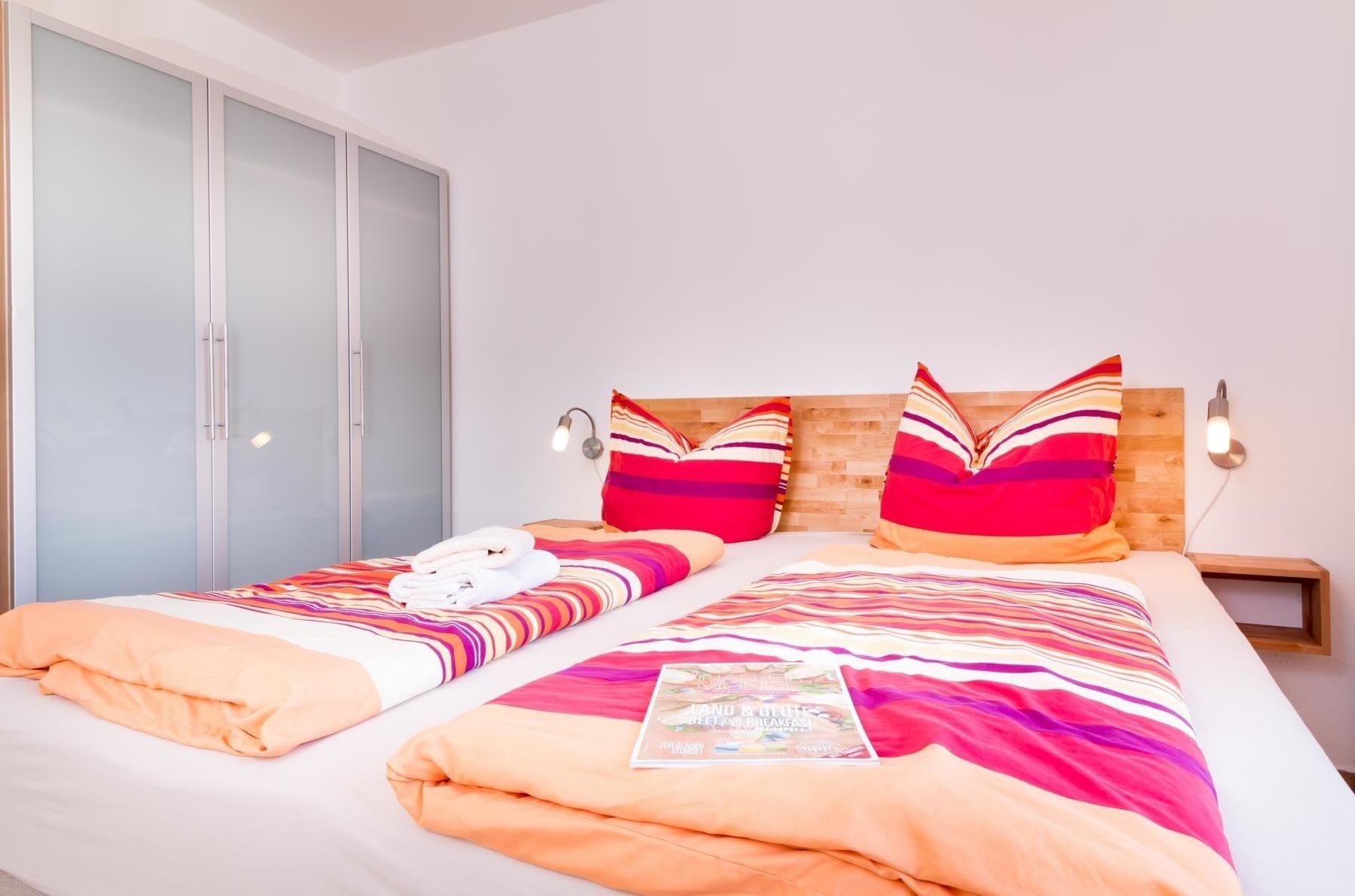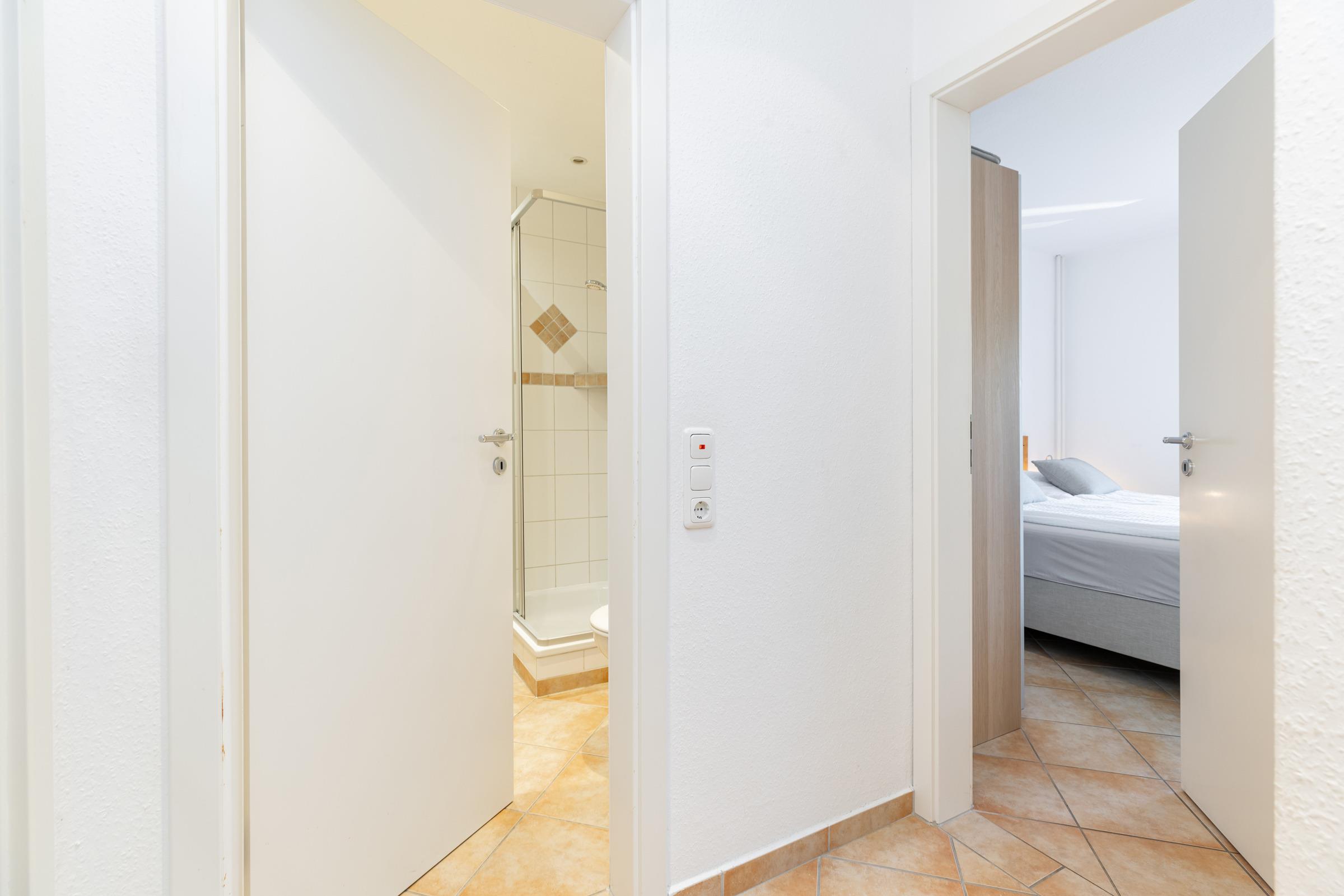 Durch einen schmalen Flur kommen Sie zu den Schlafräumen, Duschbad und Gäste-WC. Das erste Schlafzimmer besteht aus einem Doppelbett (Boxspring, je 90 x 200 cm), Kleiderschrank und Kommode. Das zweite Schlafzimmer hat ebenfalls ein Doppelbett (Boxspring, je 90 x 200 cm) und einen Kleiderschrank.