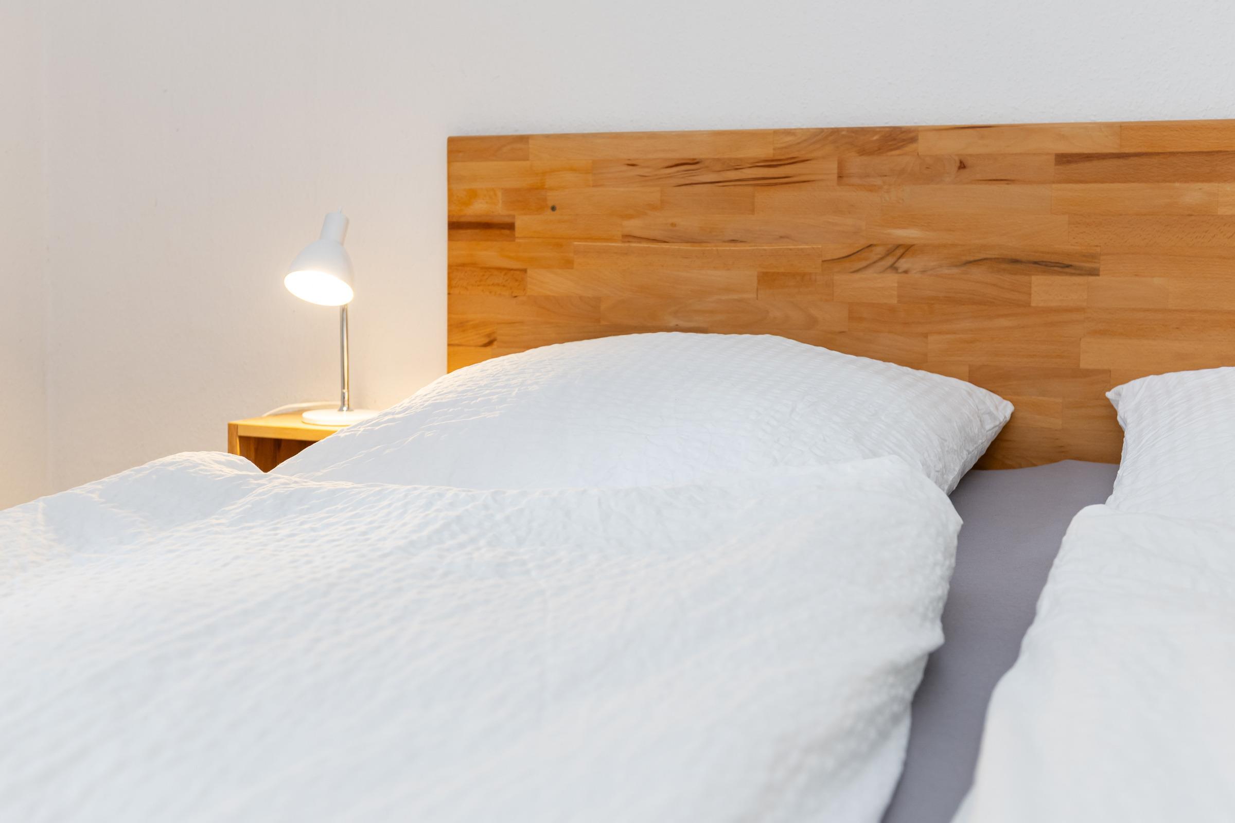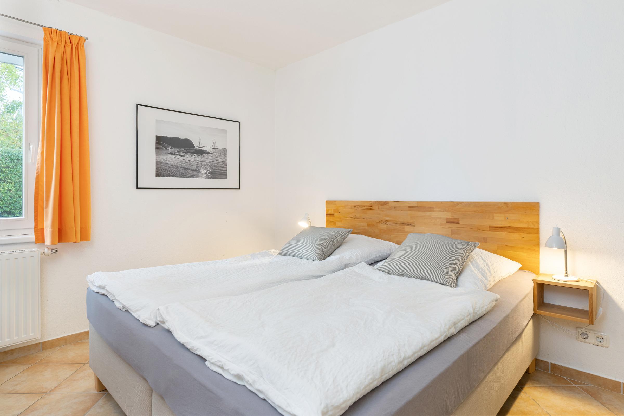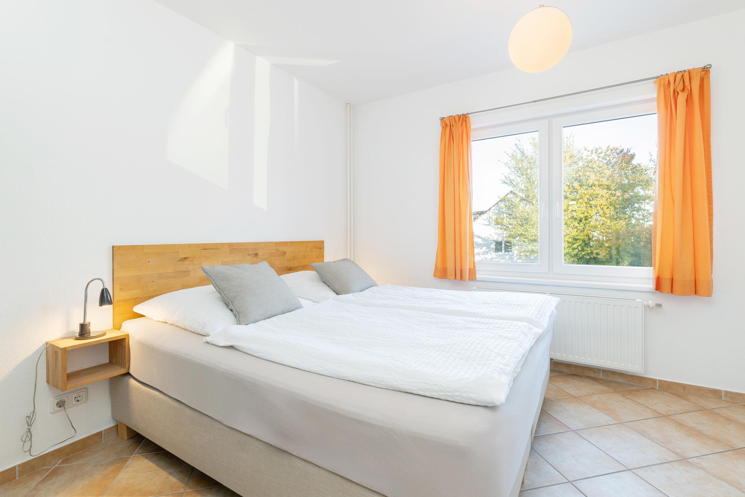 Durch einen schmalen Flur kommen Sie zu den Schlafräumen, Duschbad und Gäste-WC. Das erste Schlafzimmer besteht aus einem Doppelbett (Boxspring, je 90 x 200 cm), Kleiderschrank und Kommode. Das zweite Schlafzimmer hat ebenfalls ein Doppelbett (Boxspring, je 90 x 200 cm) und einen Kleiderschrank.