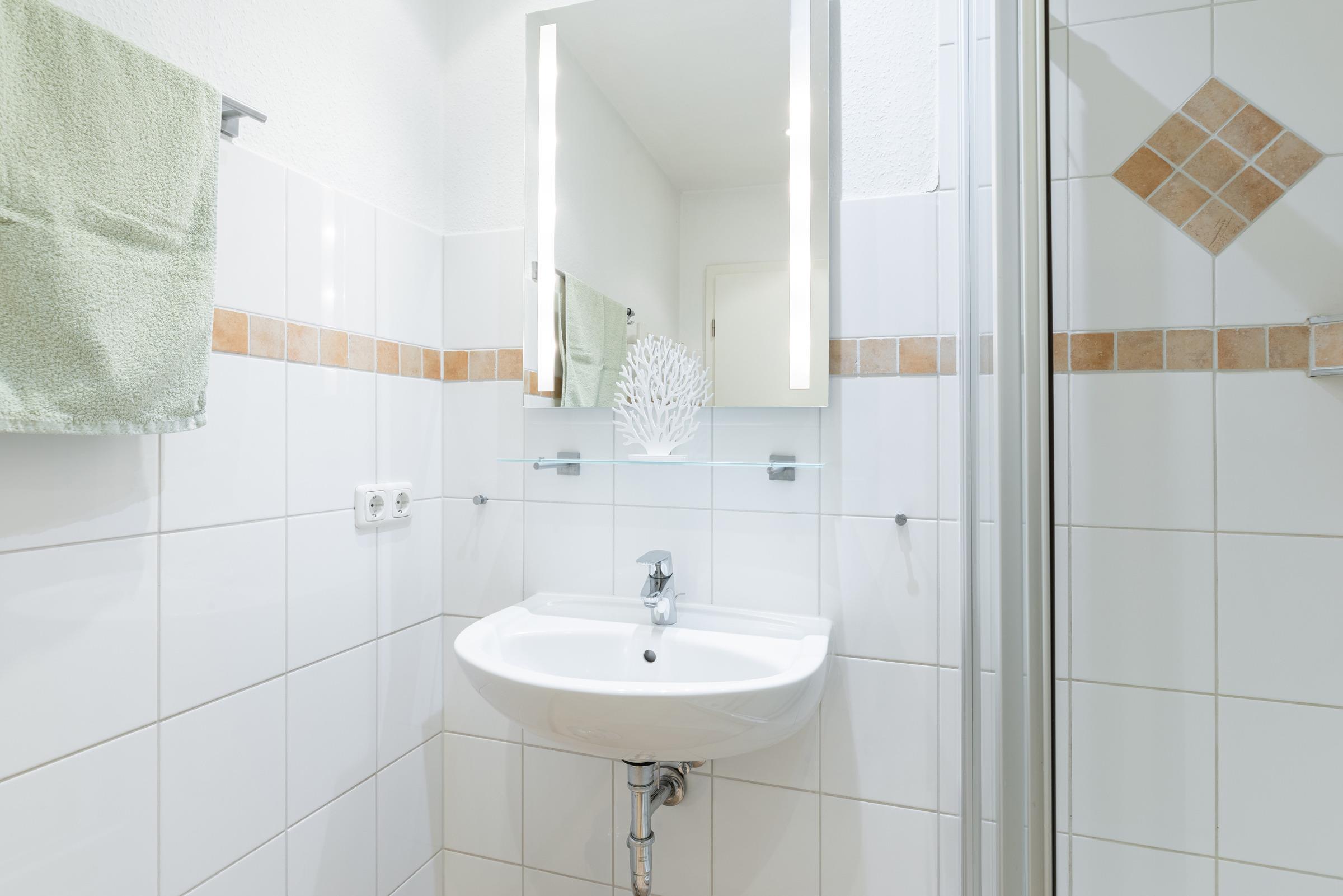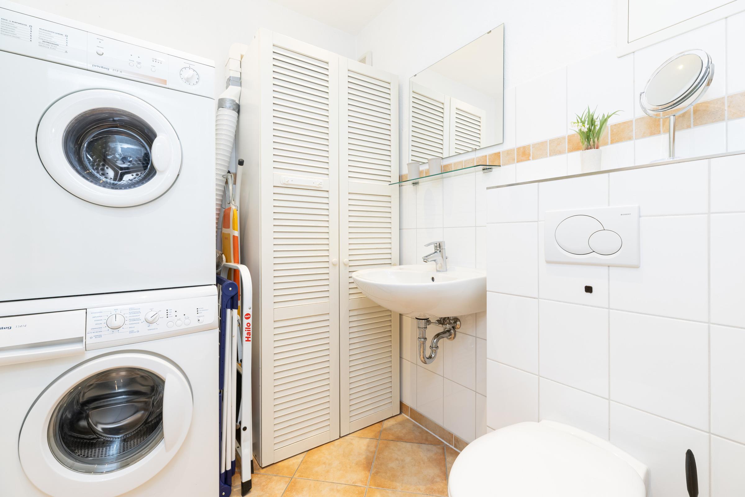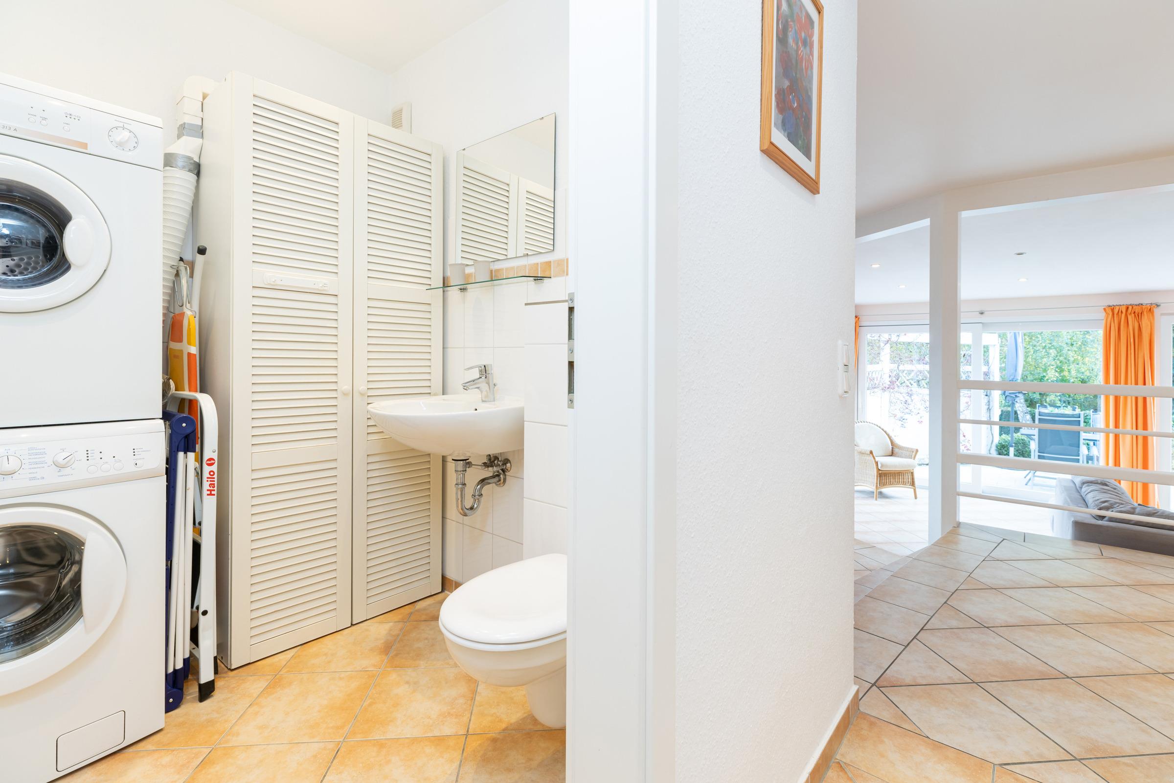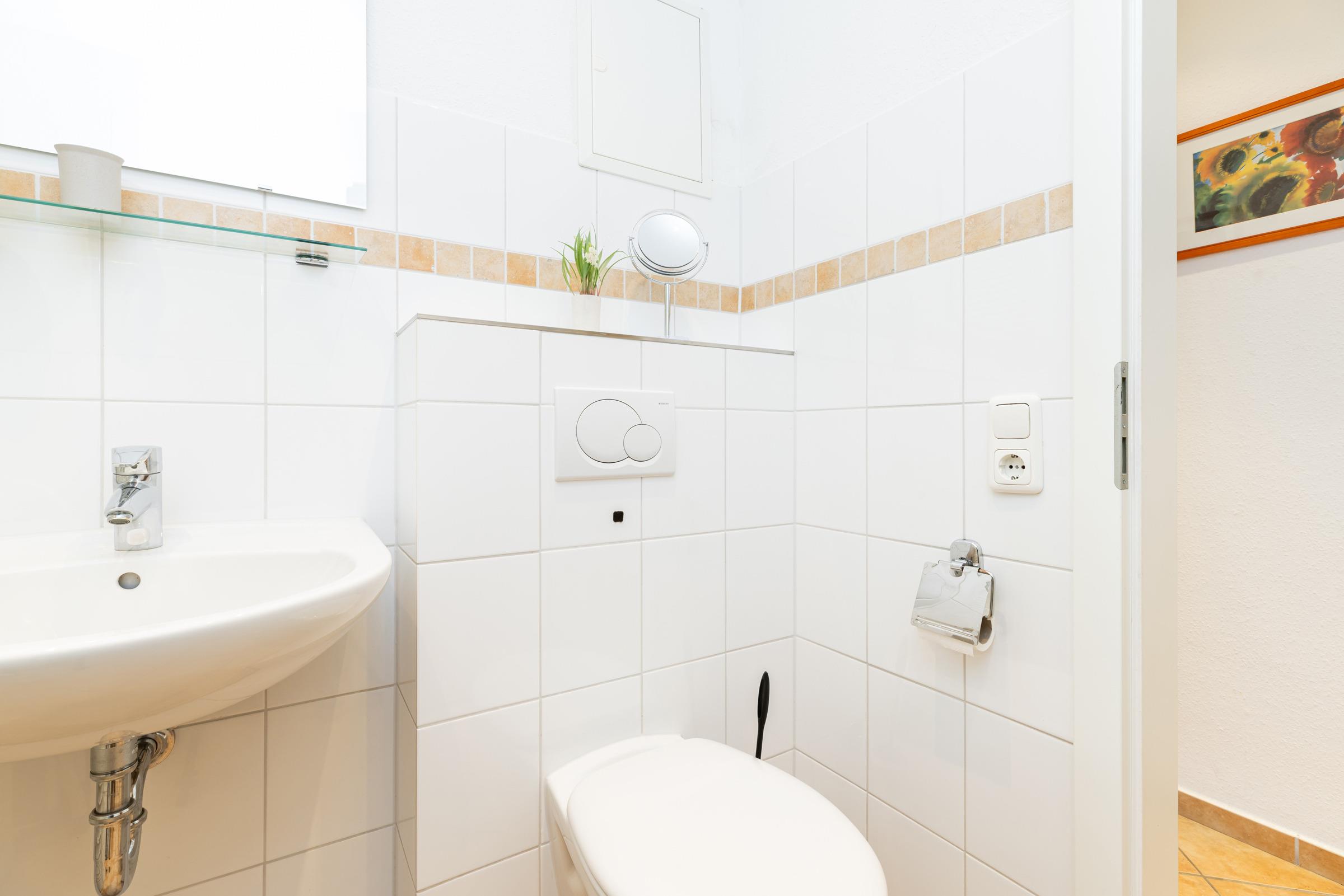 Durch einen schmalen Flur kommen Sie zu den Schlafräumen, Duschbad und Gäste-WC. Das erste Schlafzimmer besteht aus einem Doppelbett (Boxspring, je 90 x 200 cm), Kleiderschrank und Kommode. Das zweite Schlafzimmer hat ebenfalls ein Doppelbett (Boxspring, je 90 x 200 cm) und einen Kleiderschrank.
