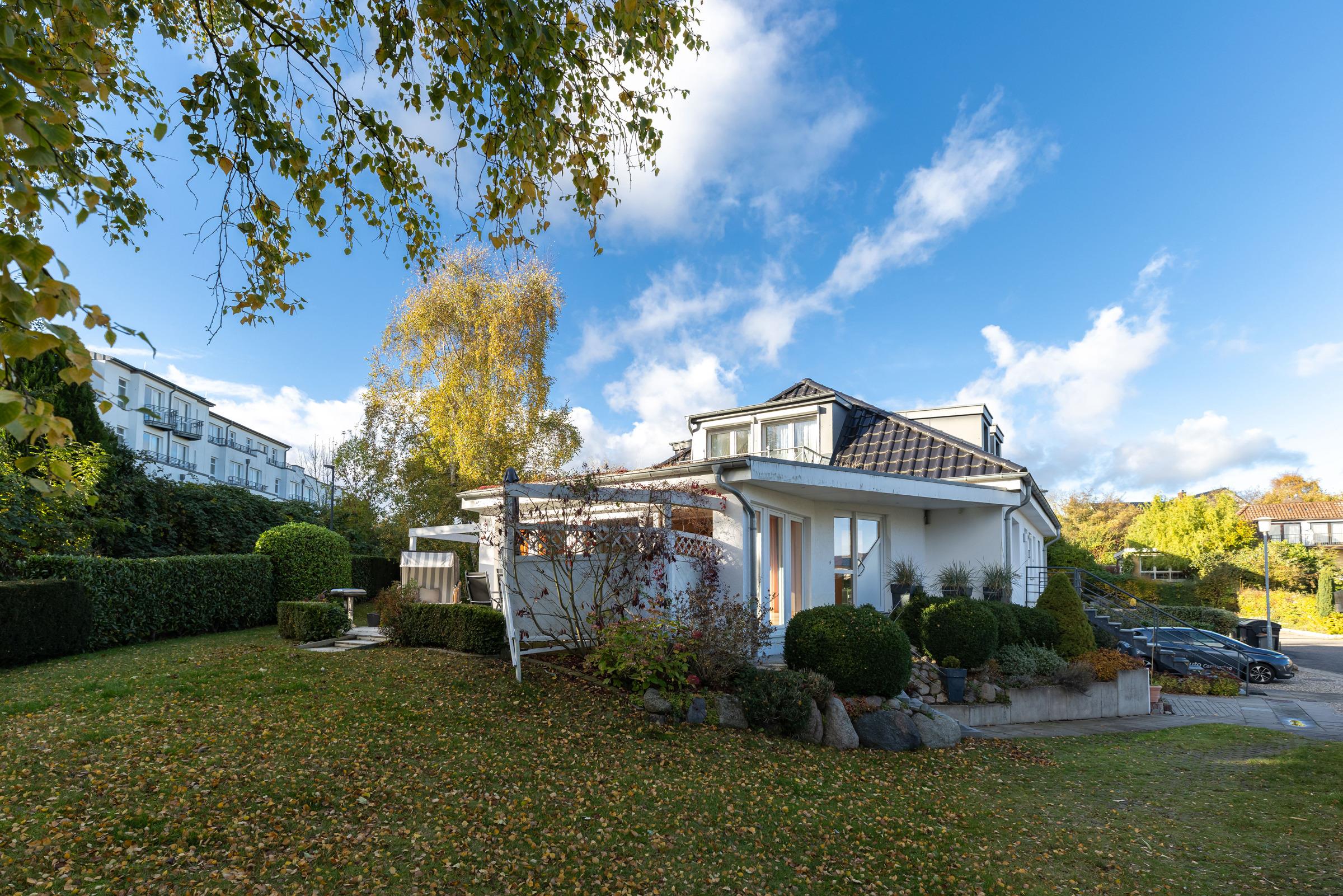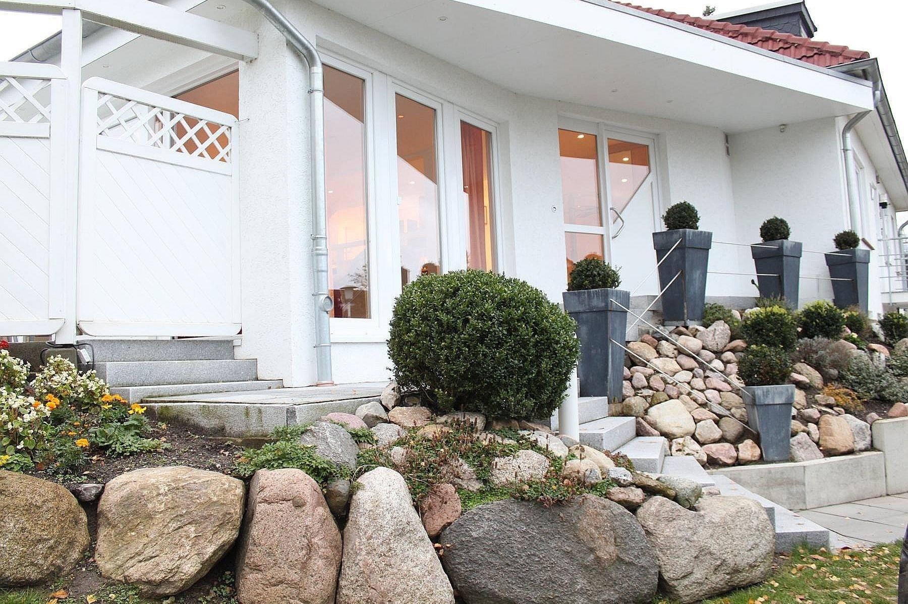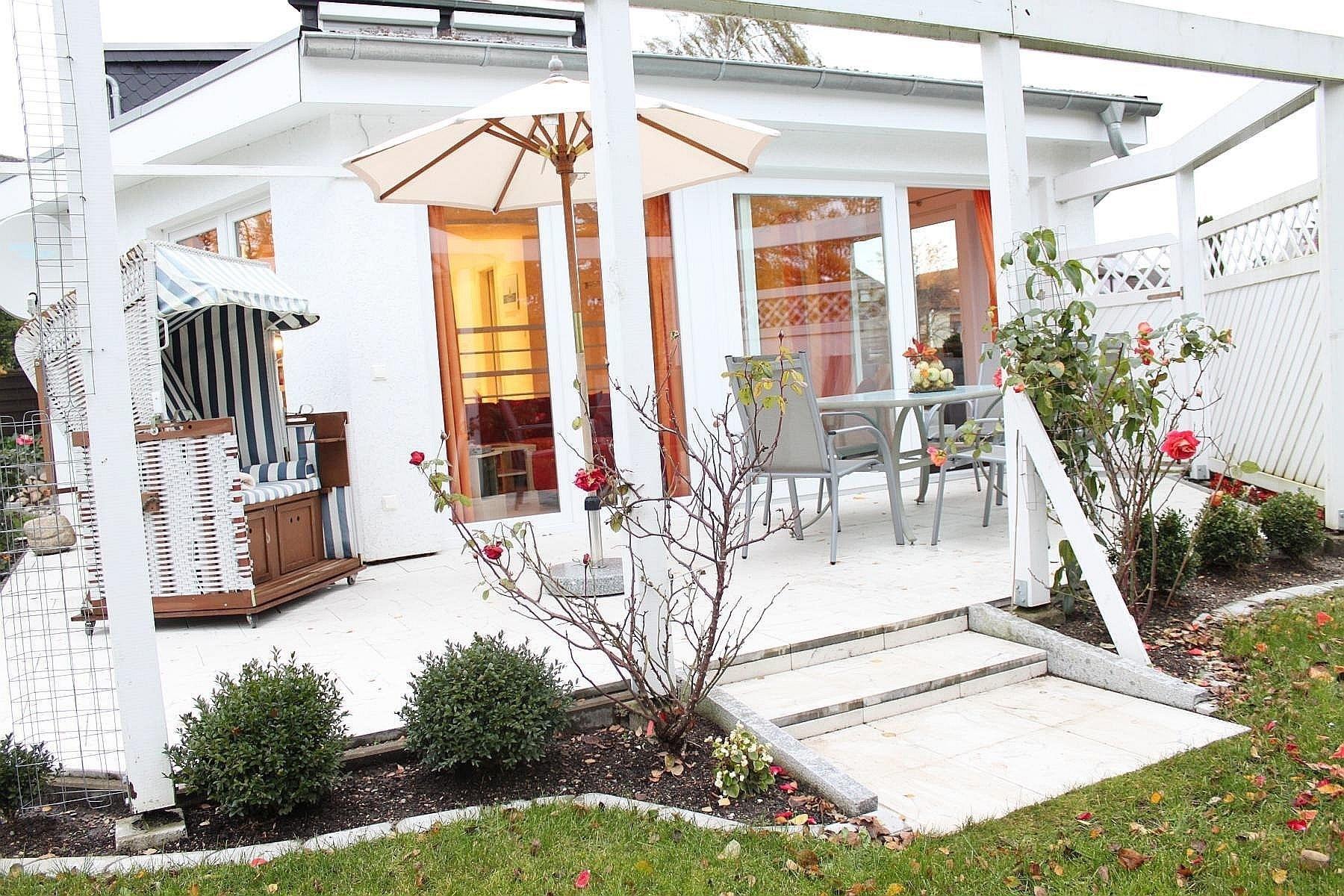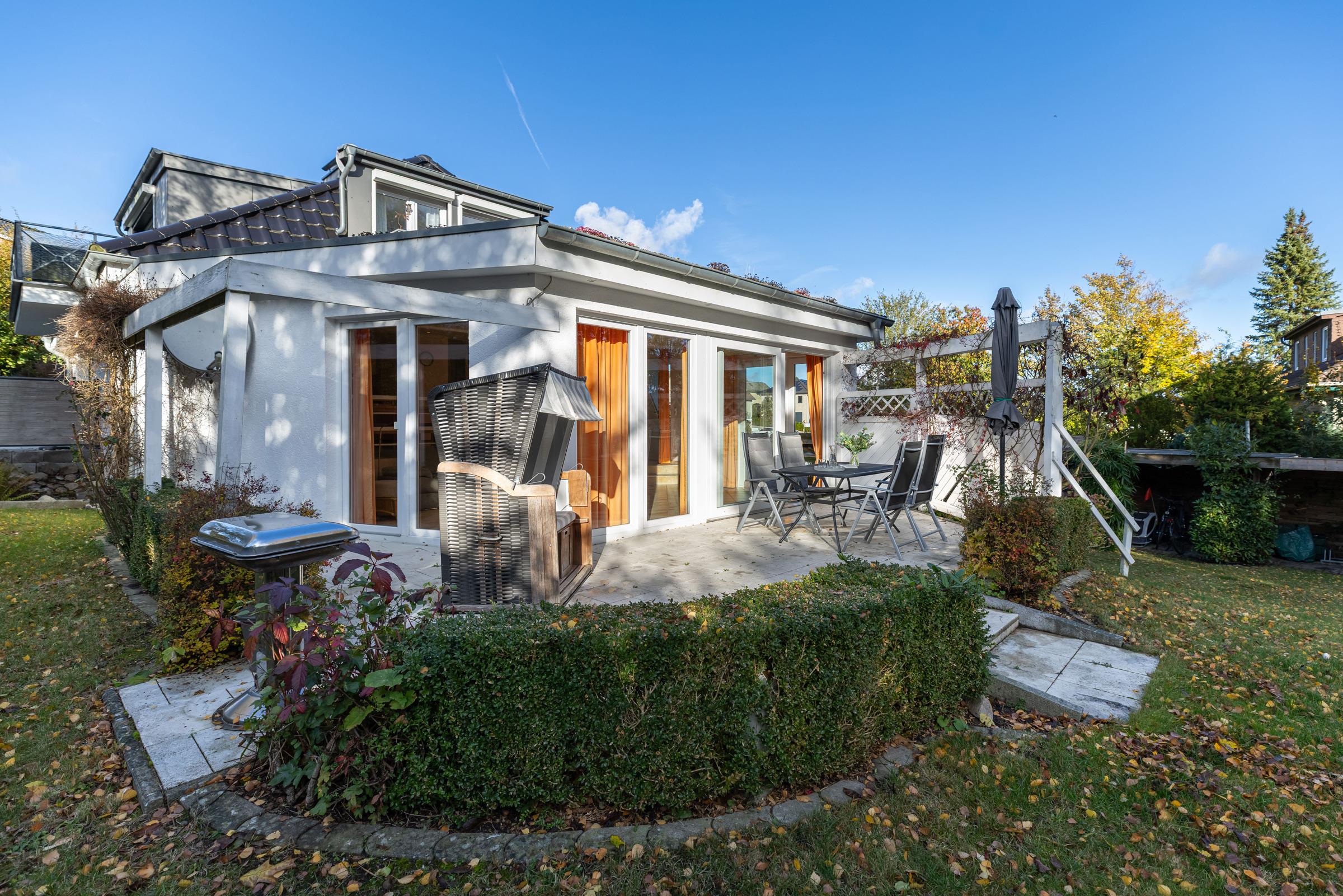 Atmosphäre in der Idylle einer ruhig gelegenen Nebenstraße. Großer Garten mit Terrasse und Grillplatz. Zentrumsnähe und dennoch nur 10 Gehminuten zum Ostsee-Strand und Wellenbad.
