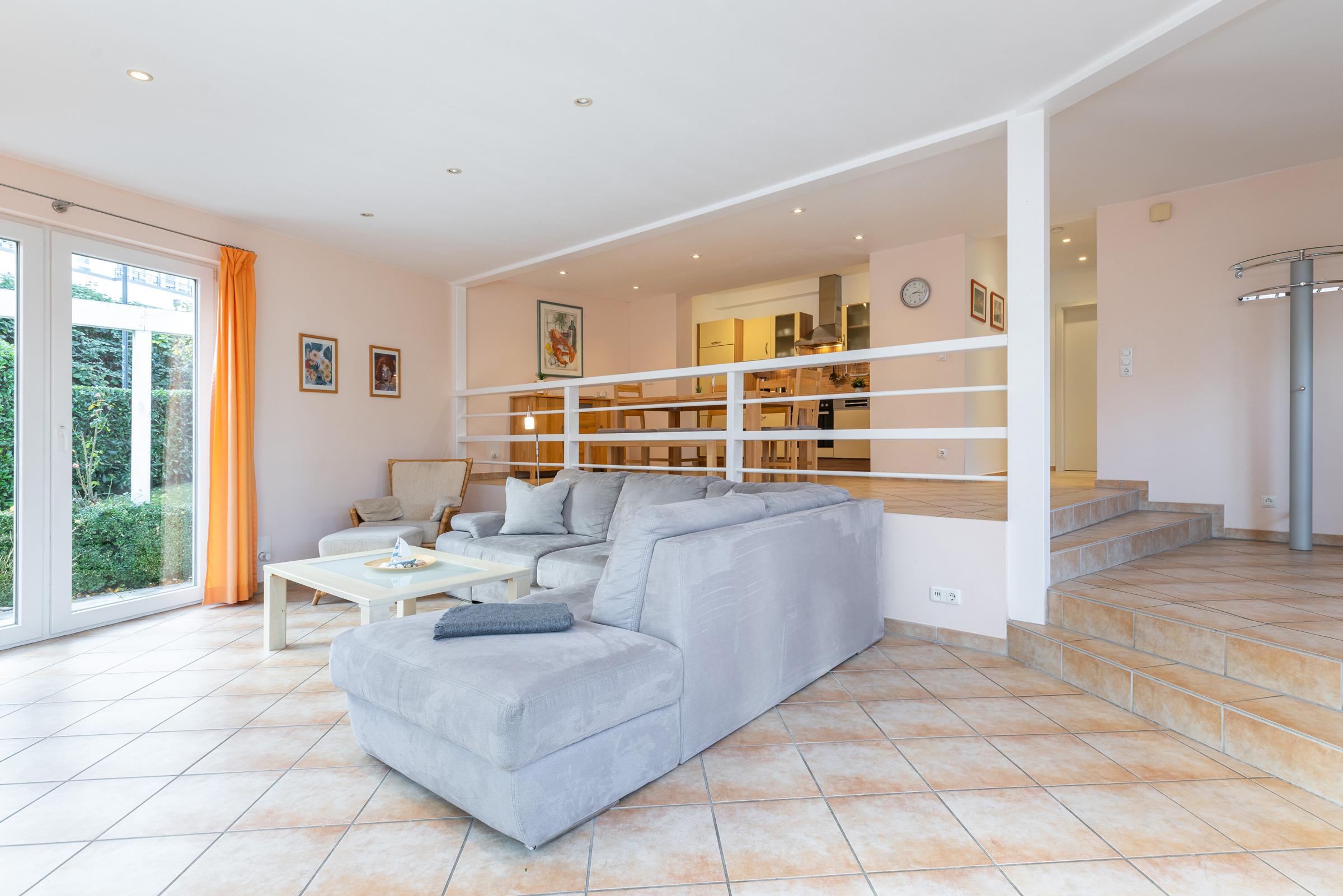Schon beim Eintreten in den großzügigen Wohnraum empfinden Sie eine besondere Urlaubsfreude. In der oberen Galerie sitzen Sie nah der Küchenzeile am Essplatz und genießen den uneingeschränkten Blick in den Garten und auf die Terrasse u.a. mit Strandkorb und Grill.
