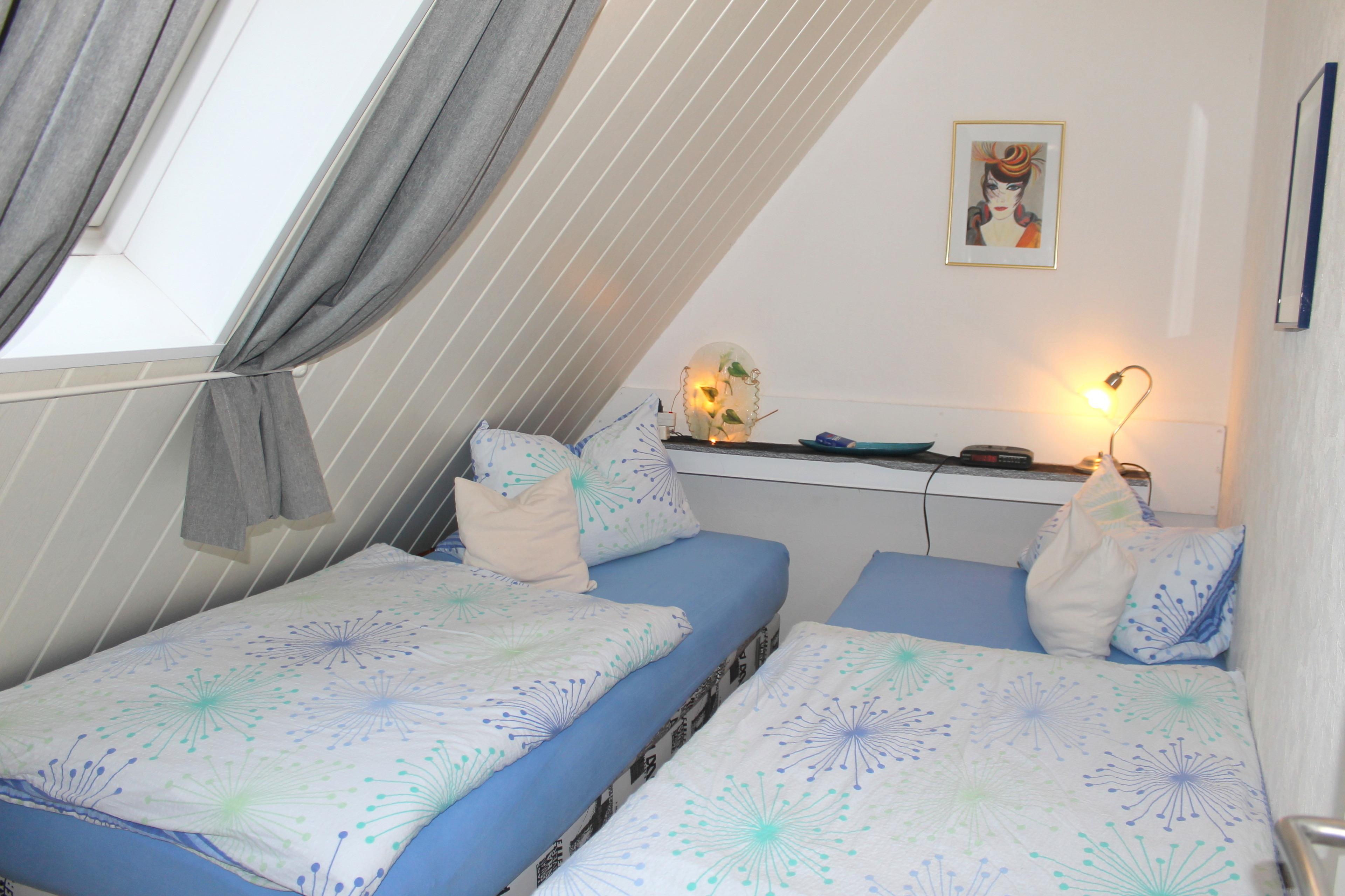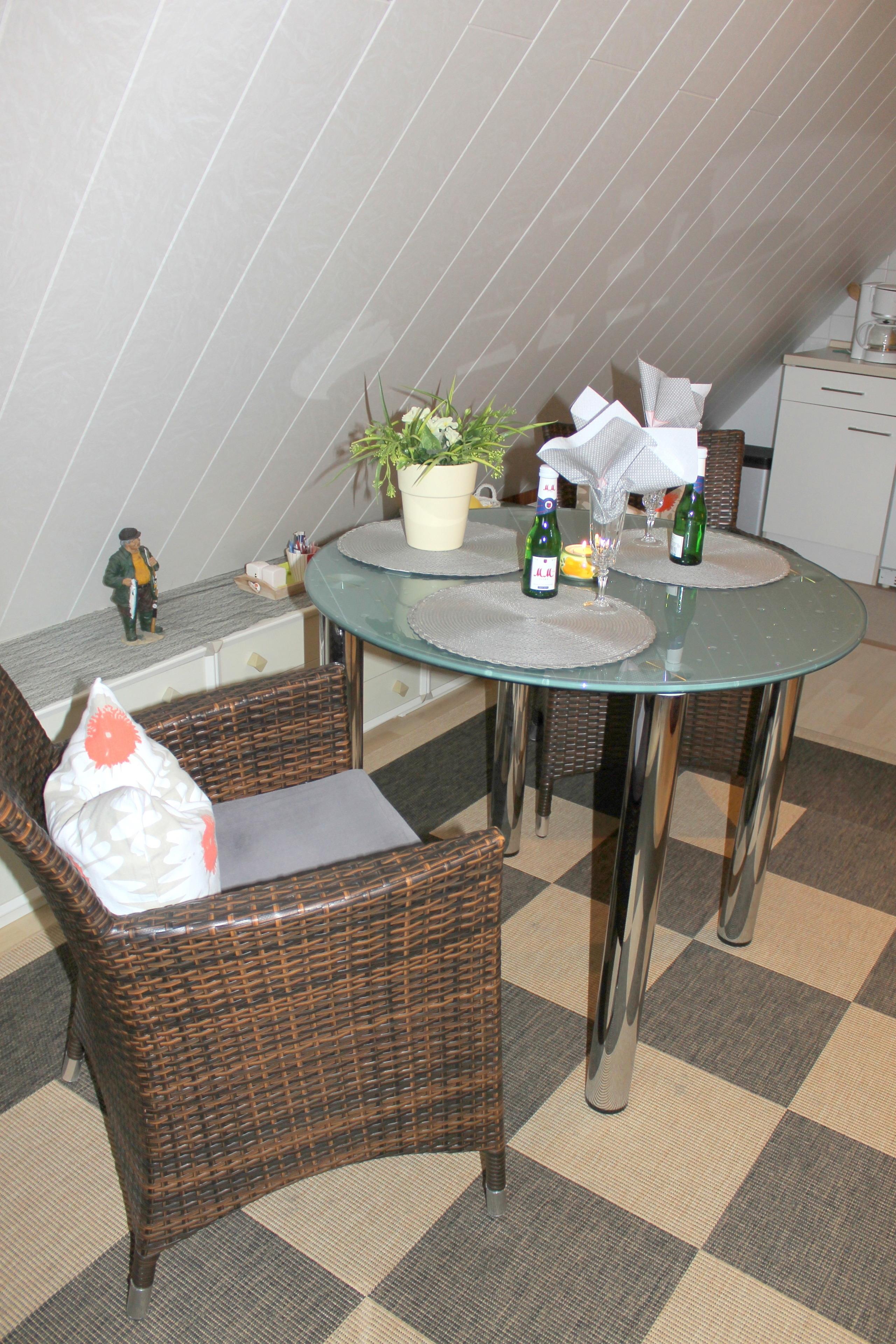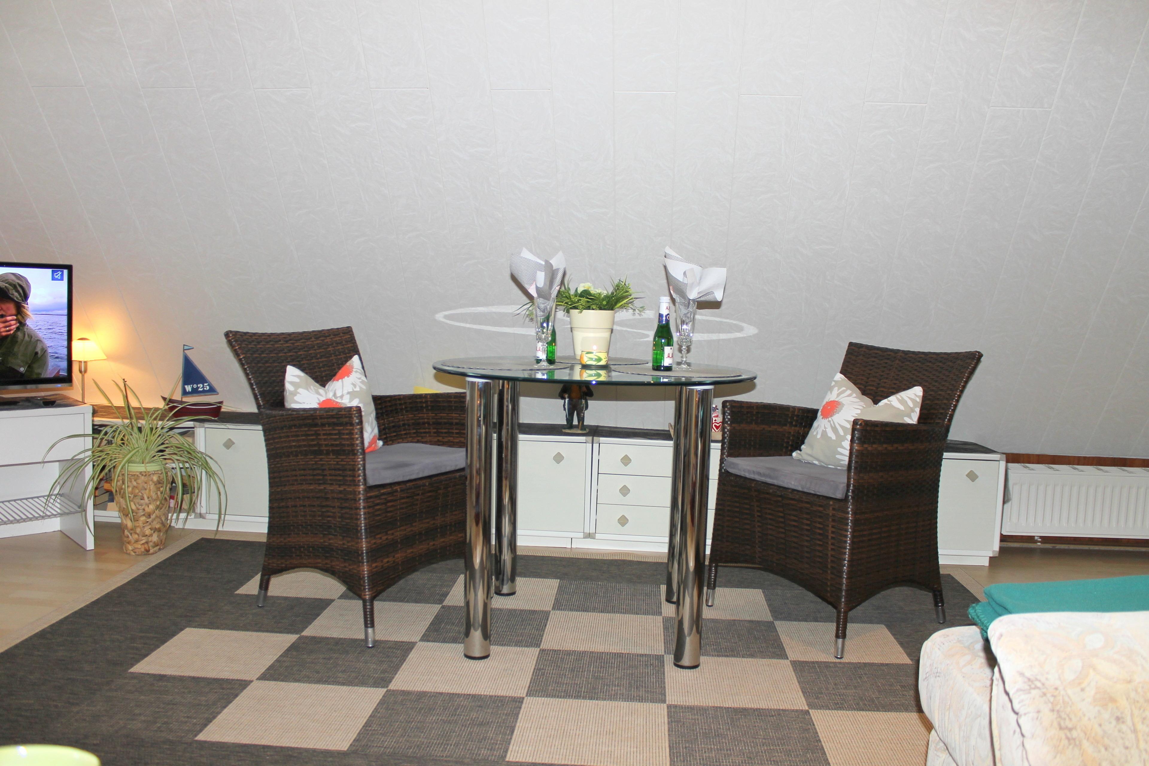 Die Wohnung befindet sich in einer kleinen Wohnanlage mit nur sechs Wohneinheiten. Sie liegt in der zweiten Etage mit Dachschrägen und bietet Platz für zwei Personen. Der Wohnbereich besteht aus einer gemütlichen Sitzecke mit zwei Zweisitzercouchen, Flachbild-TV mit SAT-TV, DVD-Player, Radio, einer offenen kleinen Pantry-Küche sowie einem Essplatz. Hier können Sie entspannen und den Tag ausklingen lassen. Von hier aus haben Sie Zugang zum möblierten und windgeschützten kleinen Balkon, der Ihnen zusätzlichen Platz zum Entspannen bietet.