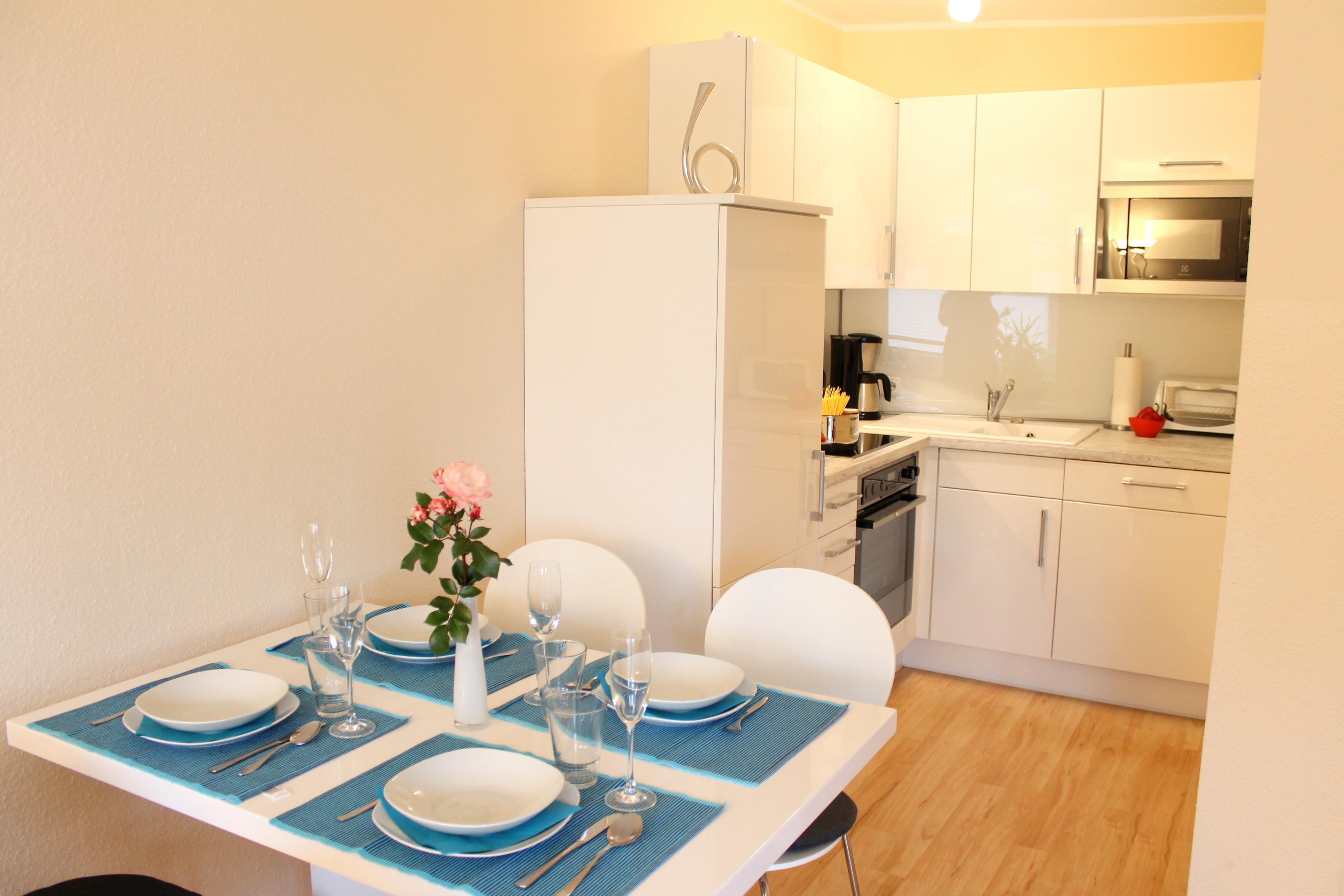 Die hochwertige Ausstattung dieser Ferienwohnung überzeugt: Der Wohnbereich mit Flat Screen TV ist mit einer bequemen, hochwertigen Schlafcouch (mit Matratze)ausgestattet. In der modernen Küche finden Sie eine Spülmaschine, Kaffeemaschine, Mikrowelle, Backofen, Wasserkocher und weitere Küchengeräte vor. Die gemütliche Essecke mit Platz für 4 Personen lädt zum ausgiebigen Frühstücken ein. Das separate Schlafzimmer ist mit einem Doppelbett (getrennte Matratzen 1,80 cm x 2 m) und einem großem Kleiderschrank ausgestattet. Fahrstuhl im Haus. Keine Haustiere erlaubt. Waschmaschine und Wäschetrockner gegen Gebühr im Haus. Bettwäsche ist inklusive, ein Handtuchpaket (1 großes Duschhandtuch + 2 kl. Handtücher) kann gemietet werden (s. Preisliste).
