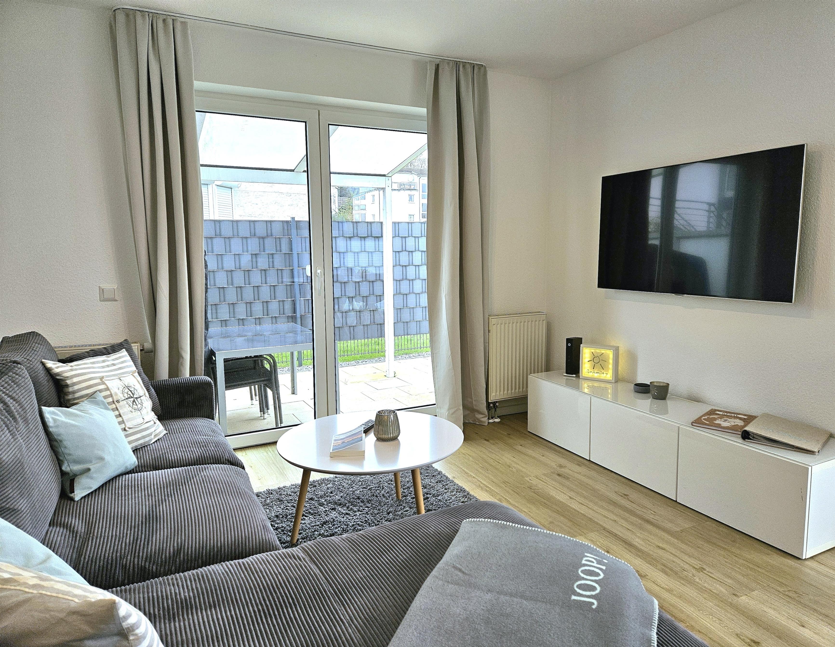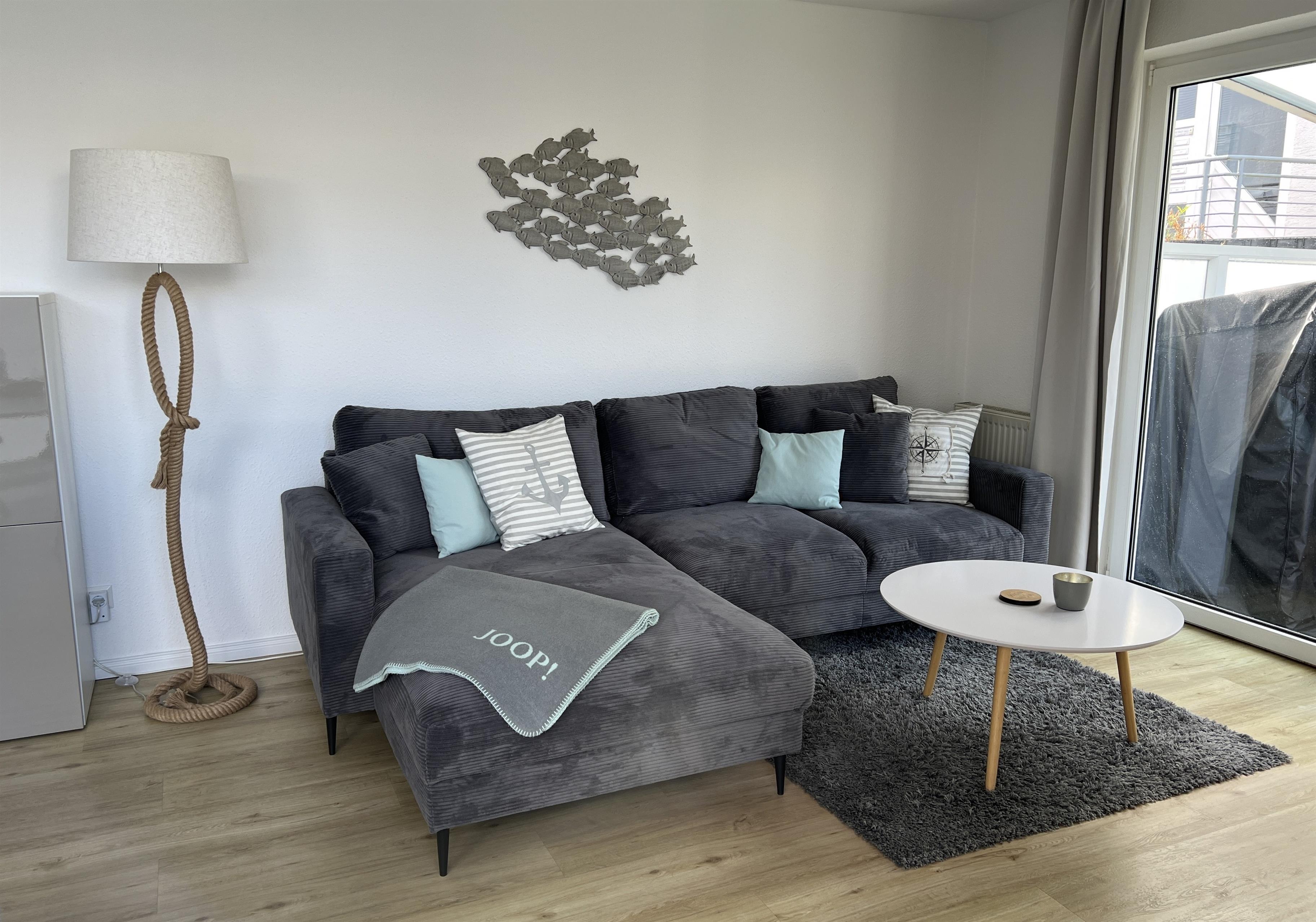 Der Wohnbereich ist mit einer gemütlichen Sitzecke, einem großen Flachbild-TV (Diagonale 140 cm), Sat-TV, W-LAN, DVD-Player und einem Alexa Echo Dot versehen.