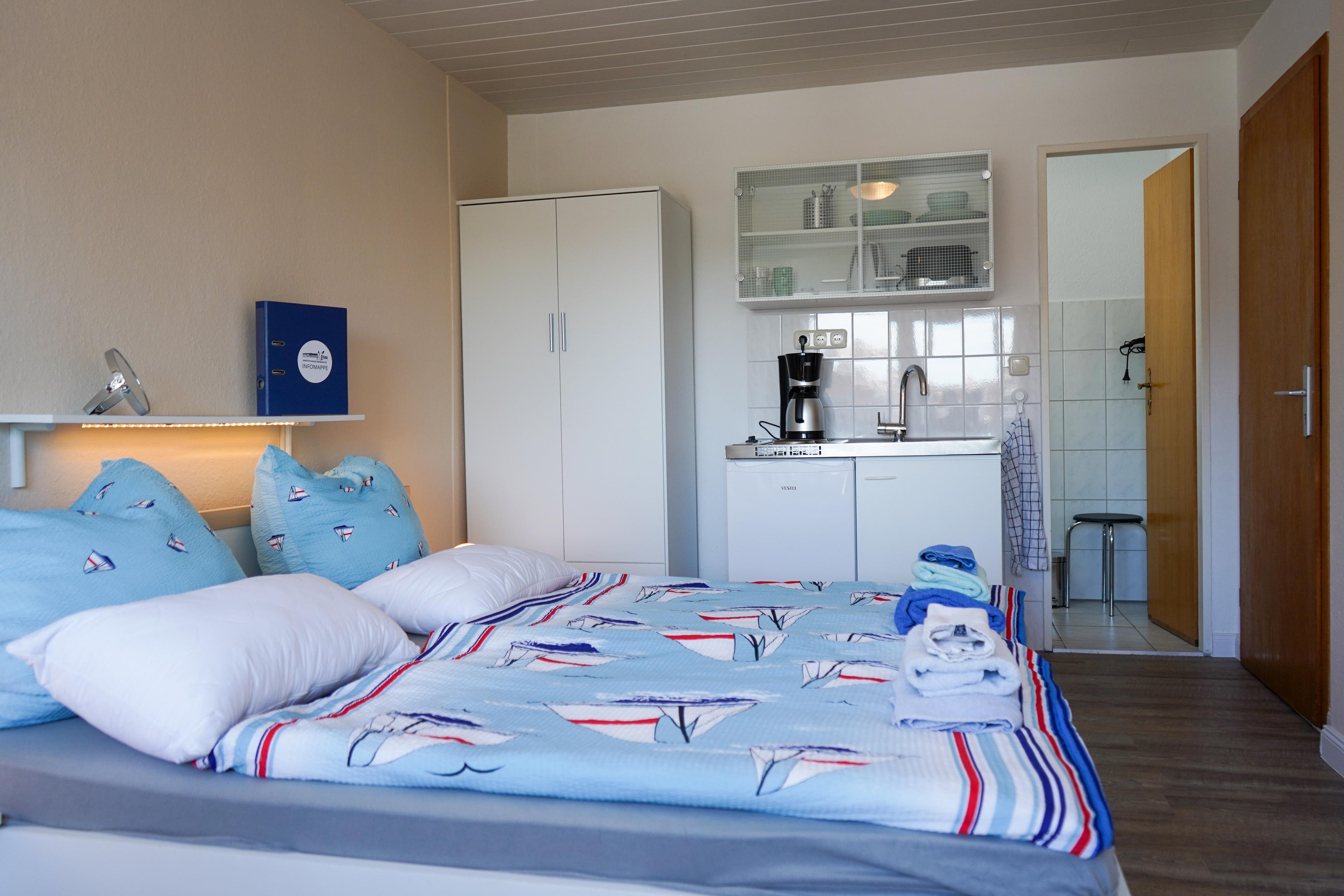 Das Appartement verfügt über eine Pantryküche, ausgestattet mit Kühlschrank, Toaster, Wasserkocher und Mikrowelle, dies ermöglicht es Ihnen, kleine Mahlzeiten zuzubereiten. Das Wohn-/Schlafzimmer ist mit einem gemütlichen Doppelbett, einem TV mit Sat/Kab./DVB-T und einem Balkon/Loggia ausgestattet, auf dem Sie entspannte Stunden verbringen können. Auf der Loggia darf auch geraucht werden.