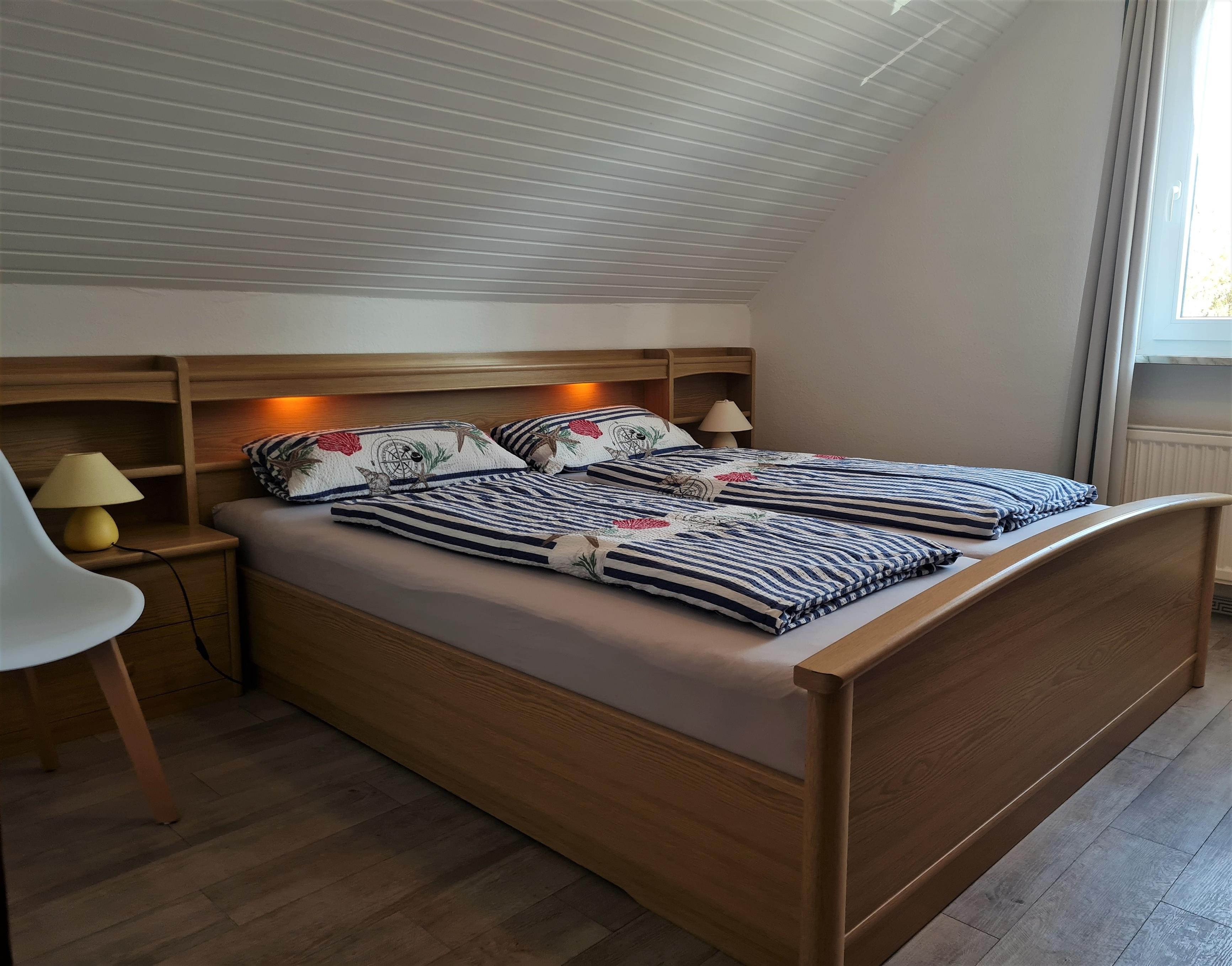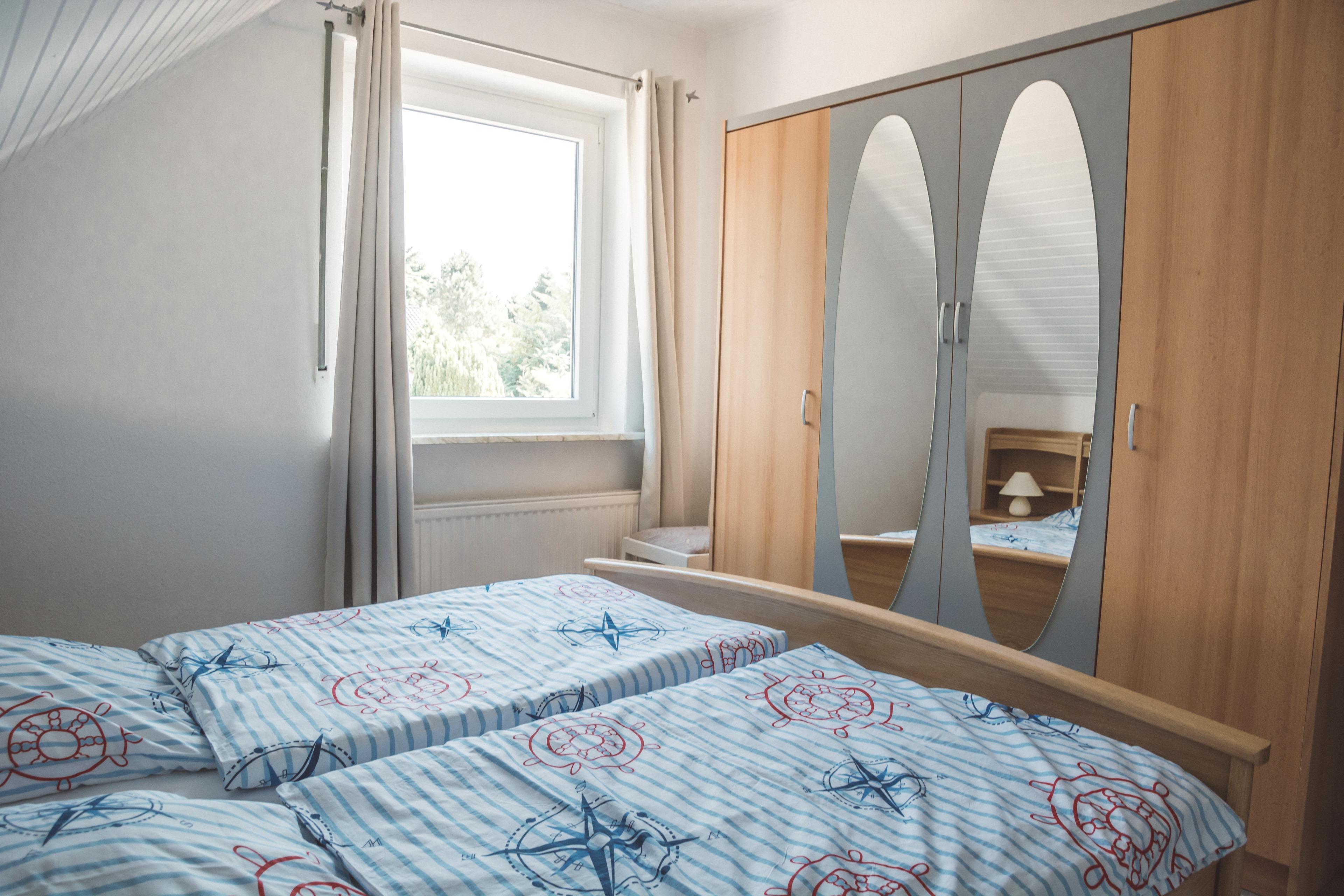 Die beiden Schlafzimmer mit je einem Doppelbett und ausreichend Schrankkapazität verfügen jeweils über Außenrolladen. Sie sind ebenfalls im maritimen Ambiente gehalten.