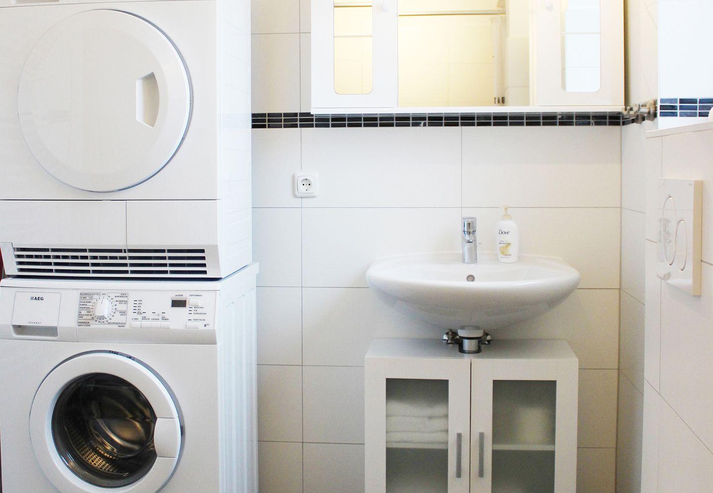 Badezimmer mit Sauna (Münzpflichtig 3Std=1€), kostenfreie Waschmaschinen- und Trocknernutzung, Südwestterrasse mit hochwertigen Gartenmöbeln, PKW Stellplatz und überdachter Fahrradständer am Haus
