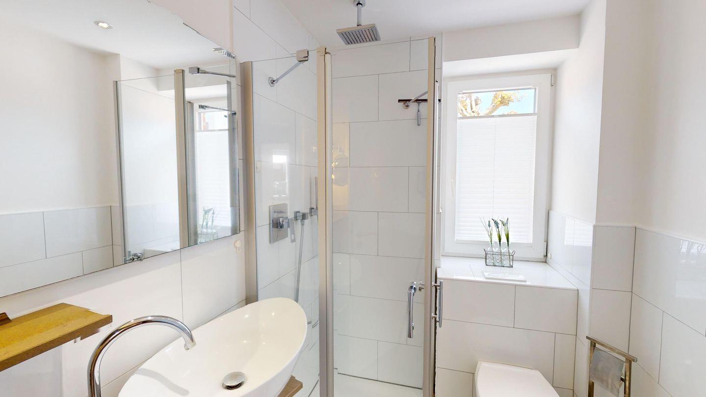 Die beiden Bäder mit großen beleuchteten Wand- und Kosmetikspiegeln sind mit Regenduschen ausgestattet.