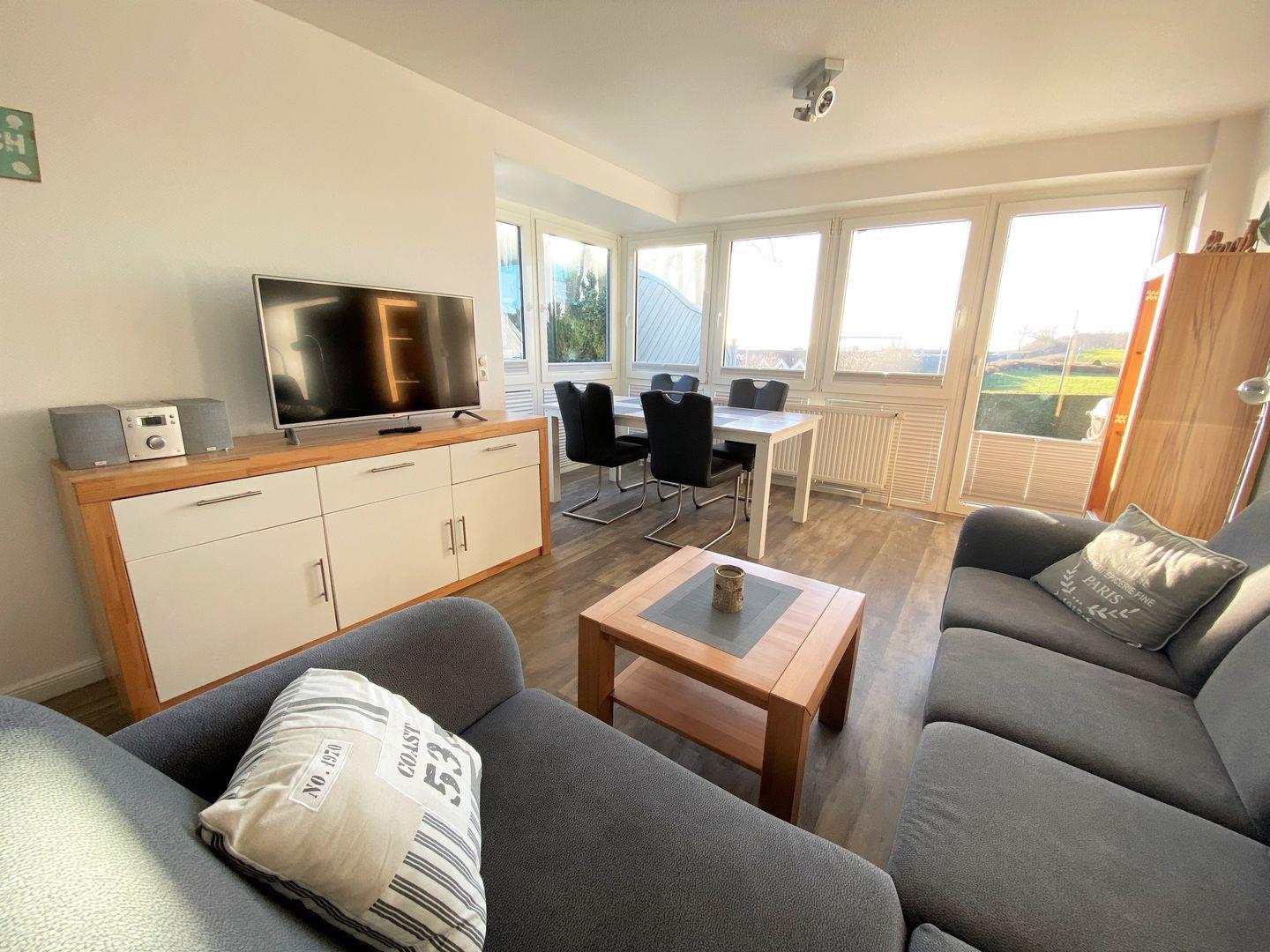 Ein direkter Zugang führt vom Wohnzimmer auf die möblierte Terrasse mit Südwestausrichtung. Genießen Sie zahlreiche Sonnenstunden und die frische Meeresbrise, lassen Sie hier entspannt Ihre Urlaubstage ausklingen.
