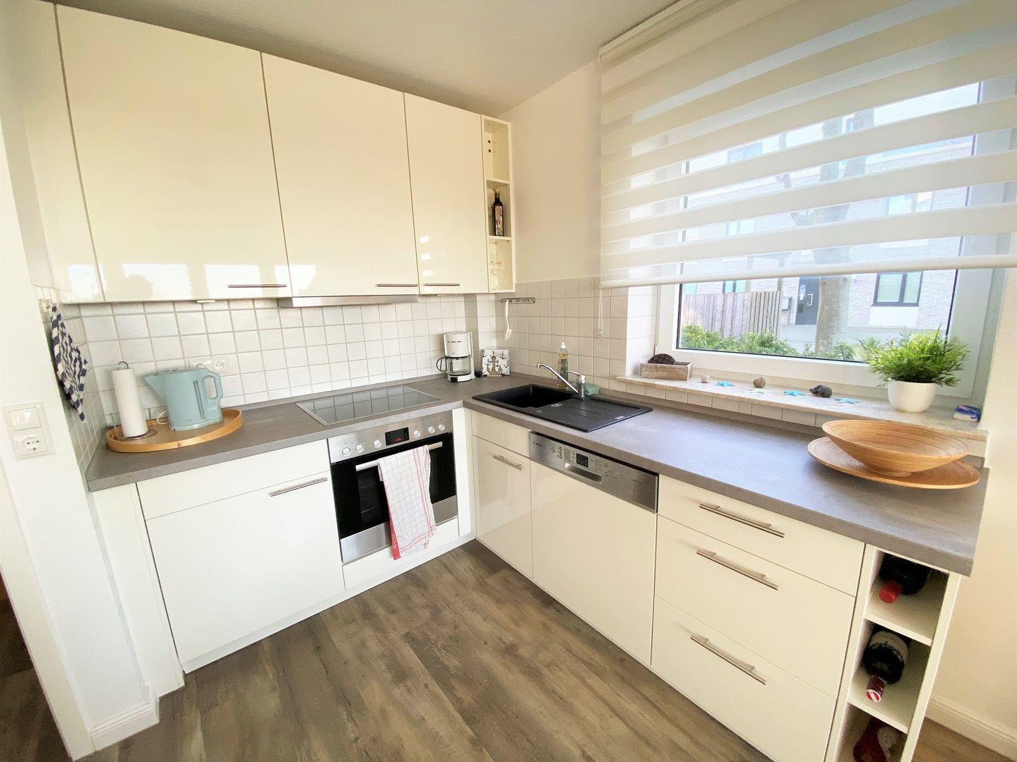 Hell und modern präsentiert sich auch die perfekt ausgestattete Küche mit Spülmaschine, Cerankochfeld, Backofen und Kühlschrank mit Gefrierfach.