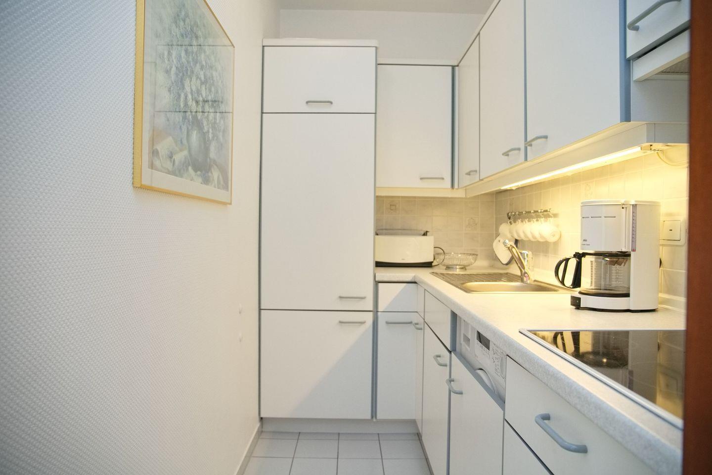 Die Küche ist mit einem Ceranfeld, einem Kühlschrank mit Gefrierfach, einer Kaffeemaschine, einem Wasserkocher und einem Toaster ausgestattet, damit Sie sich problemlos selbst verpflegen können.