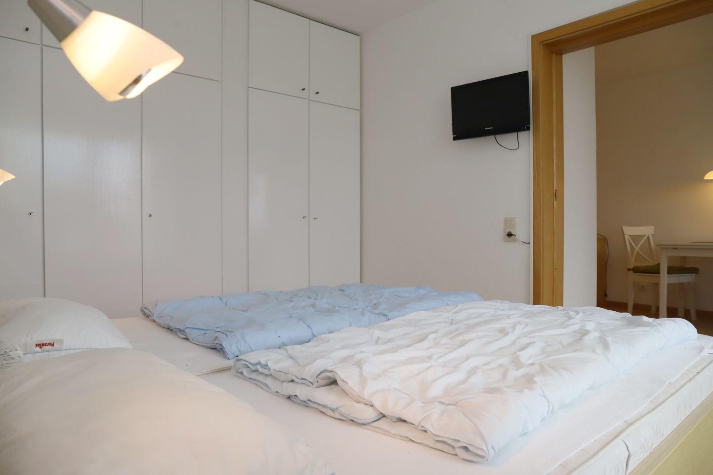 Auf gleicher Ebene zum Wohnbereich bietet Ihnen die Wohnung ein Schlafzimmer mit einem Doppelbett, 2 x 90 x 200 cm sowie einen weiteren Flach TV und ein Badezimmer mit Dusche und WC.