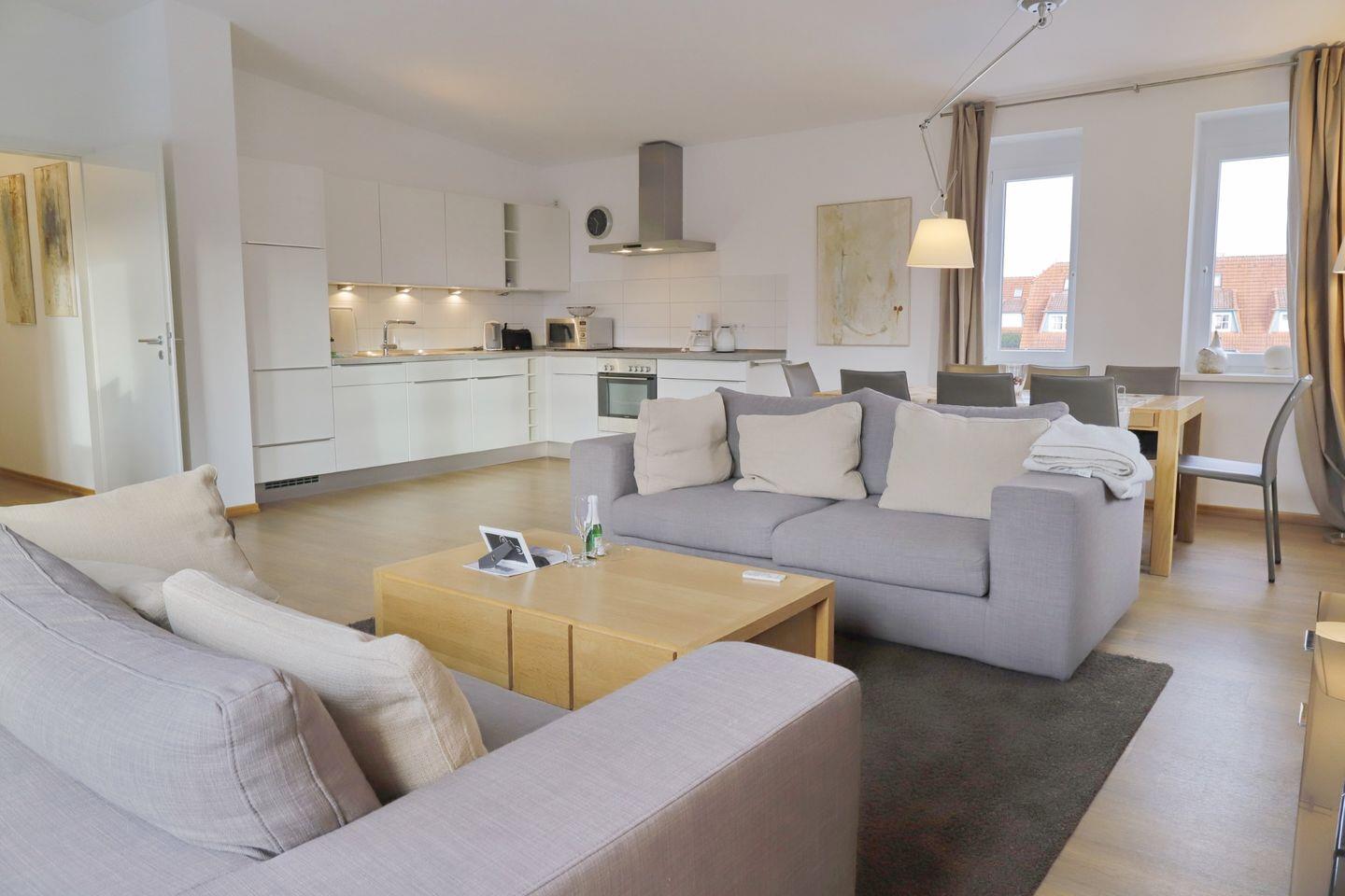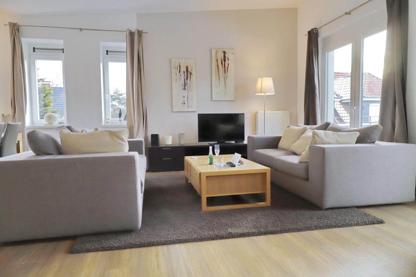 Das Wohnzimmer ist lichtdurchflutet und großzügig gestaltet. Hier finden Sie zwei gemütliche Zweisitzer und einen Flachbild-TV für Ihre Unterhaltung. Der absolute Höhepunkt ist der Zugang zur möblierten Dachterrasse, von der aus Sie den Tag mit einem ausgiebigen Frühstück beginnen können. Der Blick auf die Umgebung und die frische Meeresluft sorgen für einen perfekten Start in den Tag.