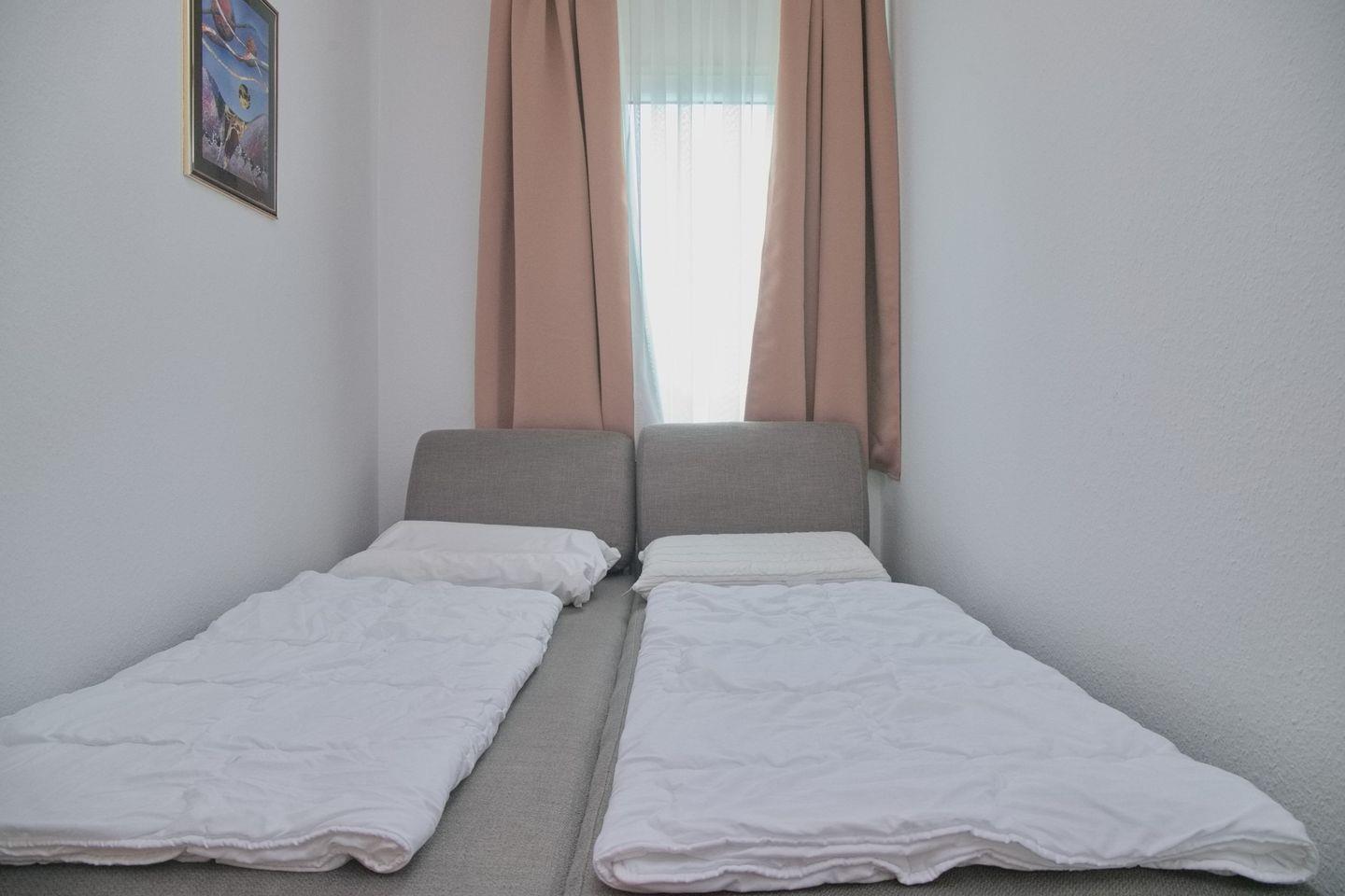 Das Schlafzimmer ist mit einer weiteren Schlafcouch ausgestattet, die ausgezogen eine Liegefläche von 160x200 cm bietet. Ein geräumiger Kleiderschrank und Verdunkelungsgardinen sorgen für zusätzlichen Komfort. Bitte beachten Sie, dass das Zimmer bei ausgezogener Couch recht eng wird und der Zugang zum Bett nur über das Fußende möglich ist.
