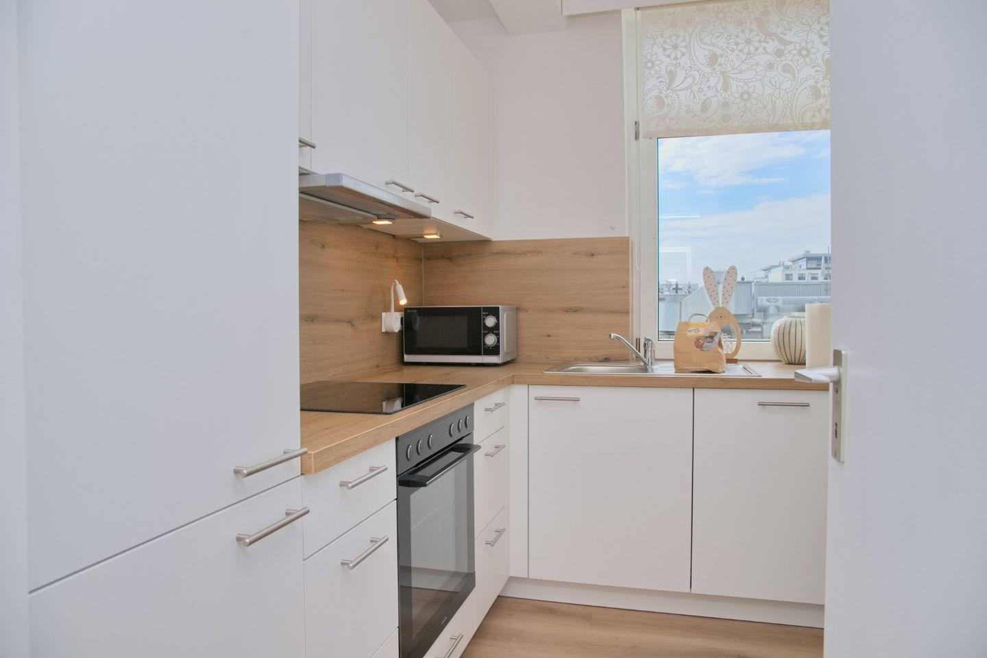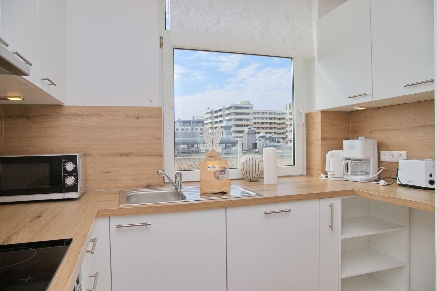 Die separate Küche ist voll ausgestattet und lässt keine Wünsche offen. Sie finden ein Cerankochfeld, einen Backofen, einen Geschirrspüler sowie einen Kühlschrank mit integriertem Gefrierfach. Für Ihre täglichen Bedürfnisse stehen außerdem eine Mikrowelle, eine Kaffeemaschine, ein Wasserkocher und ein Toaster bereit. Hier können Sie sich nach Lust und Laune selbst versorgen.