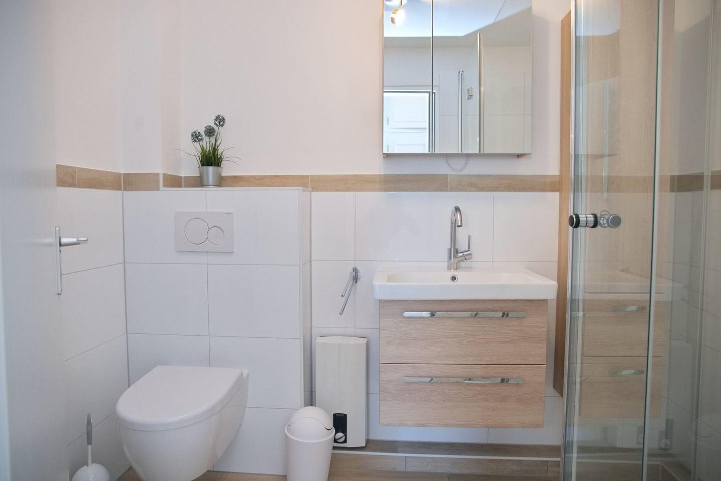 Das moderne Badezimmer ist mit einer Dusche, einem WC und einem Waschtisch ausgestattet. Eine Handtuchheizung sorgt für zusätzlichen Komfort, besonders an kühleren Tagen. Ein zusätzliches Gäste-WC steht ebenfalls zur Verfügung und macht die Wohnung auch bei voller Belegung besonders praktisch.