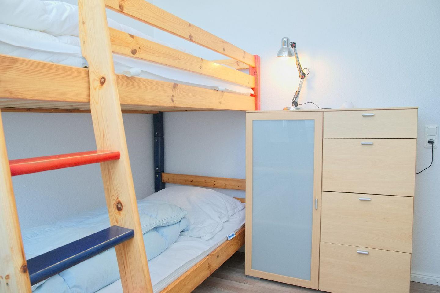Im Kinderzimmer steht ein flexibles Einzelbett, das sich bei Bedarf zu einem Doppelbett (Matratzengröße 2x 90x200 cm) ausziehen lässt – eine praktische Lösung für Familien mit Kindern oder Freunde, die gemeinsam reisen.