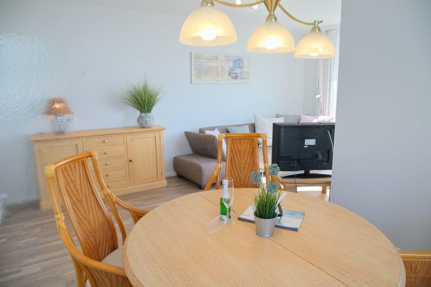 Der Wohnbereich ist großzügig gestaltet und verfügt über eine gemütliche Eckcouch, die ideal ist, um sich nach einem Tag am Strand zu entspannen. Ein moderner Flachbild-TV und eine stilvolle Kommode ergänzen die Einrichtung. Der Essbereich bietet Platz für vier Personen und lädt zu gemeinsamen Mahlzeiten oder entspannten Spieleabenden ein.