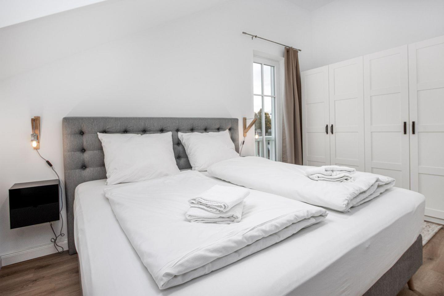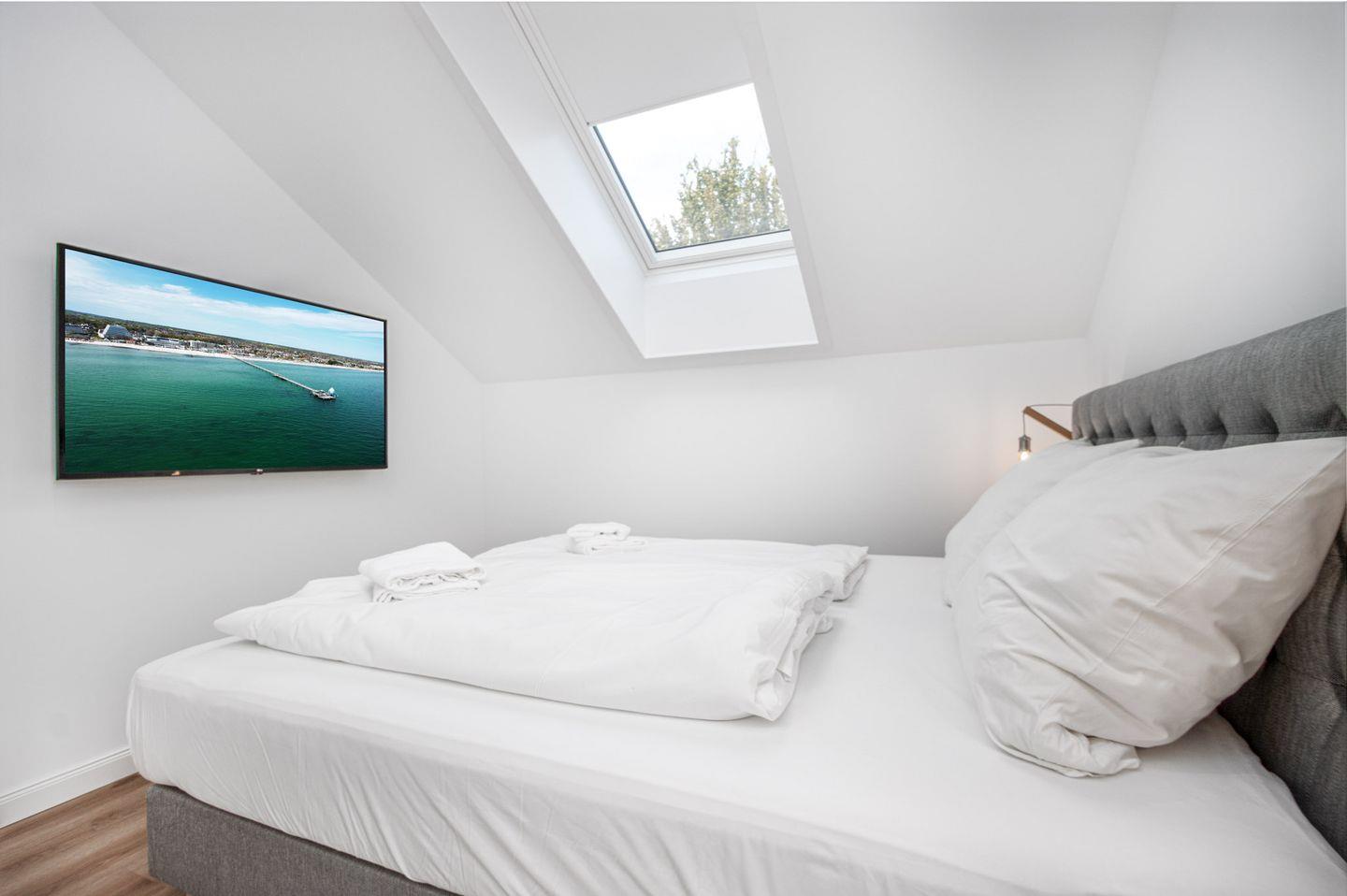 Das Schlafzimmer ist eine wahre Oase der Entspannung, mit einem luxuriösen Boxspringbett, das Ihnen himmlische Nächte verspricht. Ein Smart-TV und Verdunkelungsgardinen sorgen für zusätzlichen Komfort und Privatsphäre.