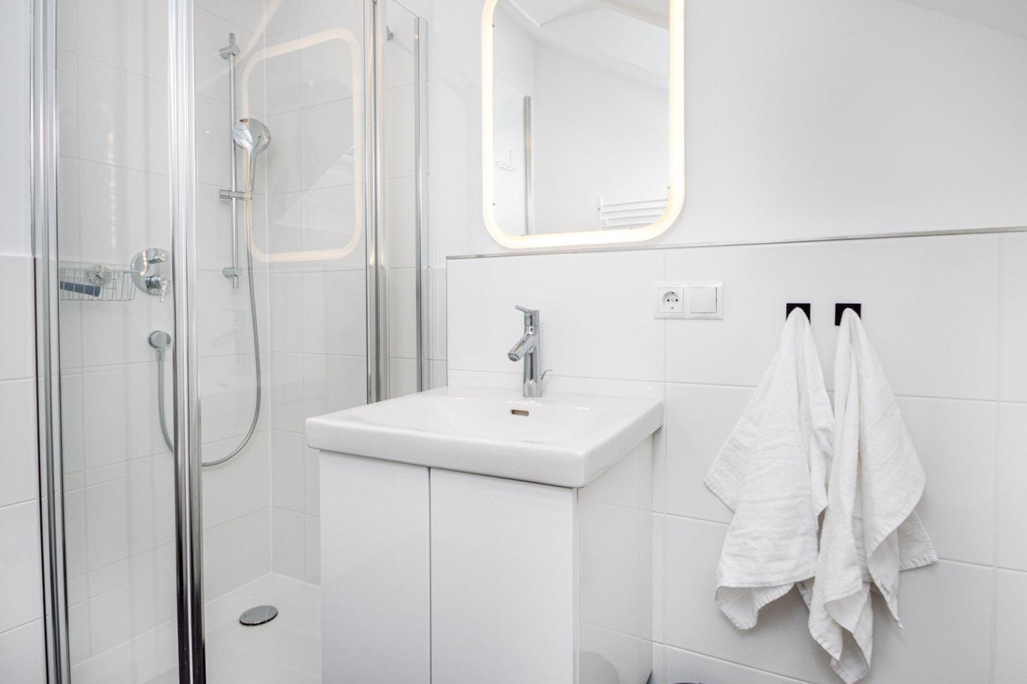 Das Badezimmer ist ein Ort der Erfrischung, ausgestattet mit einer großzügigen Echtglas-Duschkabine mit Rainshower-Funktion, einem stilvollen Waschtisch und einem beleuchteten Spiegel.